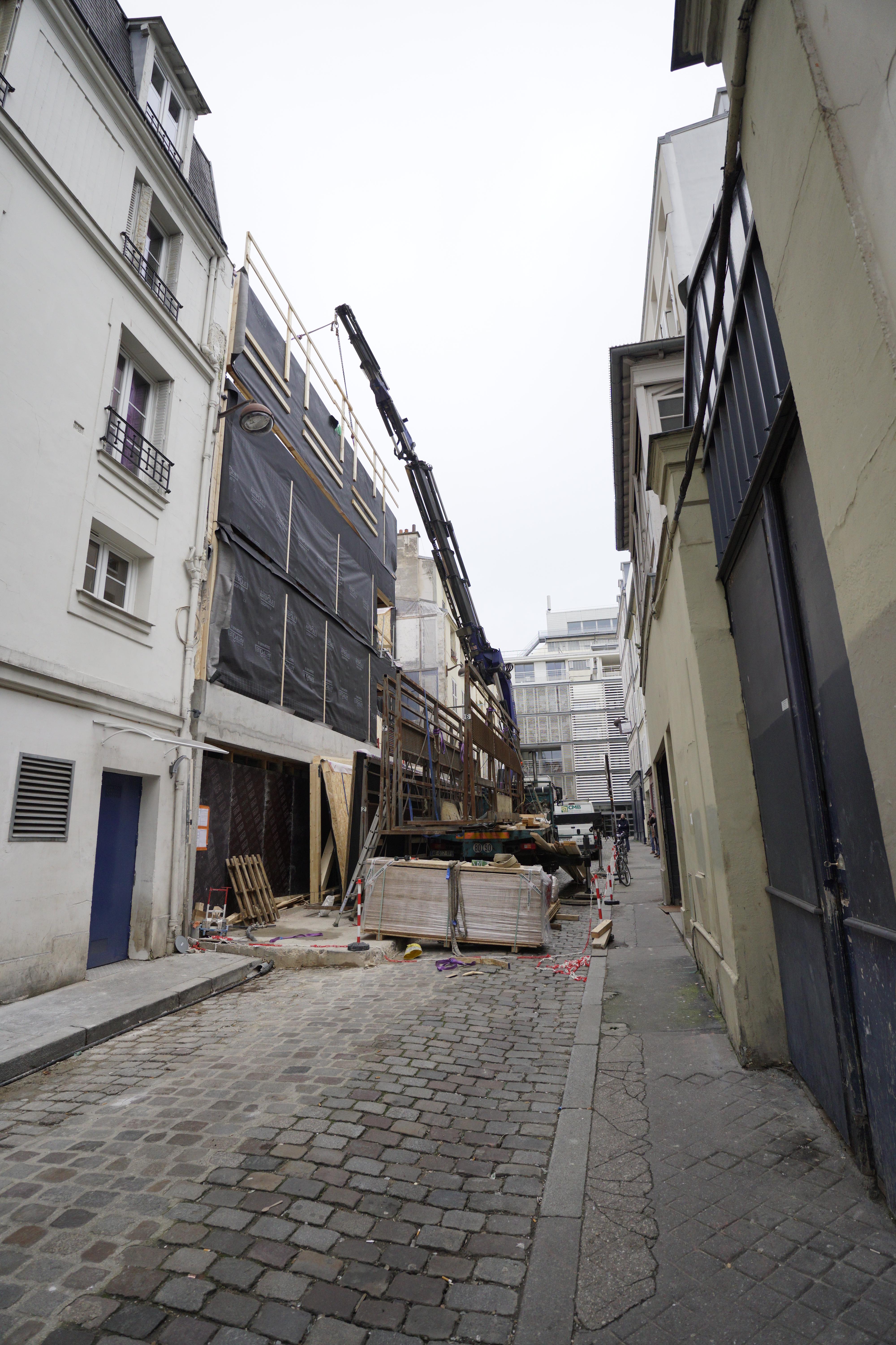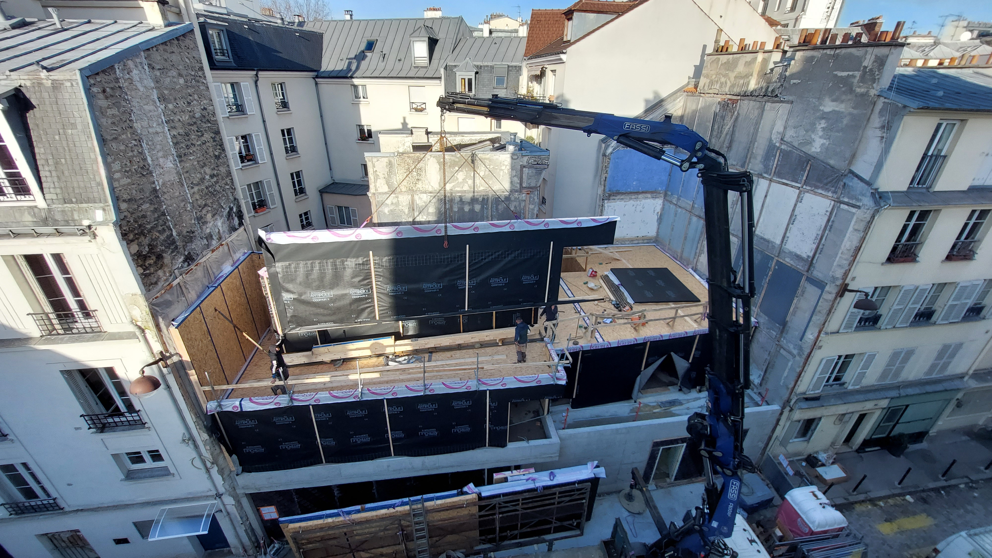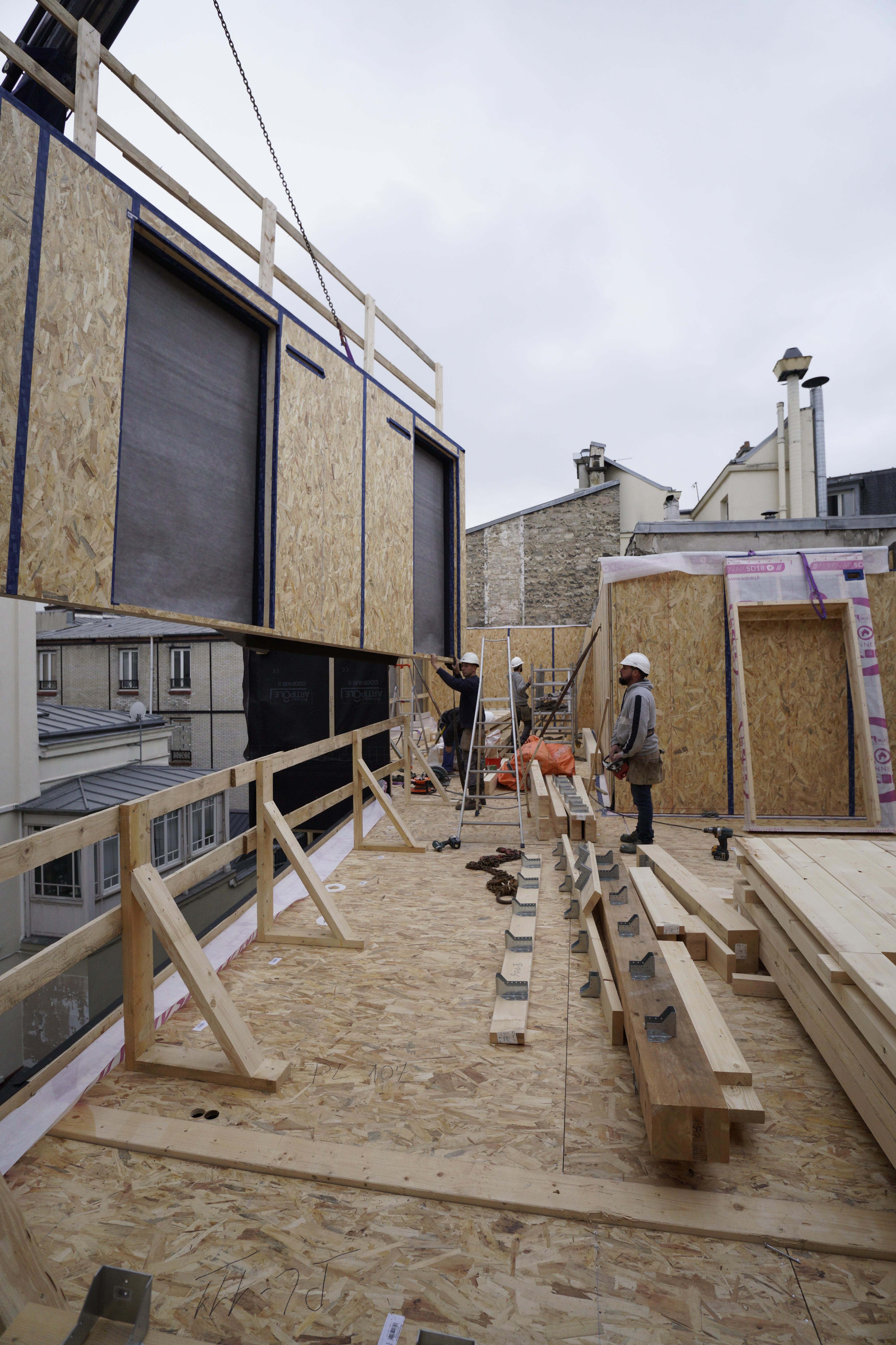 Approche environnementale : Particulièrement adaptée à l’exiguïté de la parcelle et aux contraintes d’accès, une structure de planchers et murs en ossature bois se pose sur un socle de béton qui s’exprime en façade et reprend l’alignement des RDC artisanaux du passage. Entre continuité et rupture, les façades développent des écritures distinctes, fenêtres sur allège et enduit à la chaux en continuité du bâtiment voisin, baies toute hauteur et persiennes habillées de liteaux en châtaignier en retrait. Le projet fait la part belle au châtaignier, bois de feuillu largement disponible sur le territoire métropolitain.