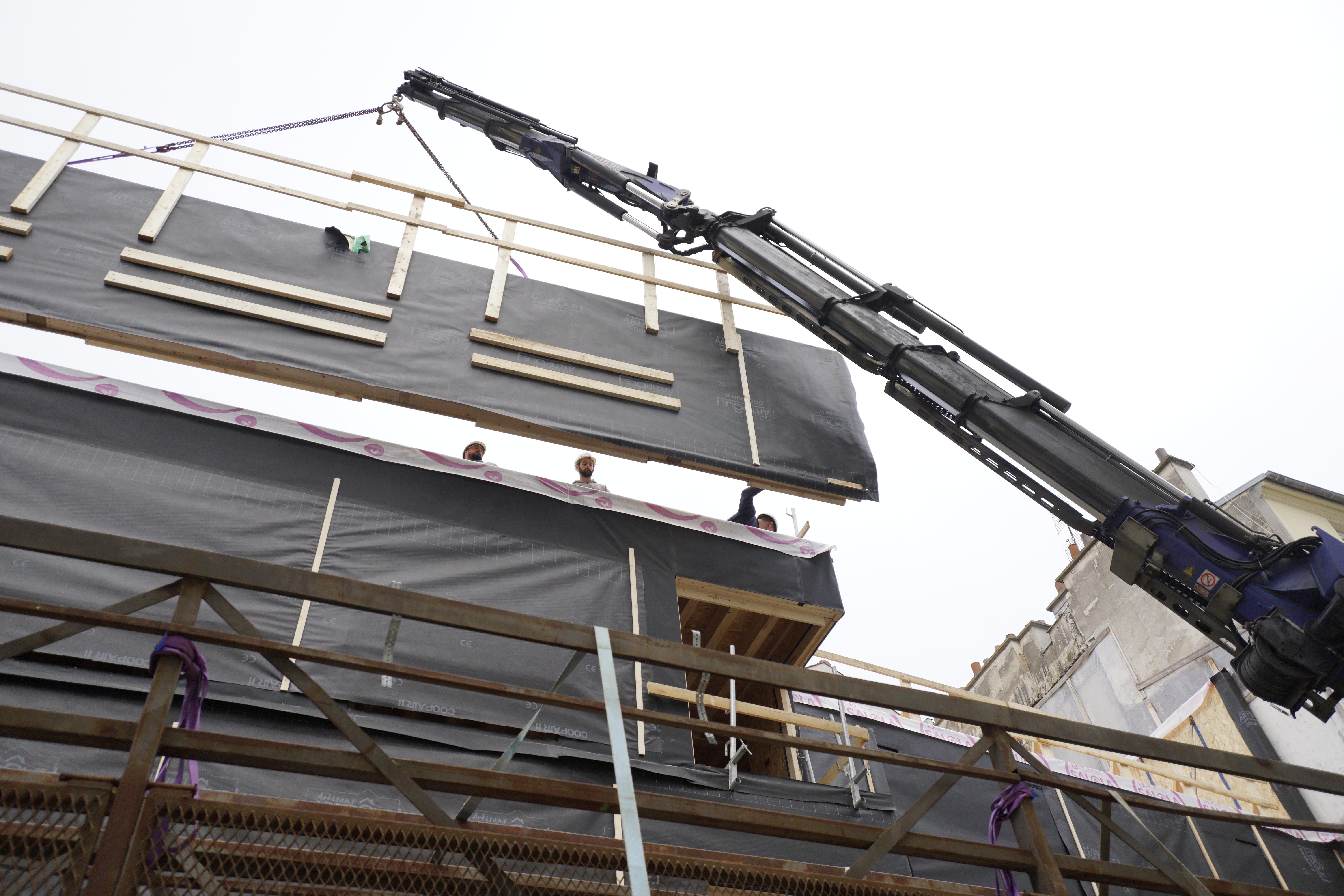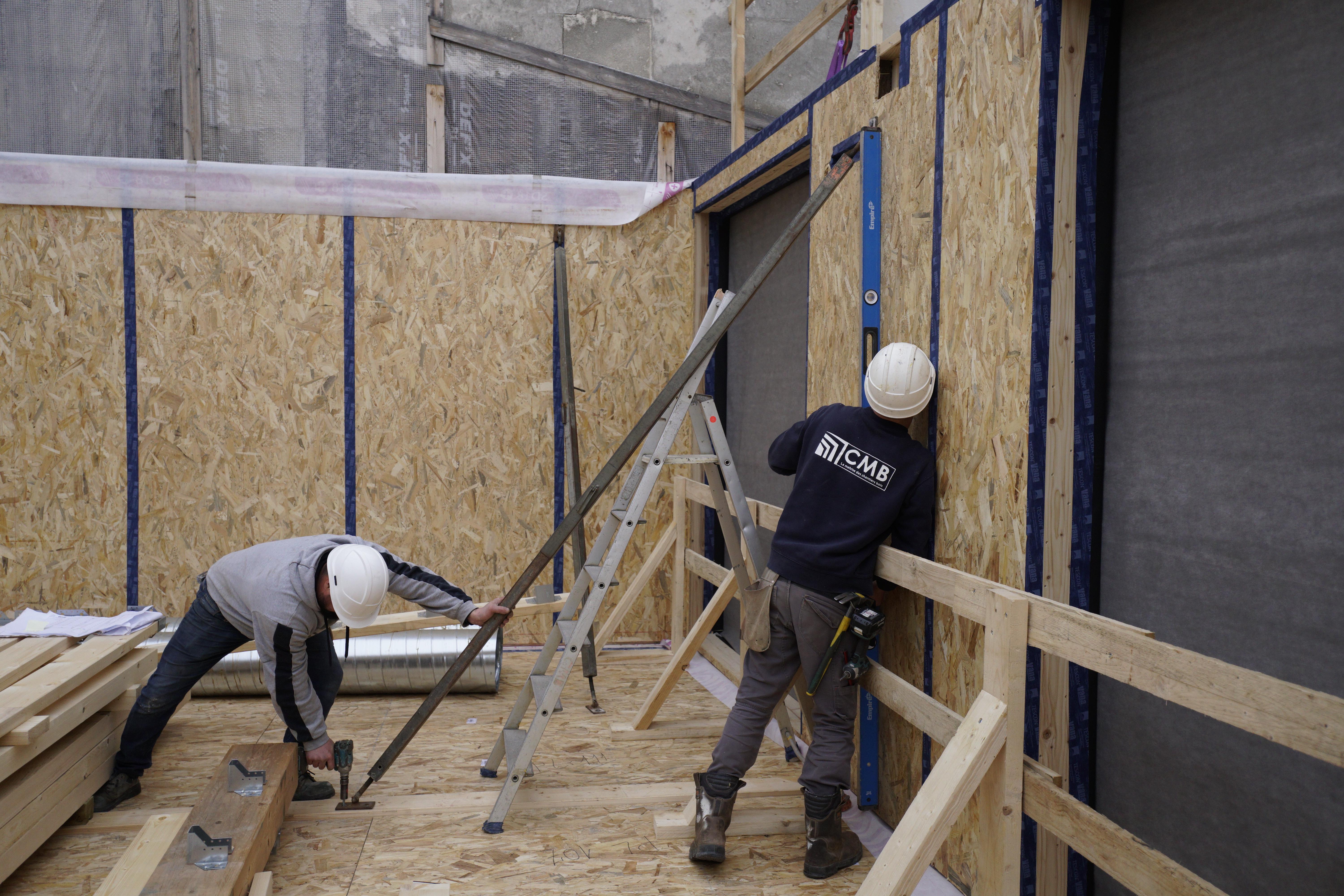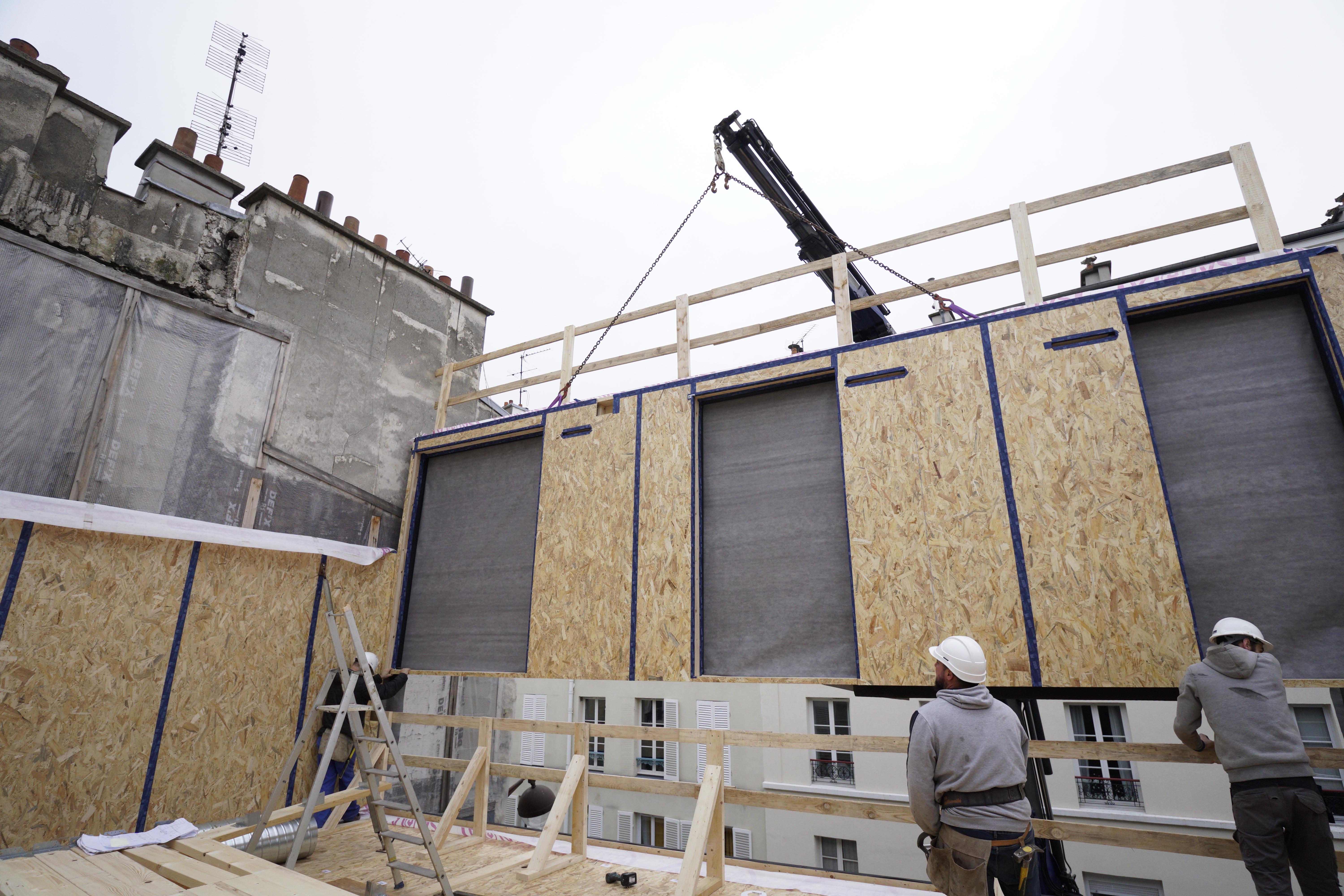 Approche environnementale : Particulièrement adaptée à l’exiguïté de la parcelle et aux contraintes d’accès, une structure de planchers et murs en ossature bois se pose sur un socle de béton qui s’exprime en façade et reprend l’alignement des RDC artisanaux du passage. Entre continuité et rupture, les façades développent des écritures distinctes, fenêtres sur allège et enduit à la chaux en continuité du bâtiment voisin, baies toute hauteur et persiennes habillées de liteaux en châtaignier en retrait. Le projet fait la part belle au châtaignier, bois de feuillu largement disponible sur le territoire métropolitain.