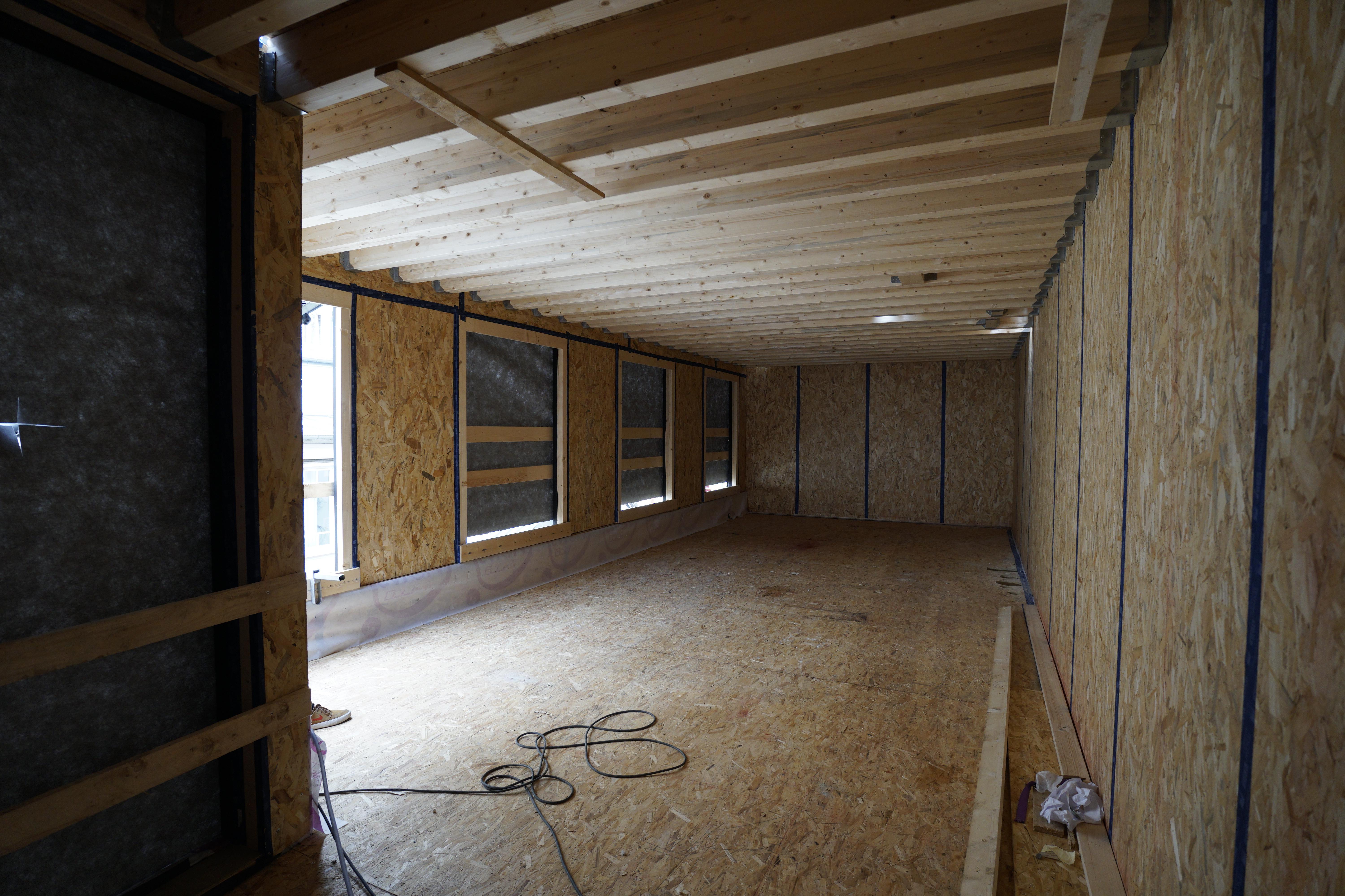 Descriptif technique : Charpente bois (mur, planchers, toiture) au dessus d’un socle béton RDC Façade / Mur : Ossature : 20.6 m3 OSB sur ossature : 13 m3 Fibre de bois : 2.8 m3 Bardage et volets persiennes Châtaignier : 1.3 m3 Plancher : Structure plancher : 13 m3 OSB plancher : 6 m3 Toiture : Charpente : 3m3 Escaliers Hêtre Menuiseries Mélèze de chez Bieber Couverture Zinc naturel à joints debouts