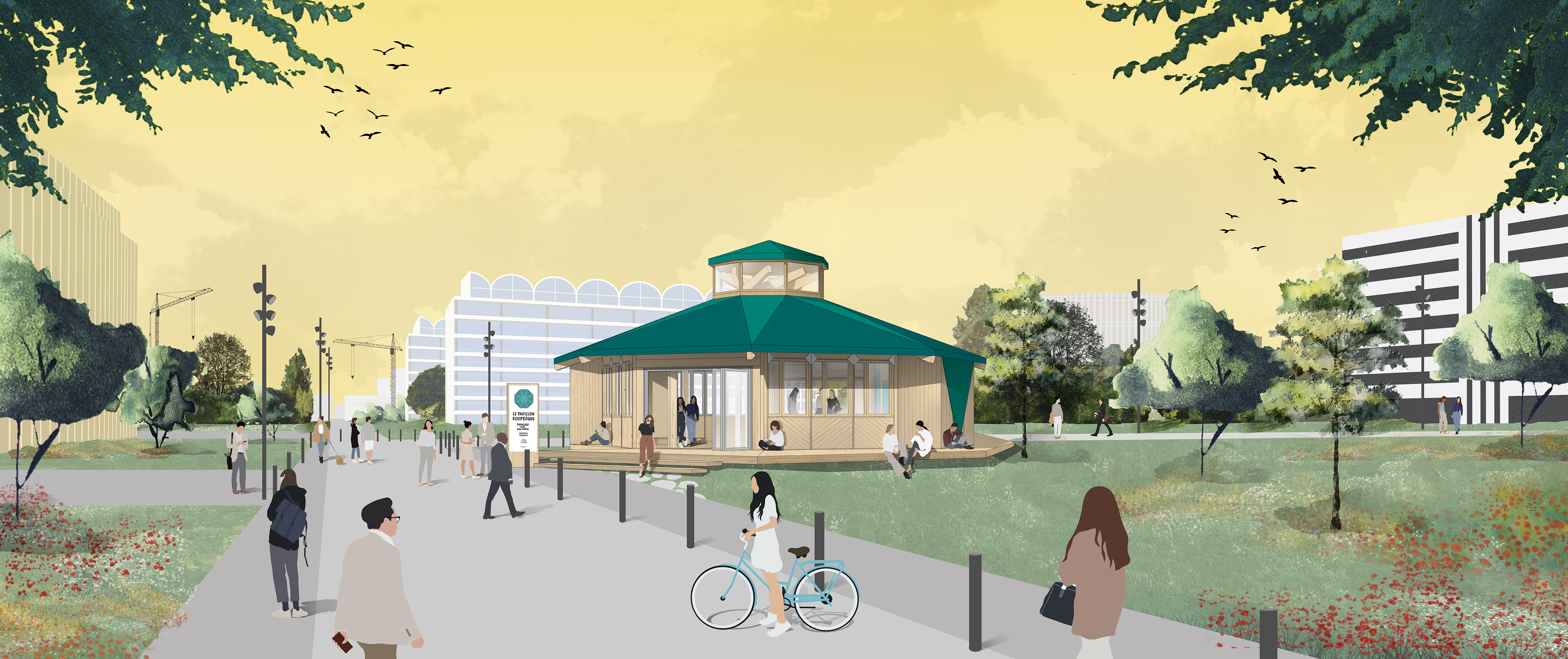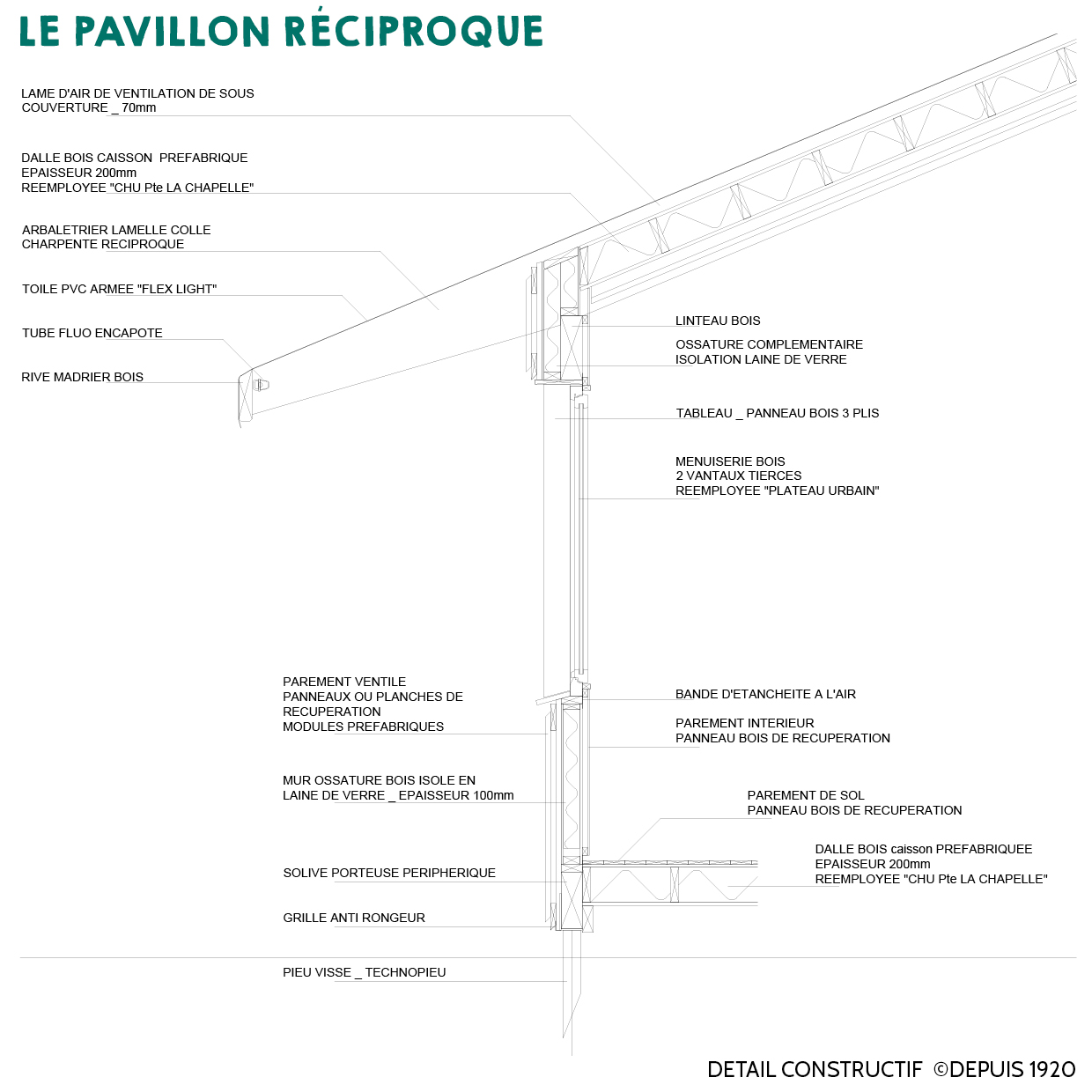 Approche environnementale : Co-conçu pour 2 ans dans un cadre réglementaire peu contraint, la thermique du pavillon est bioclimatique grâce à son orientation, la présence de la lumière naturelle et de protections solaires estivales en débords de toiture. Il est réversible, sans restructuration ni bétonisation du sol naturel qui est une terre fertile. Dès le chantier, le pavillon a été réalisé en écoconstruction avec des matériaux biosourcés ou issus du réemploi en filière régionale. L’ouvrage a été co-construit avec des compagnon.ne.s en insertion professionnelle et des bénévoles durant deux semaines participatives.