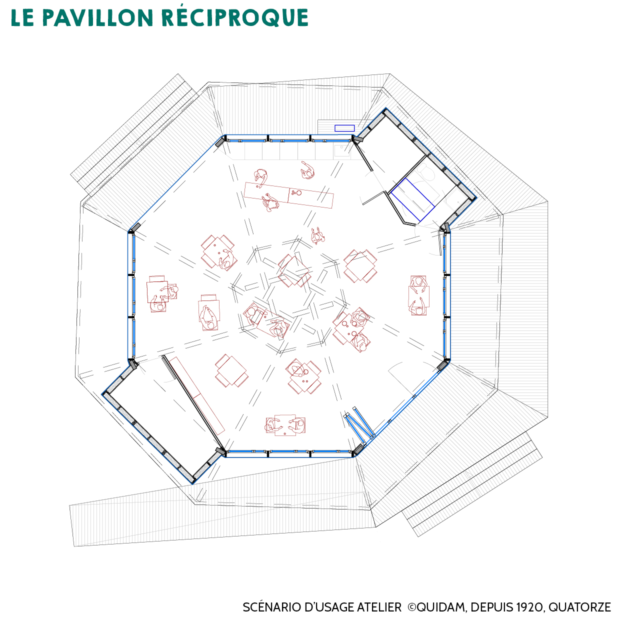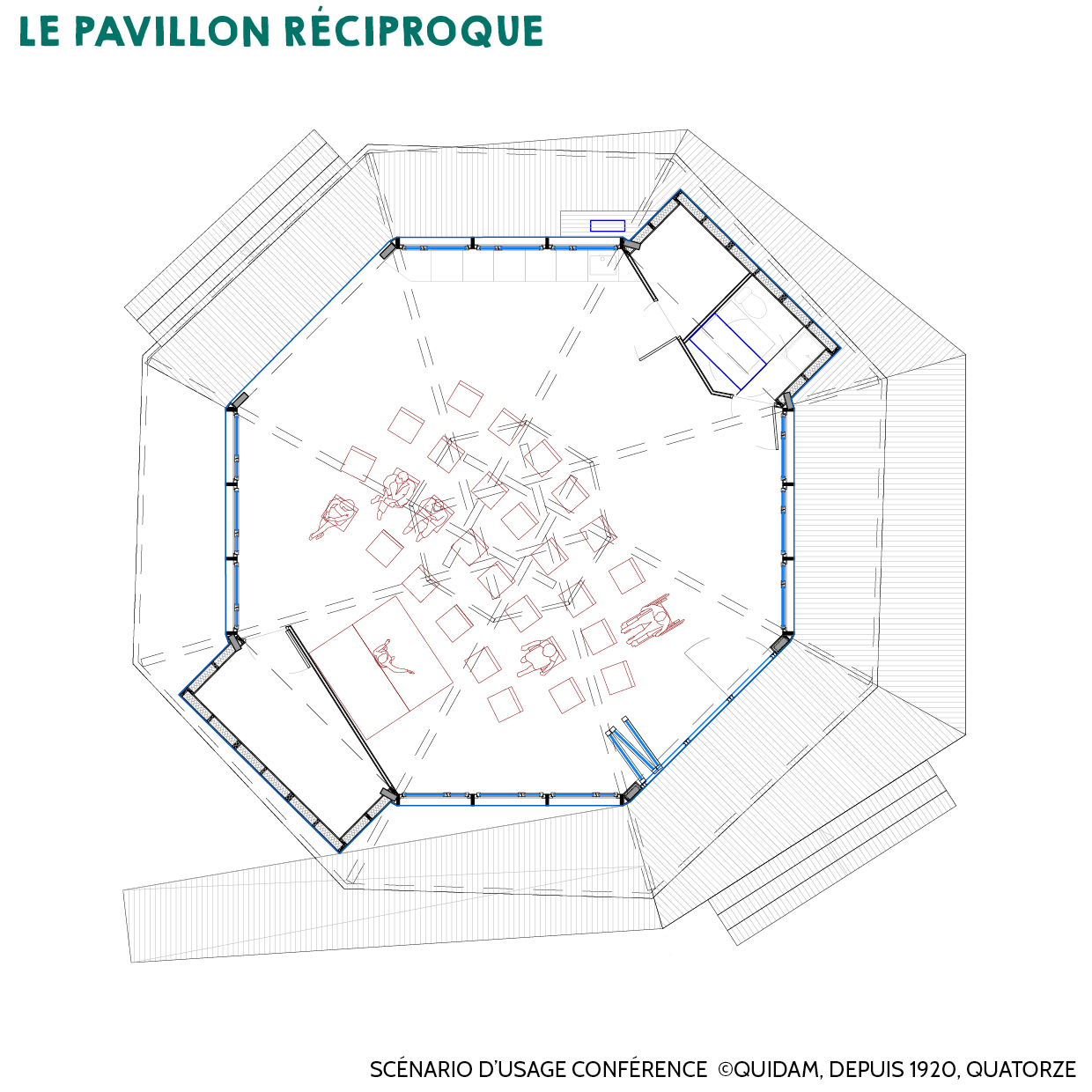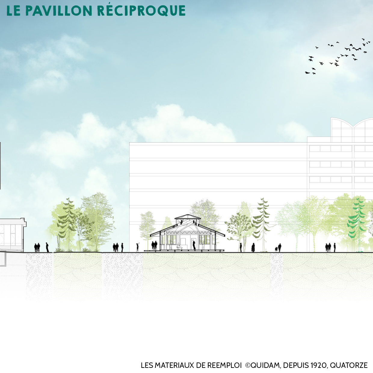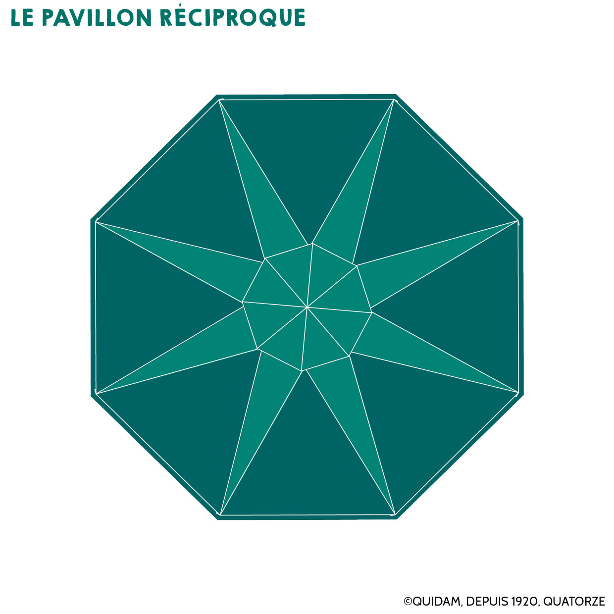 Le Pavillon Réciproque est situé place Marguerite Perey au cœur du campus urbain de Saclay. Accessible de toutes parts par ses usagers, il peut accueillir des événements festifs et des temps publics variés. Vu de l'extérieur, son volume emprunte au kiosque à musique tandis qu’à l’intérieur son plan octogonal révèle une charpente réciproque surmontée d’un lanterneau. D’une hauteur totale de 7,8m et d’un diamètre intérieur de 10,5m, il est construit principalement en bois et avec des matériaux issus de filières de réemploi. Sa surface intérieure est doublée par des terrasses extérieures.