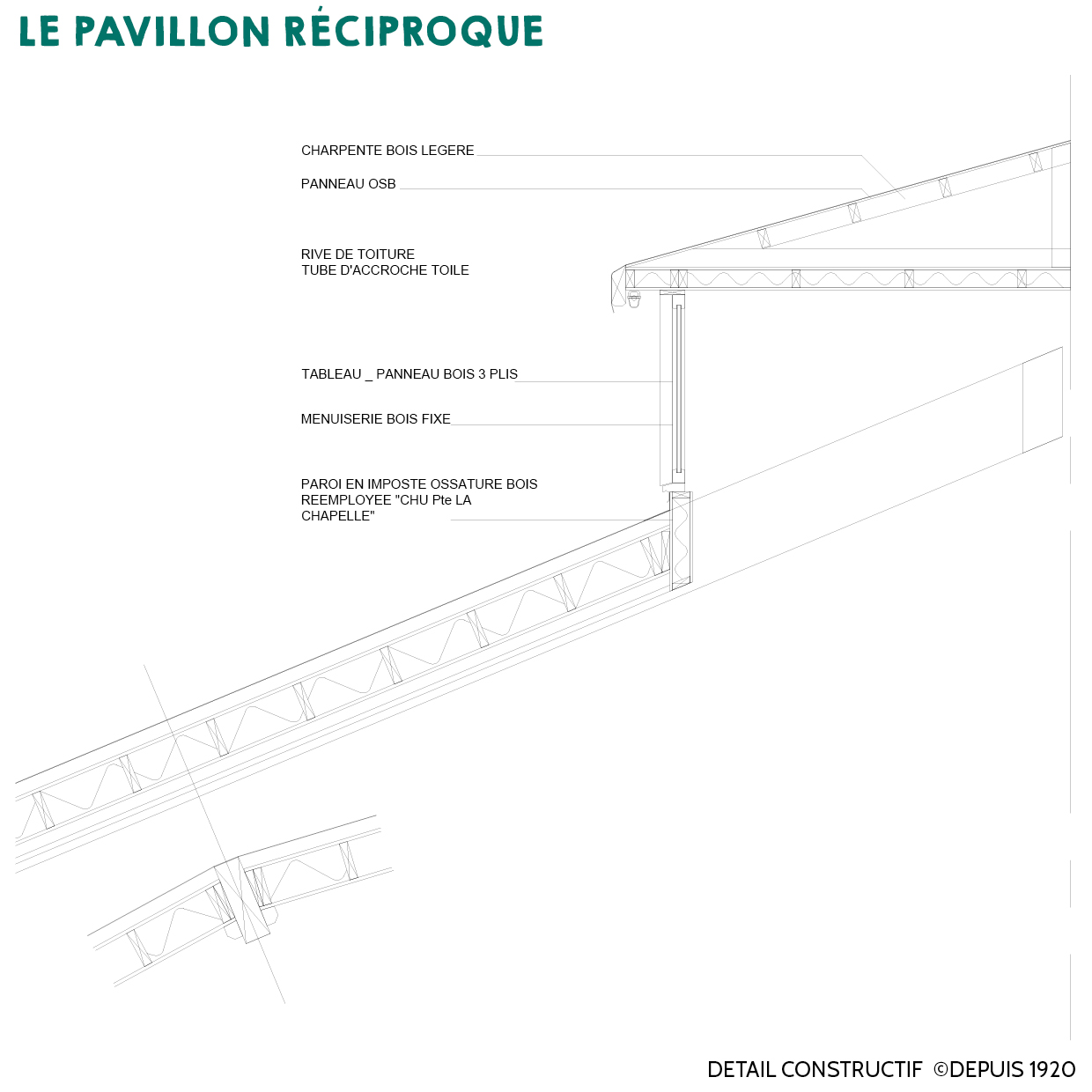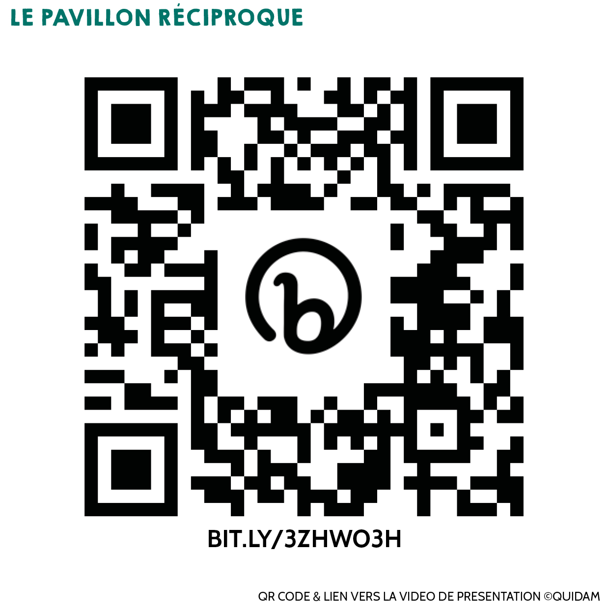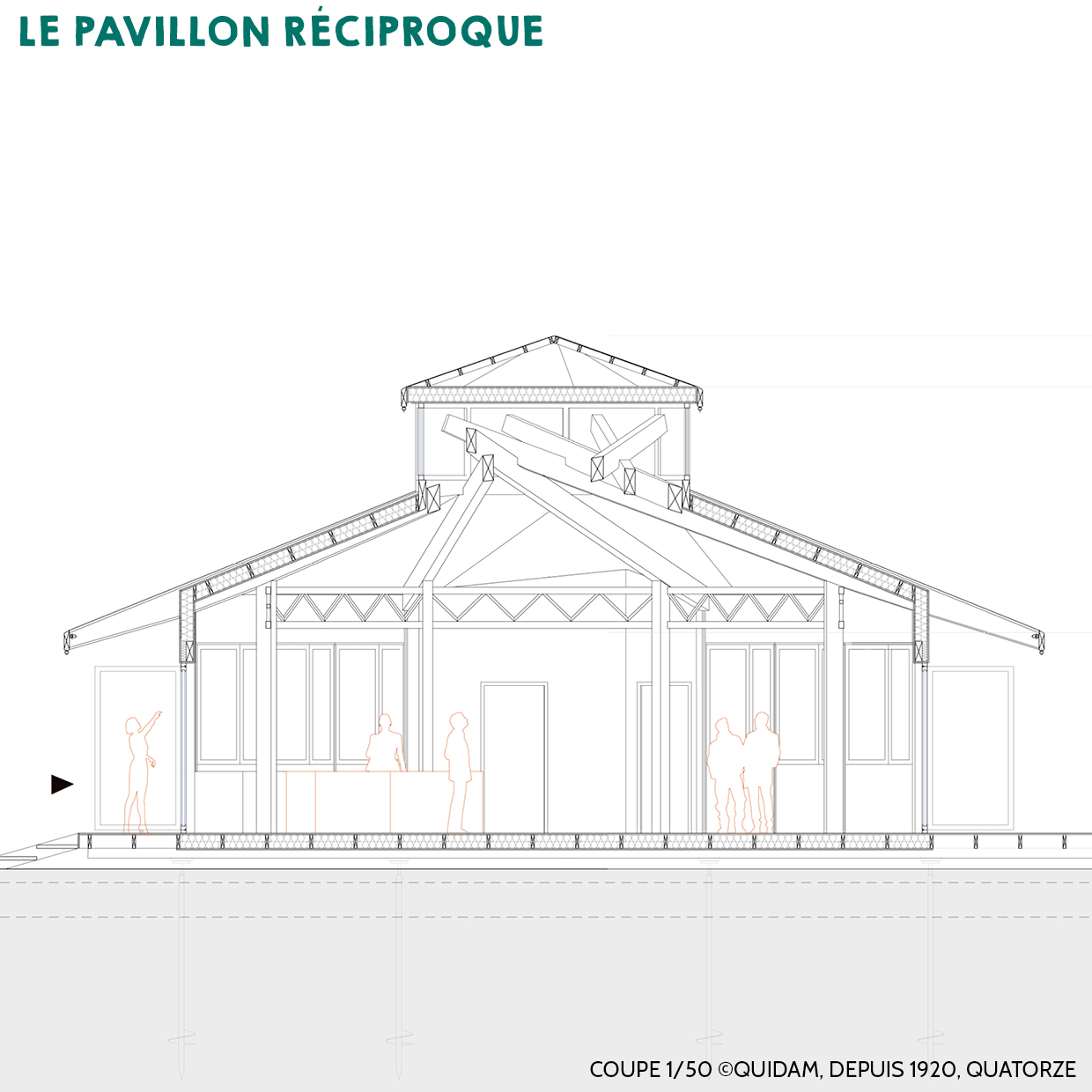 Le Pavillon Réciproque est situé place Marguerite Perey au cœur du campus urbain de Saclay. Accessible de toutes parts par ses usagers, il peut accueillir des événements festifs et des temps publics variés. Vu de l'extérieur, son volume emprunte au kiosque à musique tandis qu’à l’intérieur son plan octogonal révèle une charpente réciproque surmontée d’un lanterneau. D’une hauteur totale de 7,8m et d’un diamètre intérieur de 10,5m, il est construit principalement en bois et avec des matériaux issus de filières de réemploi. Sa surface intérieure est doublée par des terrasses extérieures.