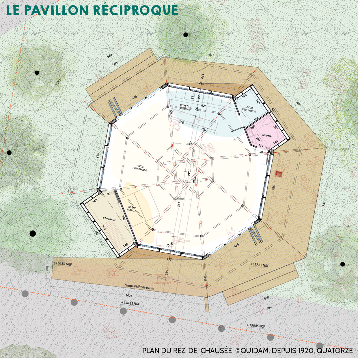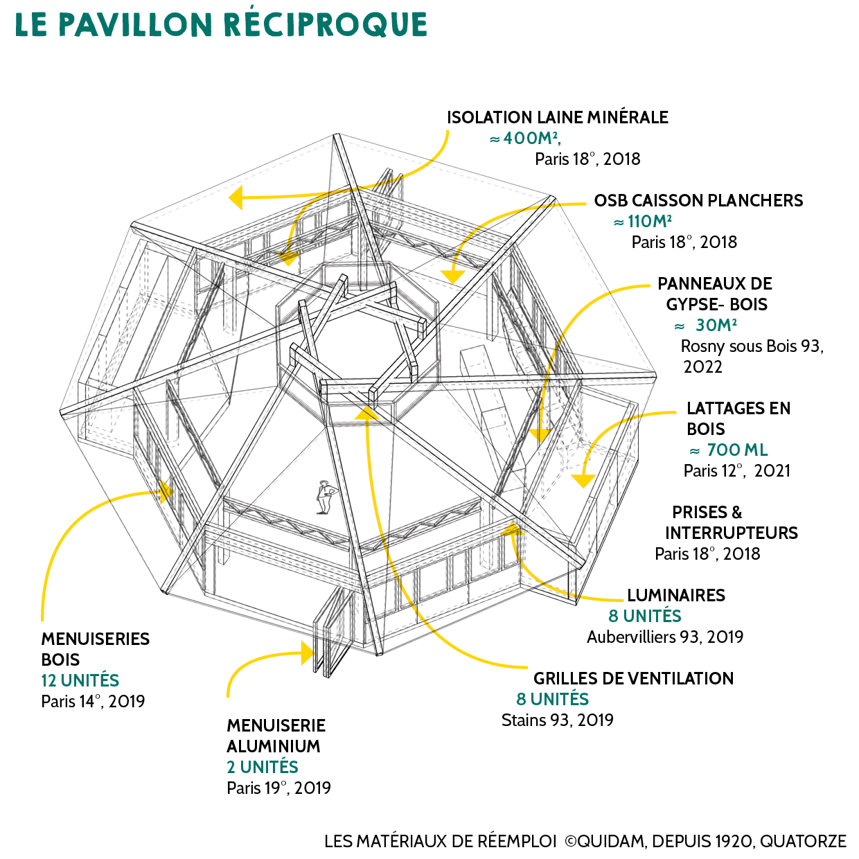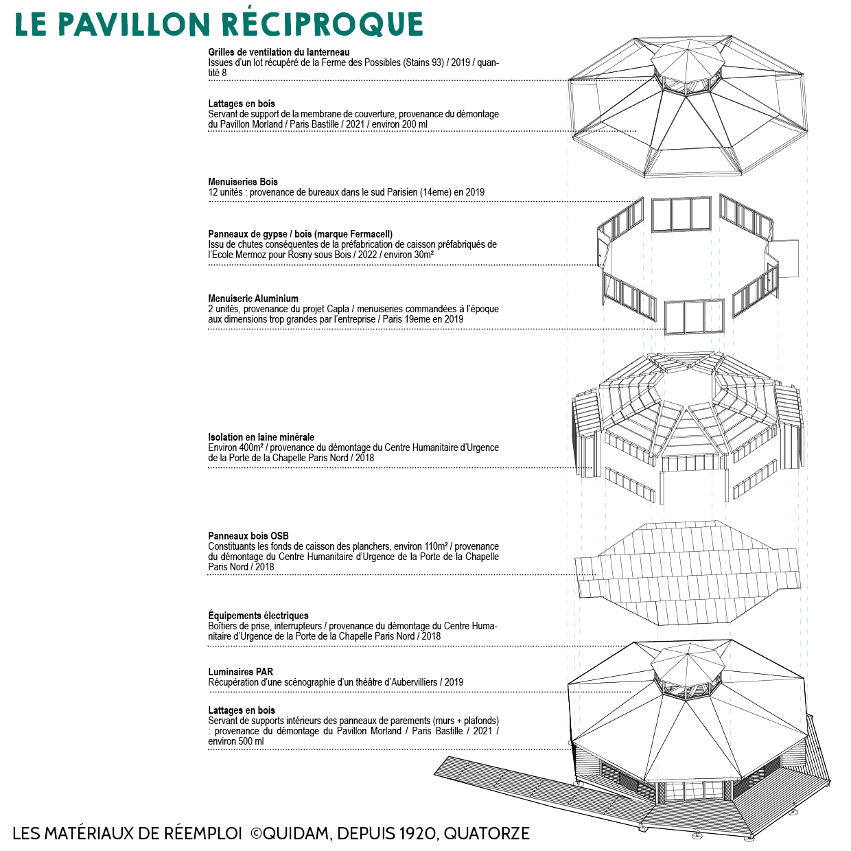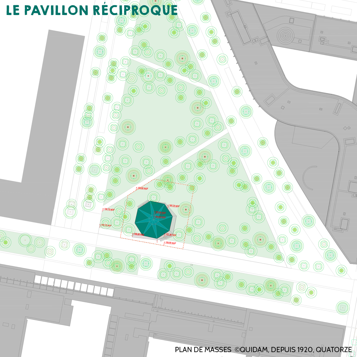 Le Pavillon Réciproque est situé place Marguerite Perey au cœur du campus urbain de Saclay. Accessible de toutes parts par ses usagers, il peut accueillir des événements festifs et des temps publics variés. Vu de l'extérieur, son volume emprunte au kiosque à musique tandis qu’à l’intérieur son plan octogonal révèle une charpente réciproque surmontée d’un lanterneau. D’une hauteur totale de 7,8m et d’un diamètre intérieur de 10,5m, il est construit principalement en bois et avec des matériaux issus de filières de réemploi. Sa surface intérieure est doublée par des terrasses extérieures.