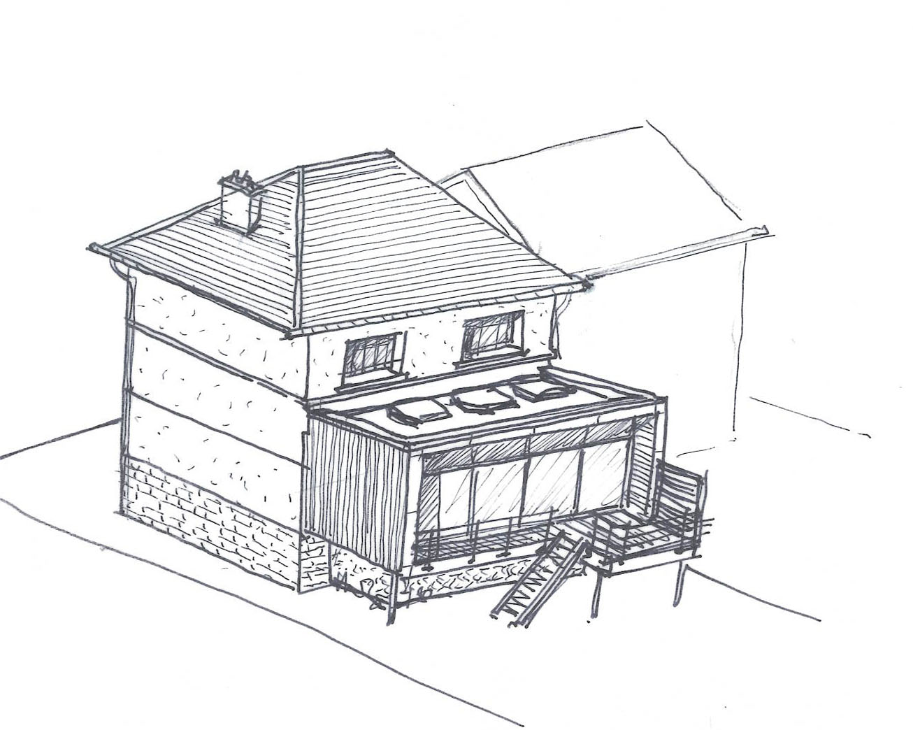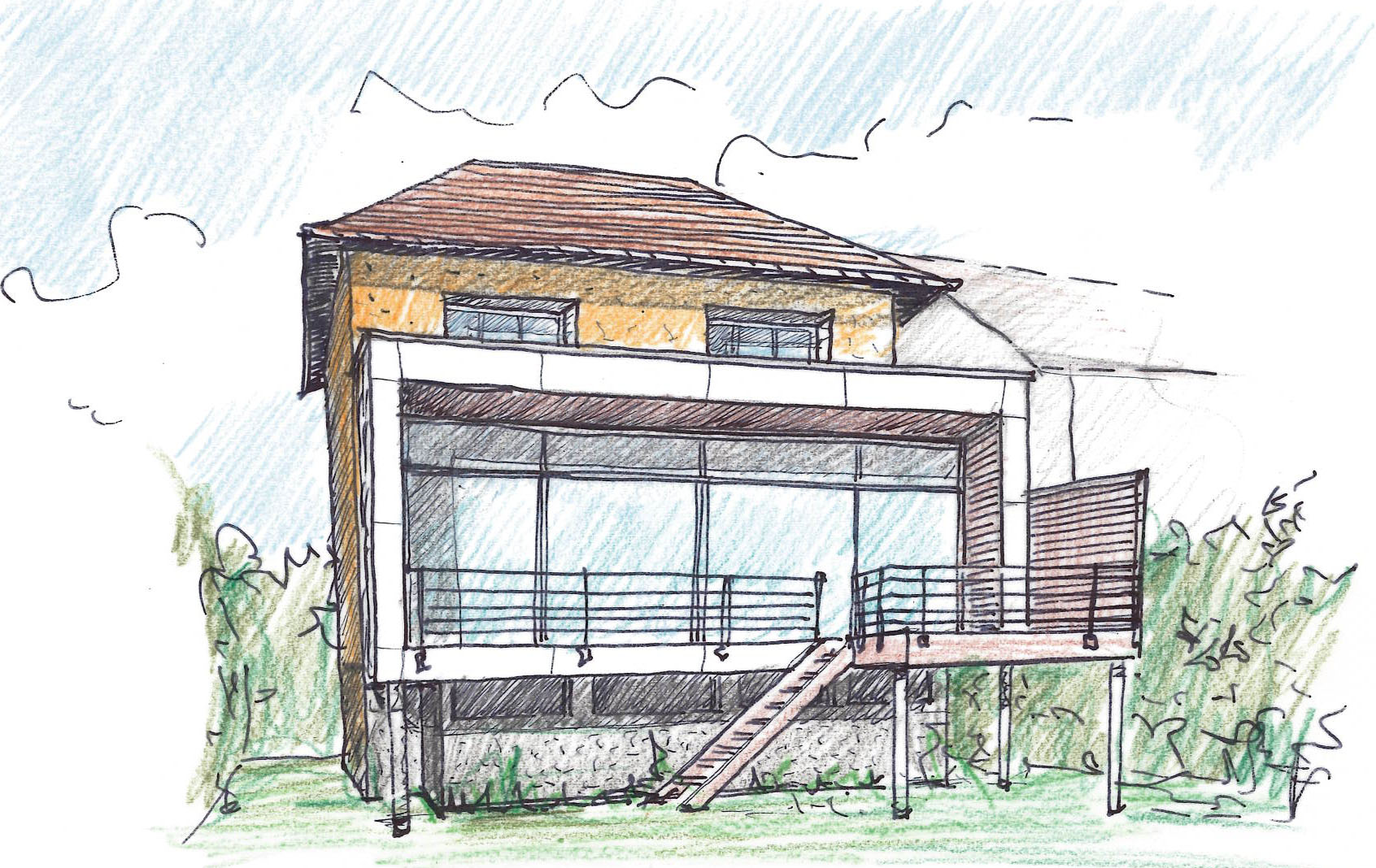 Le projet consiste en la création d'une extension de la maison sur son jardin, sur pilotis. Un nouveau séjour est créé, prolongé par une terrasse en surplomb sur le jardin, avec un escalier vers une terrasse basse dans la jardin.