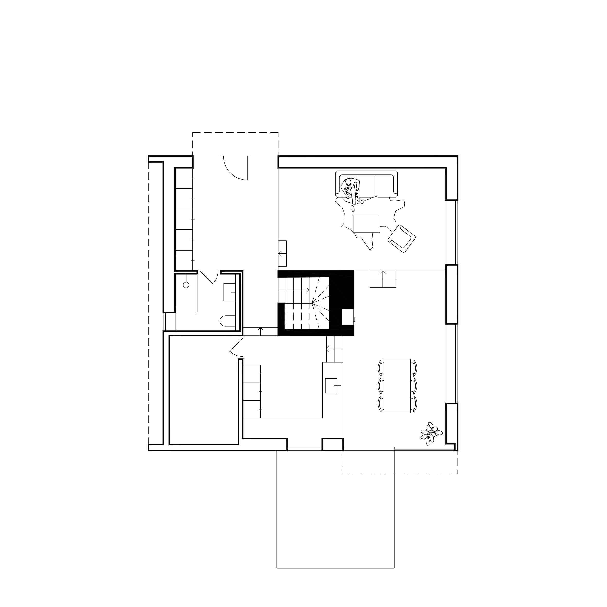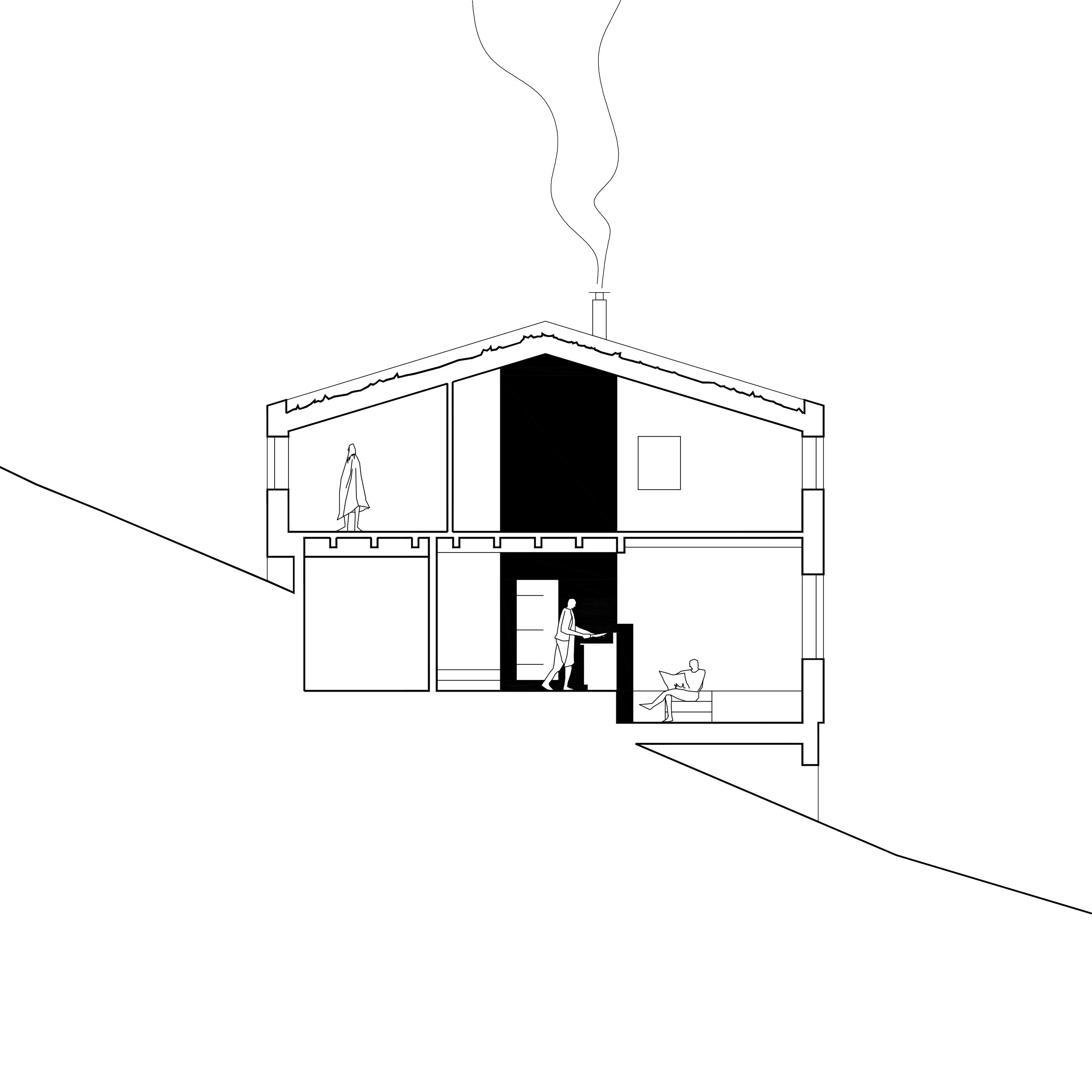 Descriptif technique : Le plancher bas s'échelonne sur 4 niveaux en fonction du terrain naturel. Ces niveaux définissent 4 espaces, l'entrée, le séjour, la salle-à-manger et la cuisine. Ils tournent autour d'une verticalité centrale maçonnée qui accueille l'escalier et le poêle de masse. Centralité géométrique, c'est le cœur du foyer au propre comme au figuré. Cet élément participe à l'inertie de la maison contrebalançant la légèreté des façades et contreventant l'ensemble de la charpente bois. L'agencement des solives supportant le plancher intermédiaire continue la logique de rotation initiée par les 4 espaces principaux. Elles viennent prendre appui par paume et queue d'aronde sur 4 muralières de dimension supérieure qui accentuent la division des espaces, formant un enchevêtrement indéformable.