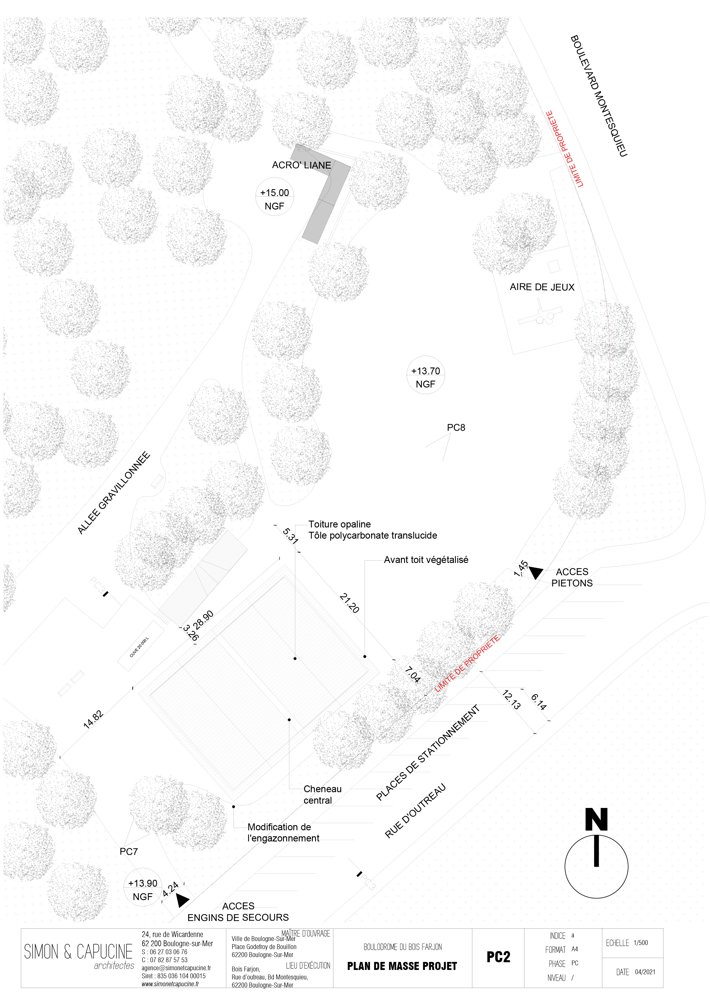 Le boulodrome couvert du bois Farjon, comme son nom l'indique, vient se poser en lisière d'un des poumons vert de la Ville de Boulogne sur mer. A ce titre, il se doit de s'intégrer entre l'urbanisation proche et la nature qui se développe alentours. A l'image de la foret, faite de tronc et de végétaux, l'architecture relie donc la référence de la pergola, faite de petits bois géométriques, avec les branches des arbres alentours.