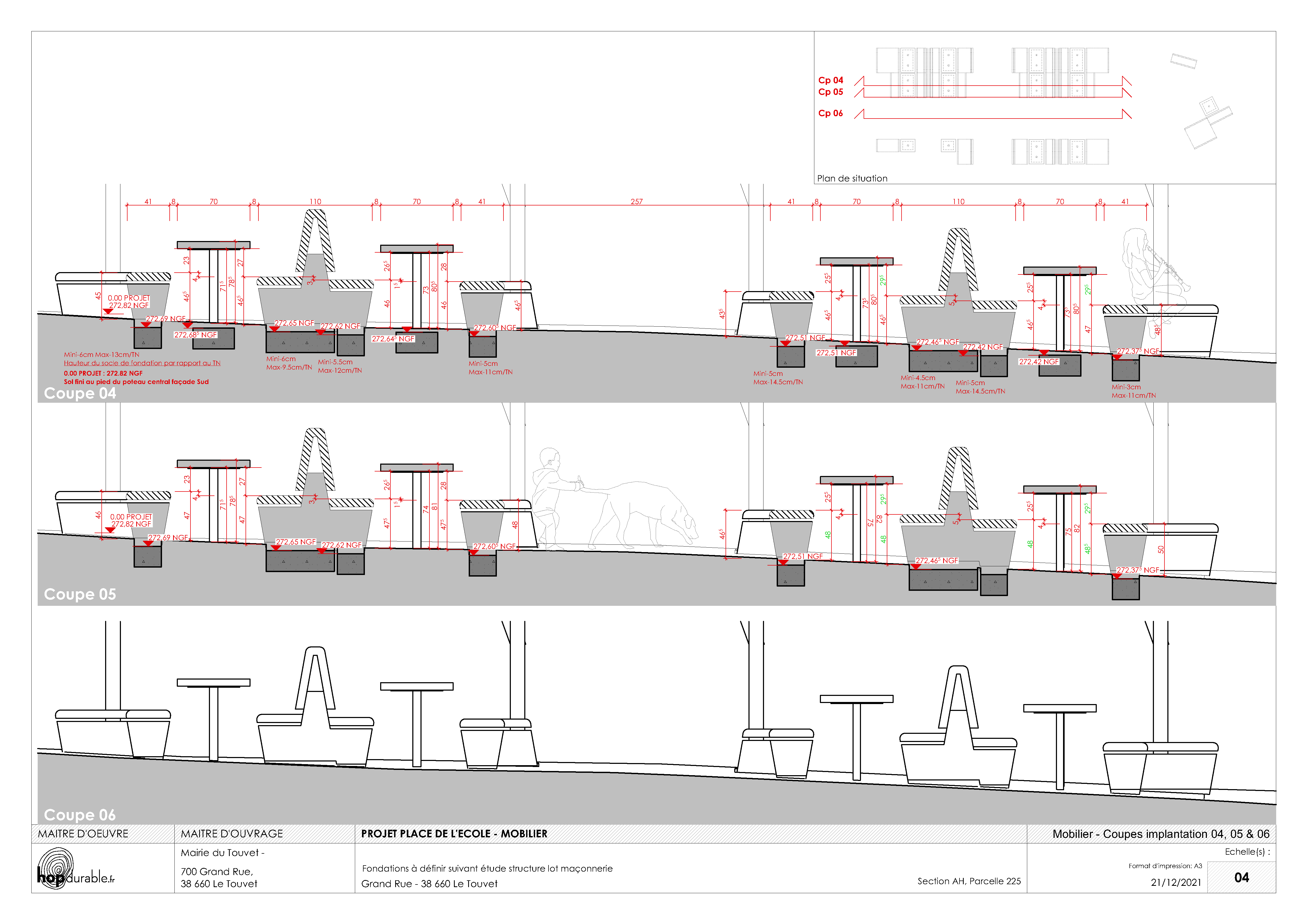 Les 160 m² aménagés sont positionnés en pente en cœur de village entre la mairie et l'école primaire. Les niveaux d'assises et de tables ont donc été finement étudiés. Le dessin (faitage, végétalisation) et le choix des matériaux (ciment prompt moulé / baies de l'école) assurent une cohérence architecturale forte. La conception des assises robinier / prompt / électricité est pointue. L'espace est optimisé afin de pouvoir proposer une offre de restauration ; 2 places accessibles PMR sont aménagées. Les tables en pierres calcaires permettent un entretien facile dans le temps.