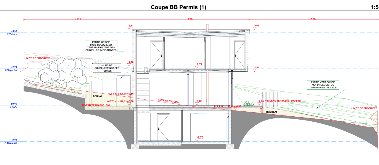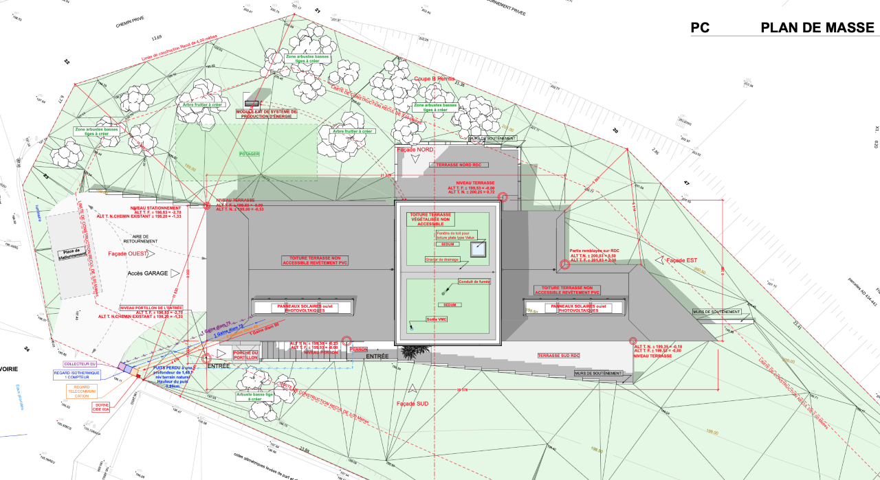 Descriptif technique : Partie enterrée béton et agglomérés associés. Roches calcaires GS du site pour stabilisation terrasses. Global : 75% iso laine de bois, 10% iso laine de roche et 15% iso PU projeté. Le CLT 90% de la surface hors sol + 160mm d’iso BS en mur +résine minérale et 200mm d’iso BS en toiture + membrane PVC + cassettes de sédum. CLT : porte à faux des toitures ép. de 14cm long. plus d’1m, plancher et mur technique reçoivent l’ensemble des réseaux. CLT associé acier : 19 ml IPE 360m encaissé aspect brute verni, rôle de luminaire couvrant 75% des apports du RDC. Gestion des énergies : utilisation d’une VMC DF, une aérothermie, des panneaux photovoltaïques (2024), et âtre. Domotique sobrement utilisée. Produit de finitions huile sur CLT 70%, peinture éco en mur plaque de plâtre 30%.