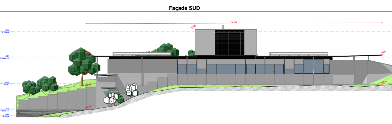 La forme étirée de cet habitat individuel épouse la forme du terrain. Les débords des toitures accentuent la ligne effilée de l'habitation et amènent une certaine légèreté à l’ouvrage. Le bois teinté chaud des débords contraste avec le minéral clair des façades et se dissocie par les lignes de couleur anthracite. La légèreté du mur-rideau horizontal est le fruit de l’association du bois, de l’acier et du verre transparent invitant le regard à discerner un intérieur brut de bois. Un mur minéral de faible hauteur parallèle et déporté du mur-rideau préserve l’intimité des habitants.