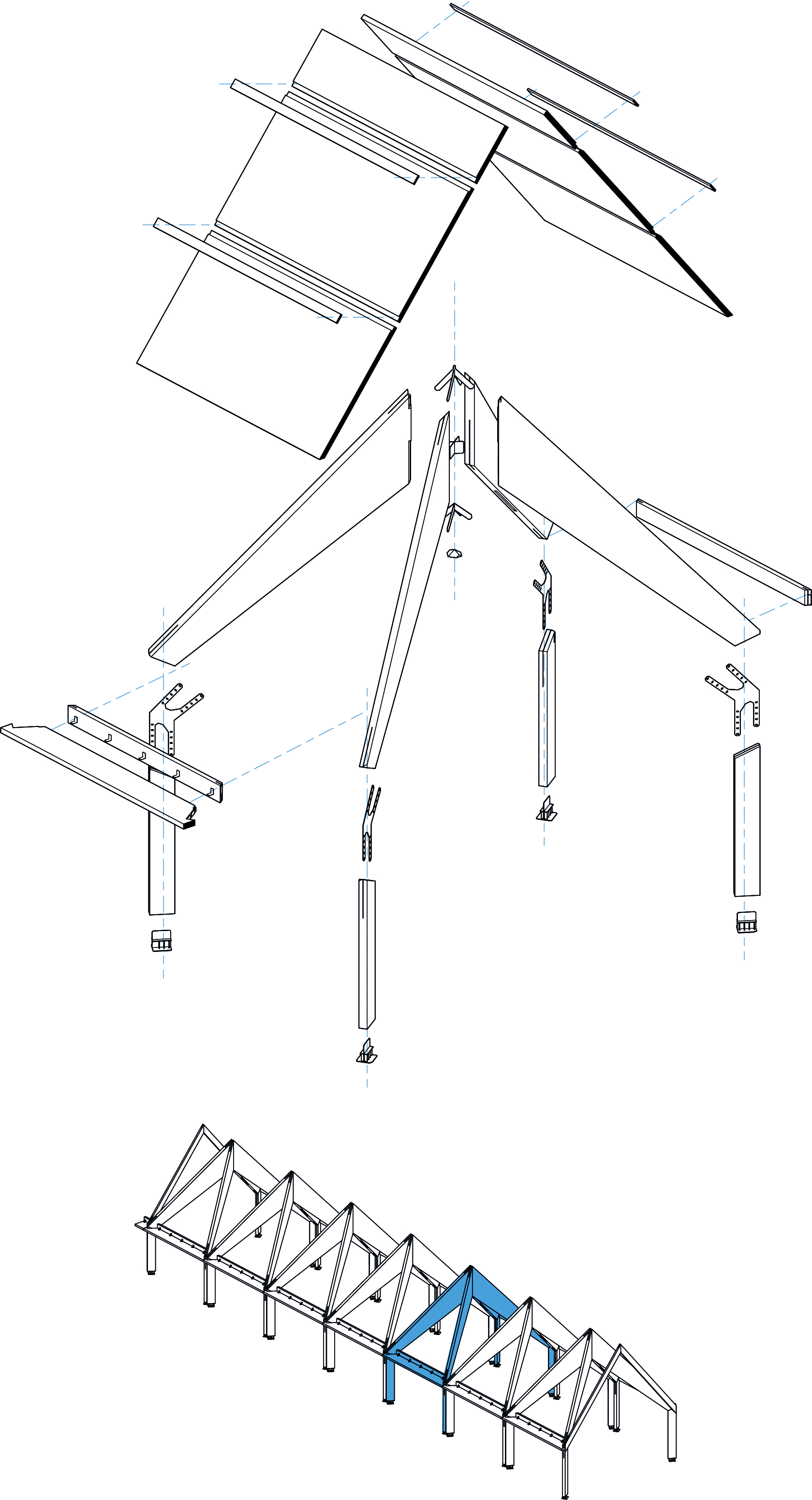 Descriptif technique : La structure en bois massif contrecollé est constituée d’une série de portiques croisés sculpturaux, participant à l’attractivité du lieu. En continuité de la nef décrite, la halle de marché se prolonge dans un volume en double hauteur des immeubles marchands rue C. Desmoulins, le plancher du premier étage des vieilles maisons ayant été supprimé. Les façades des immeubles complétement rénovés sur rue, retrouvent leur cachet authentique, tout en proposant un rez-de-chaussée très transparent. Soubassement en grès, placage en pierre de taille calcaire et brique de réemploi soulignent la mise en valeur de l’architecture 18ème. Poutres lamellé-collé Douglas et toiture CLT Epicéa Eco certifié, ont permis une mise en œuvre rapide et respectueuse des avoisinants sur ce site très enclavé.