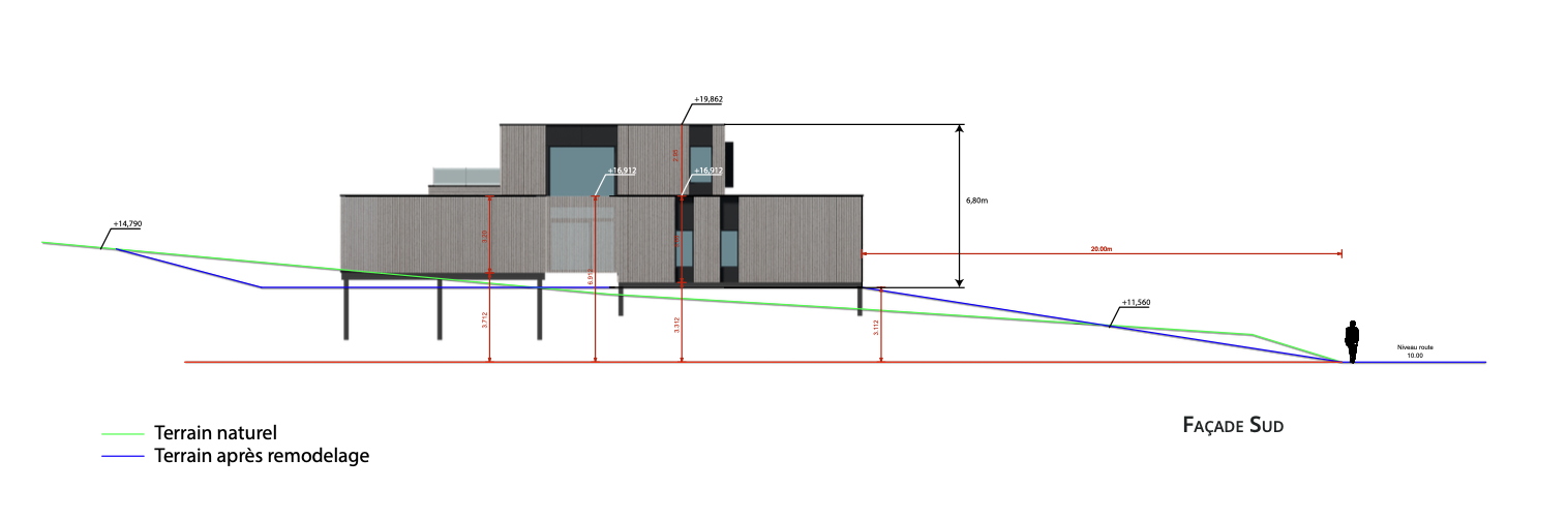 Approche environnementale : Cette réalisation, à travers ses matériaux constitutifs et procédés constructifs, affiche des ambitions claires : matériaux biosourcés (fibre de bois, ouate de cellulose), MOB, poutres en I, fondations sur pieux vissés pour préserver la perméabilité des sols tout en sécurisant les fondations de l'ouvrage.