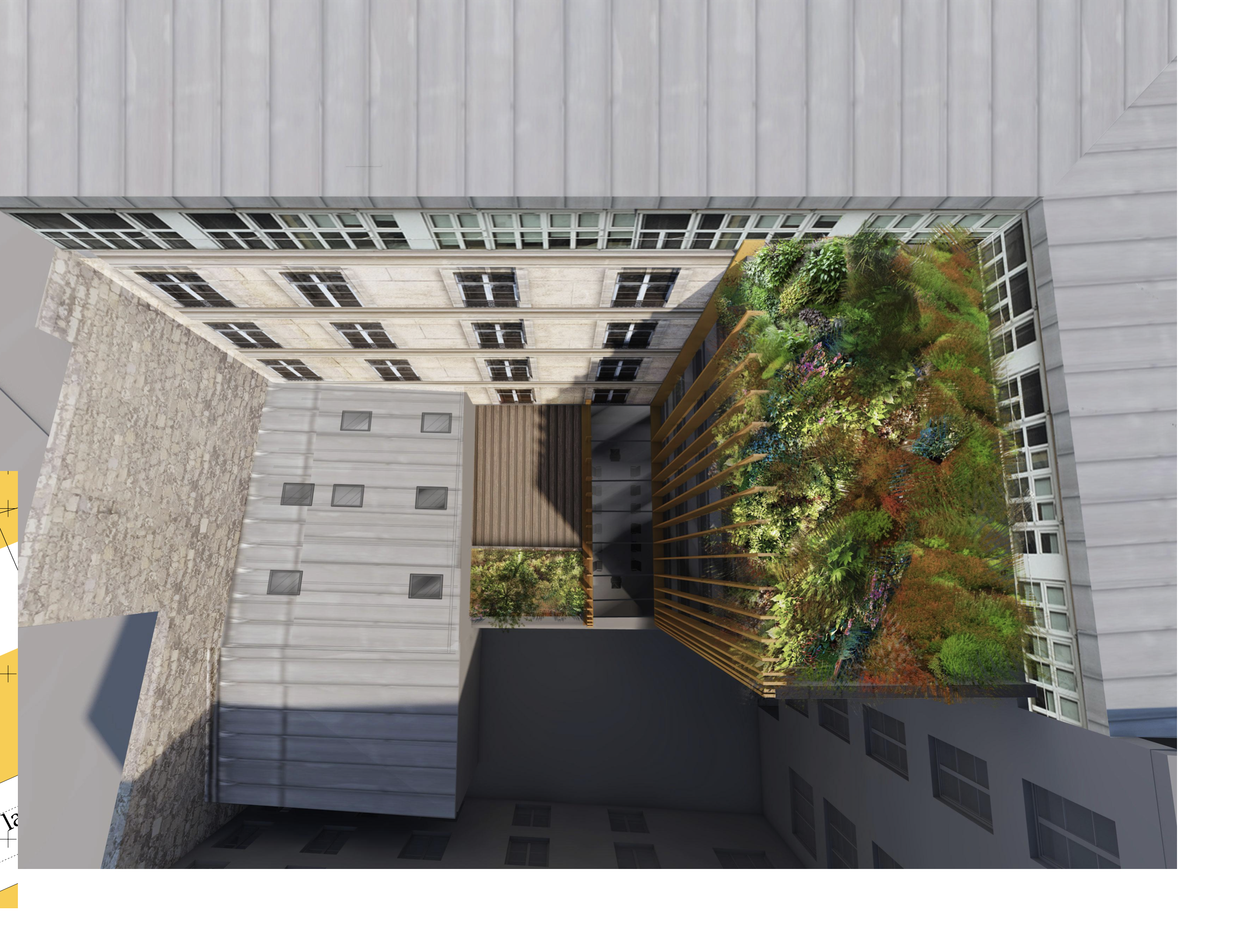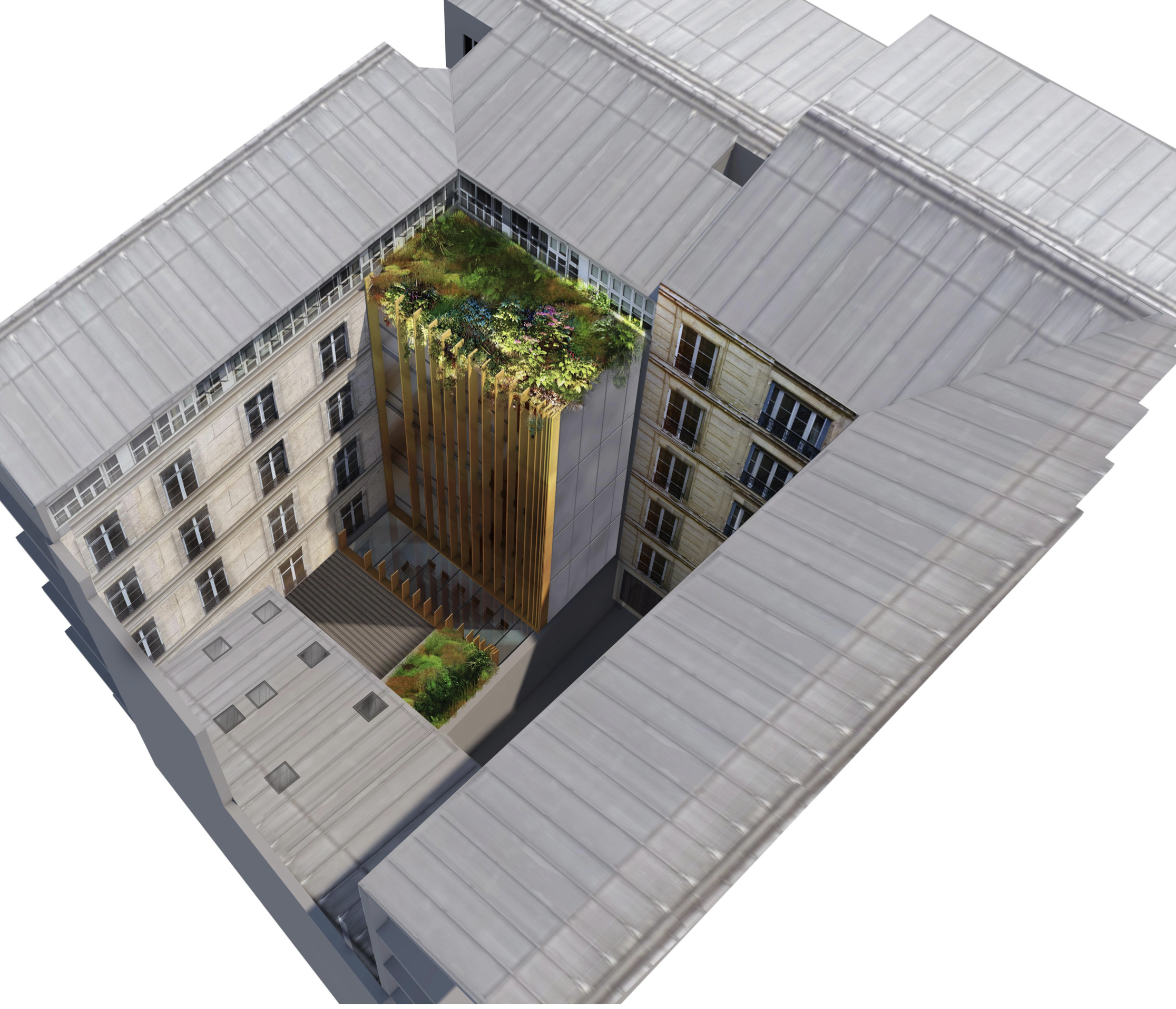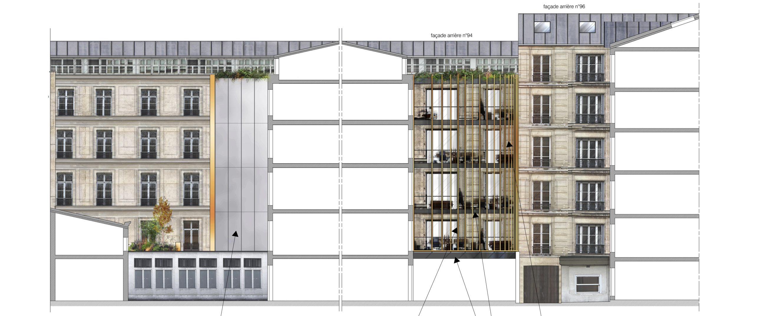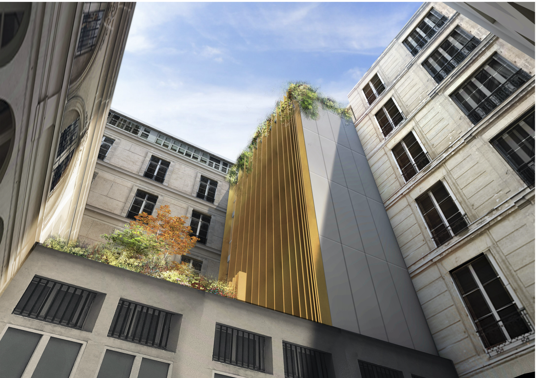 Cette extension est adossée, à un immeuble Haussmannien et partiellement à un mur en pierre de Paris. Les façades haussmanniennes sont préservées et conservées dans leur état actuel. Une "membrane" extérieure transparente leur à été ajouté pour créer les volumes "hors des murs" pour conserver cette façade existante qui est devenue intérieure. Elle ne sont ni doublées ni modifiées, elles sont mises en valeur et protégées par les nouveaux volumes. La couverture de l’extension est végétalisée. Des lames verticales aspect cuivre viennent scander la façade pour créer des brises vues latérales.
