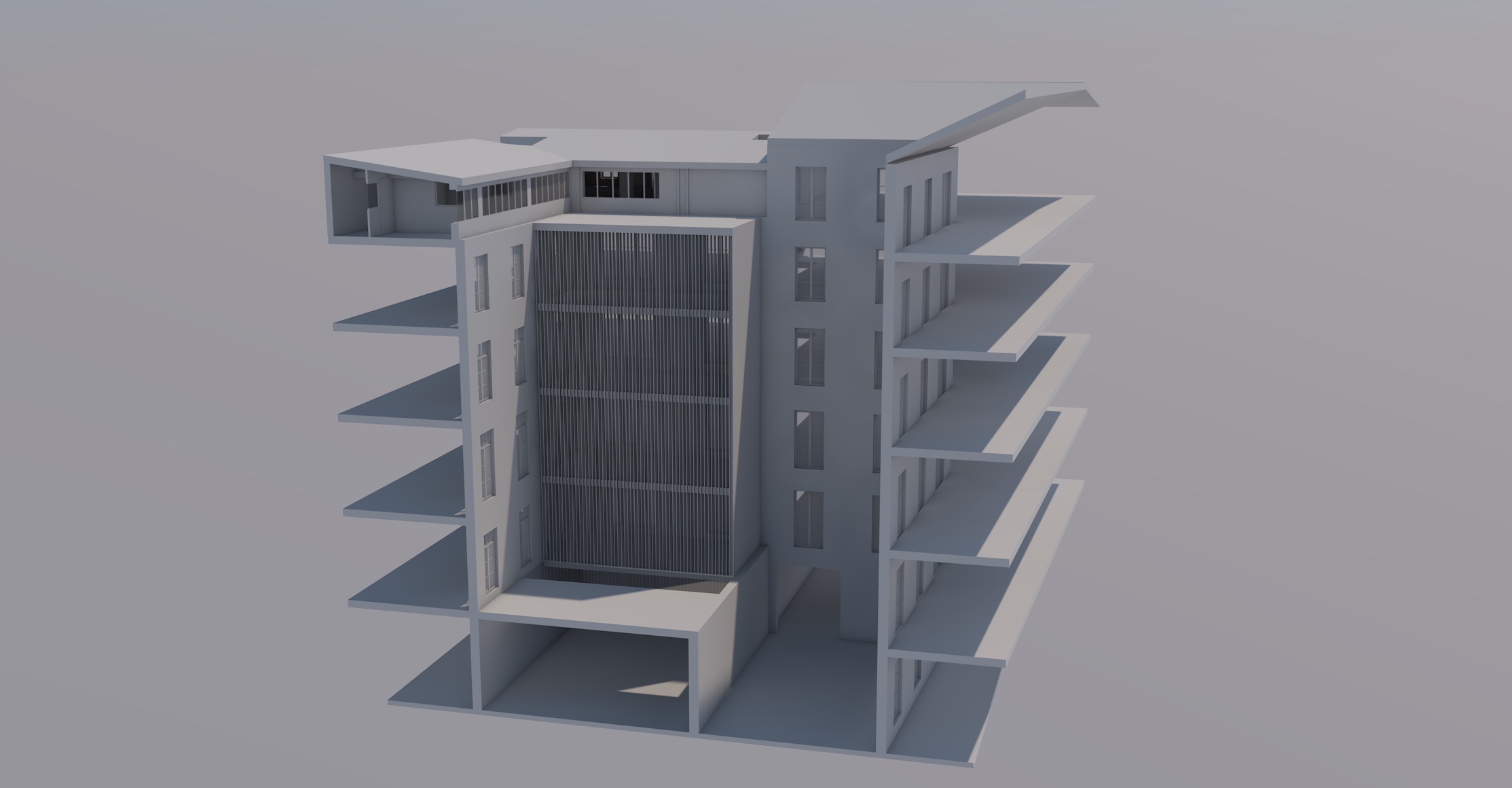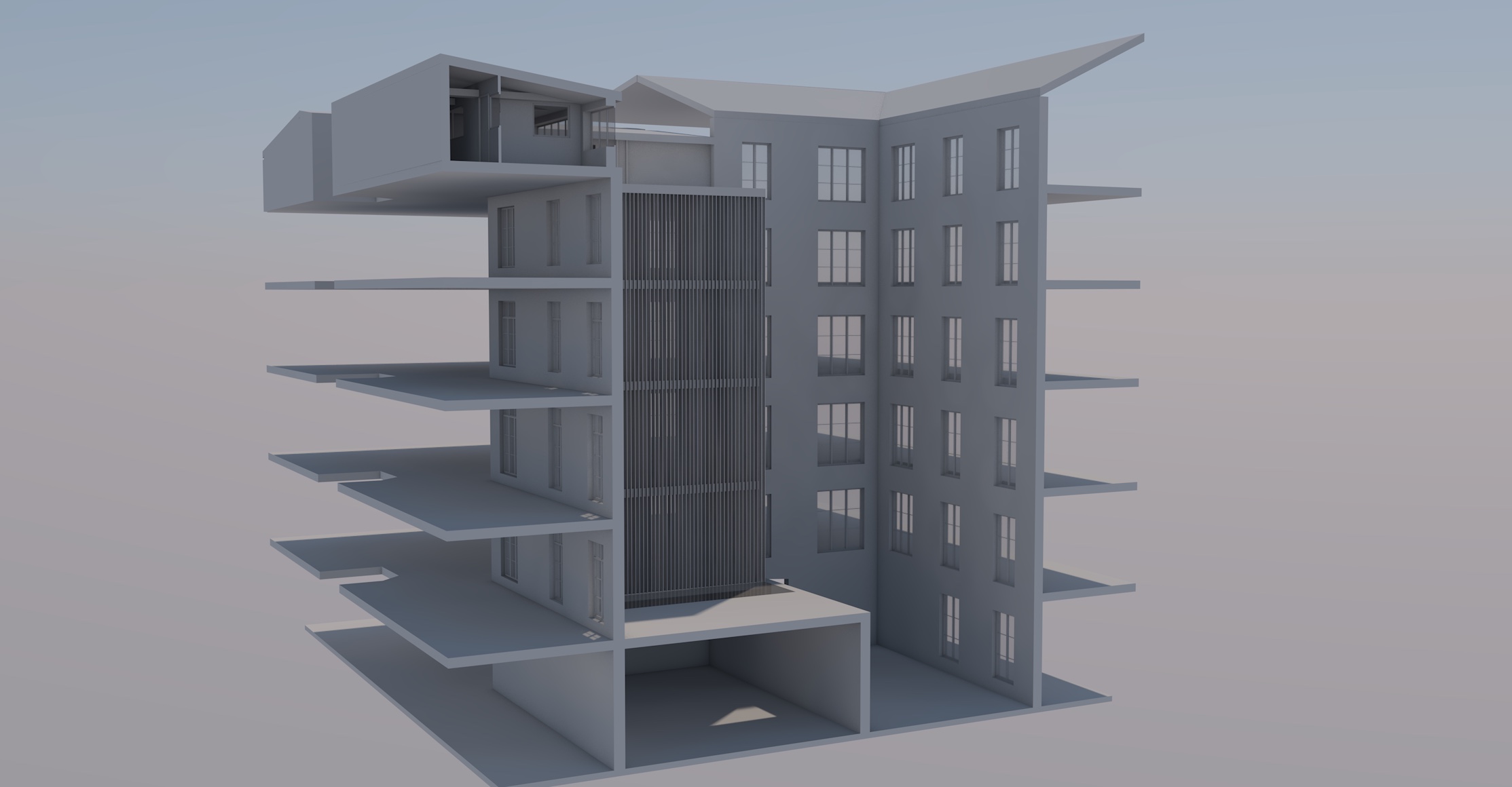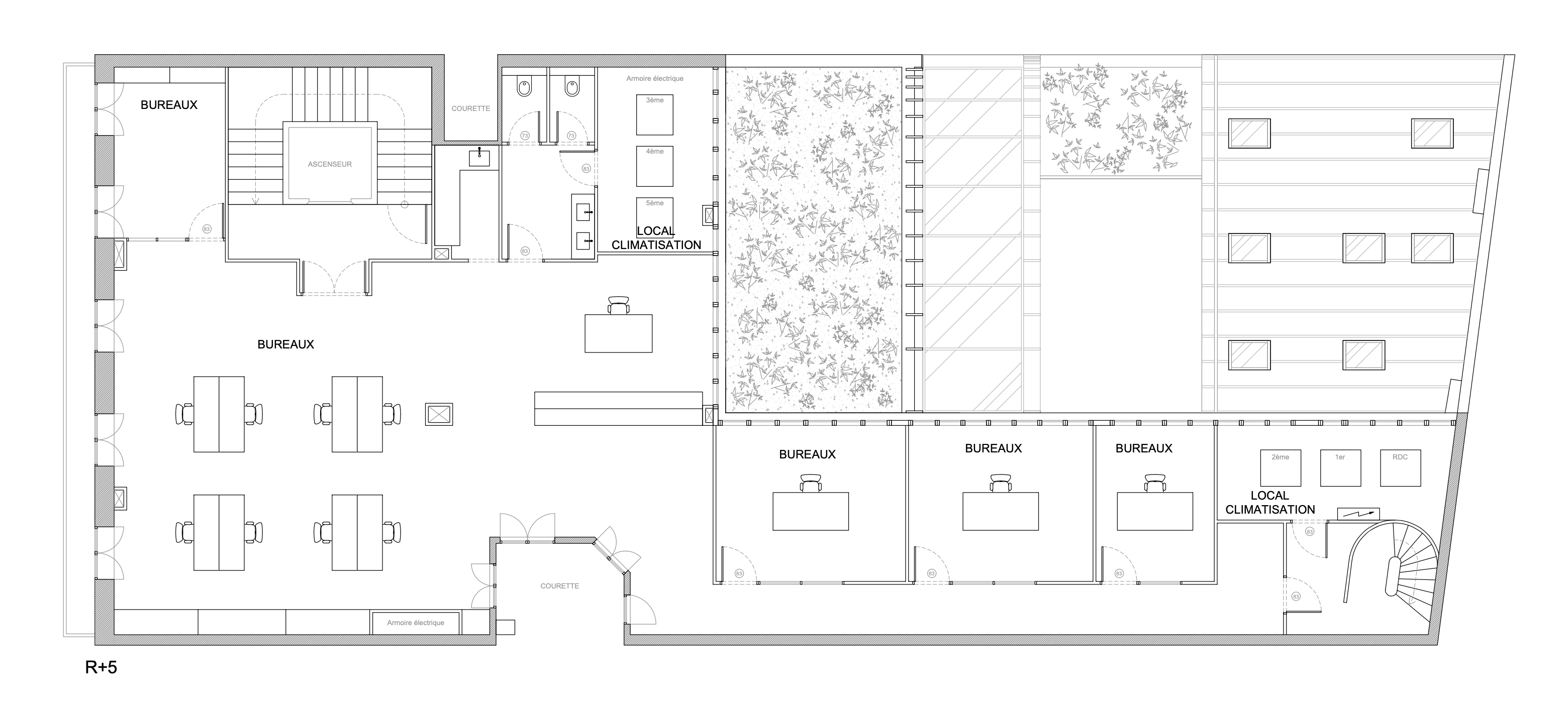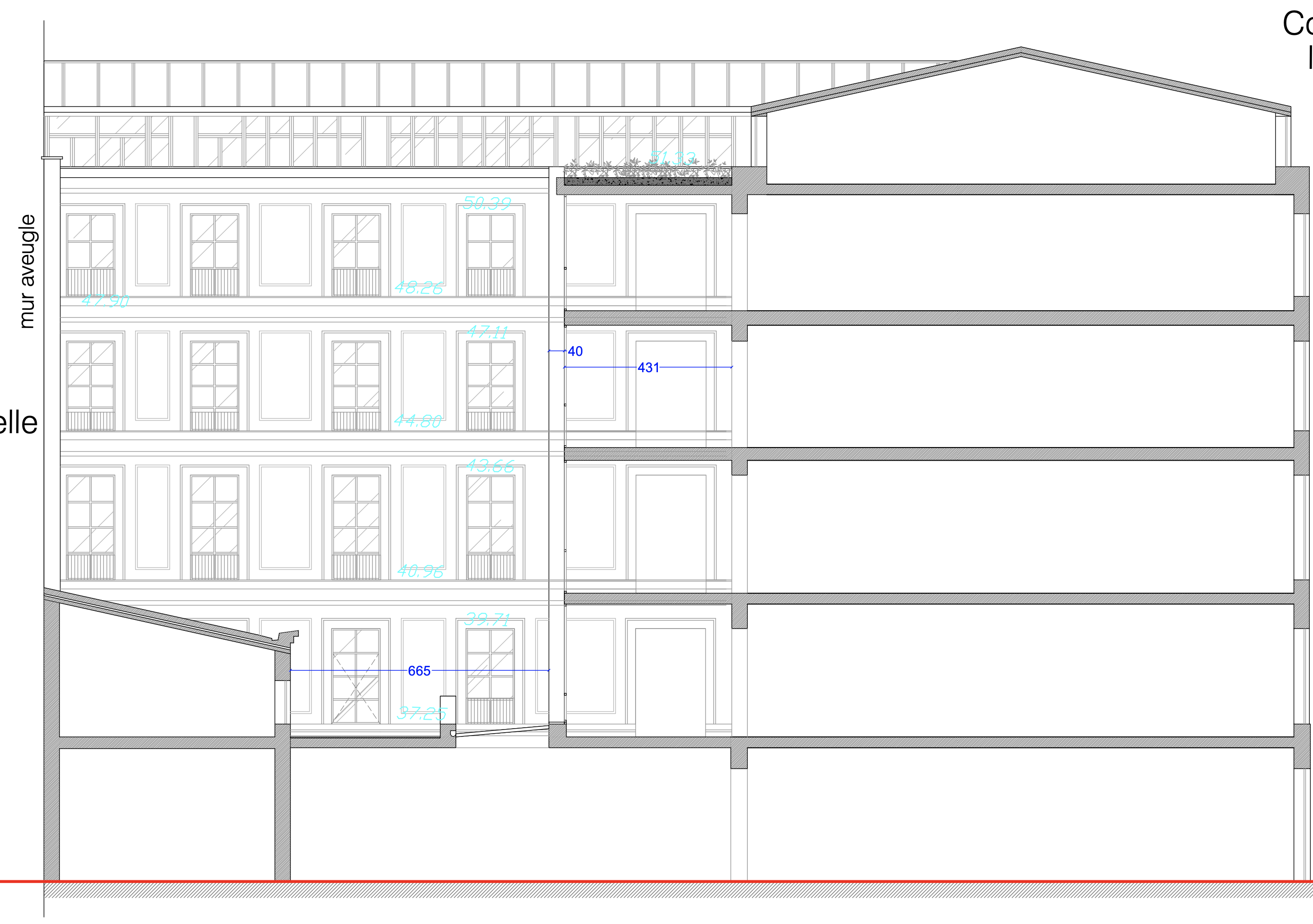 Cette extension est adossée, à un immeuble Haussmannien et partiellement à un mur en pierre de Paris. Les façades haussmanniennes sont préservées et conservées dans leur état actuel. Une "membrane" extérieure transparente leur à été ajouté pour créer les volumes "hors des murs" pour conserver cette façade existante qui est devenue intérieure. Elle ne sont ni doublées ni modifiées, elles sont mises en valeur et protégées par les nouveaux volumes. La couverture de l’extension est végétalisée. Des lames verticales aspect cuivre viennent scander la façade pour créer des brises vues latérales.