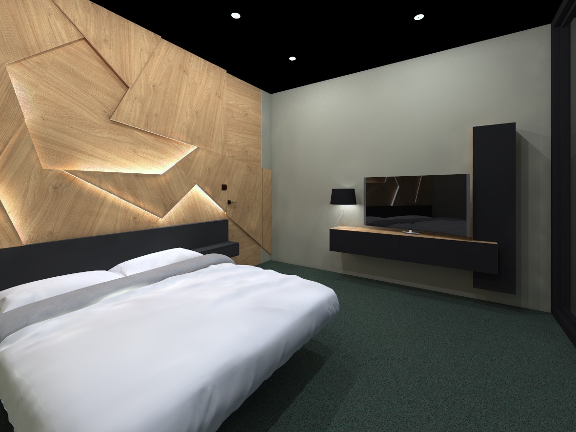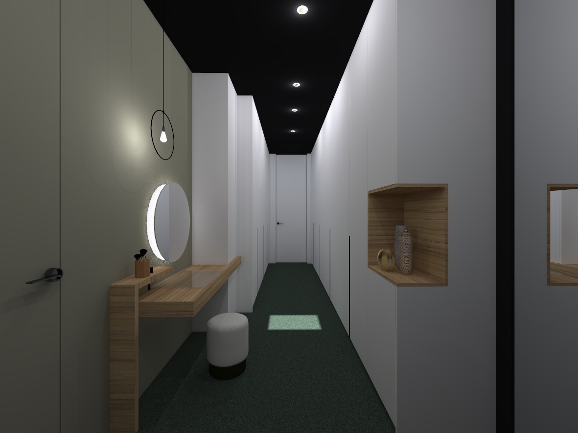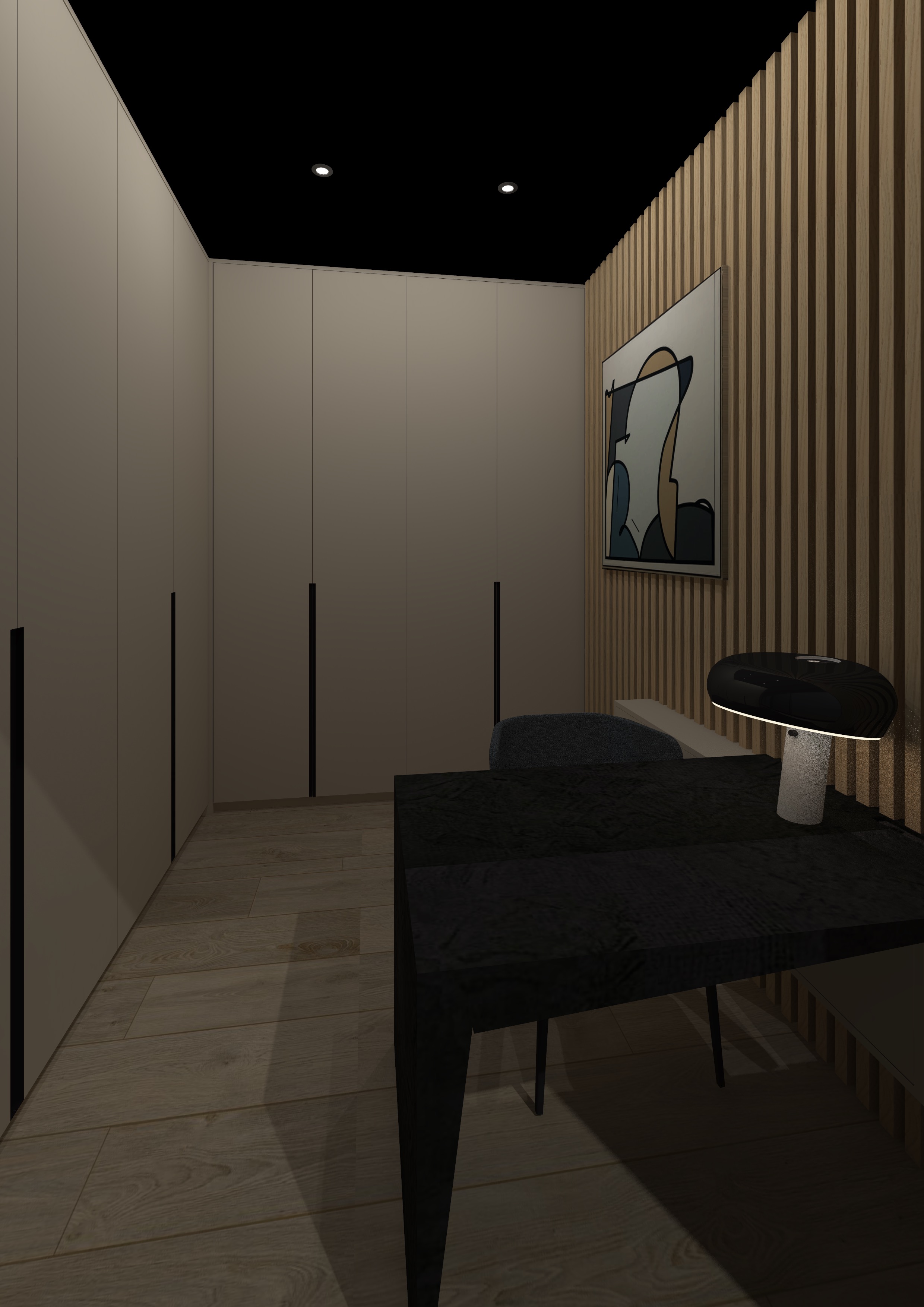 Descriptif technique de l'aménagement : Sur ce projet, nous avons poussé la personnalisation à son summum avant de nous recentrer sur l’essentiel : l’optimisation des espaces et l'élégance au travers de la simplicité et du choix des coloris et matériaux. D'un point de vue technique, l'enjeu principal se situait dans cette monumentale tête de lit, également habillage mural, intégrant une porte dérobée ainsi que de l'éclairage pour souligner les différences de profondeur et volumes du projet. Nous avons aussi réalisé toutes les portes affleurantes toute hauteur du chantier, autre point très technique dans notre profession.