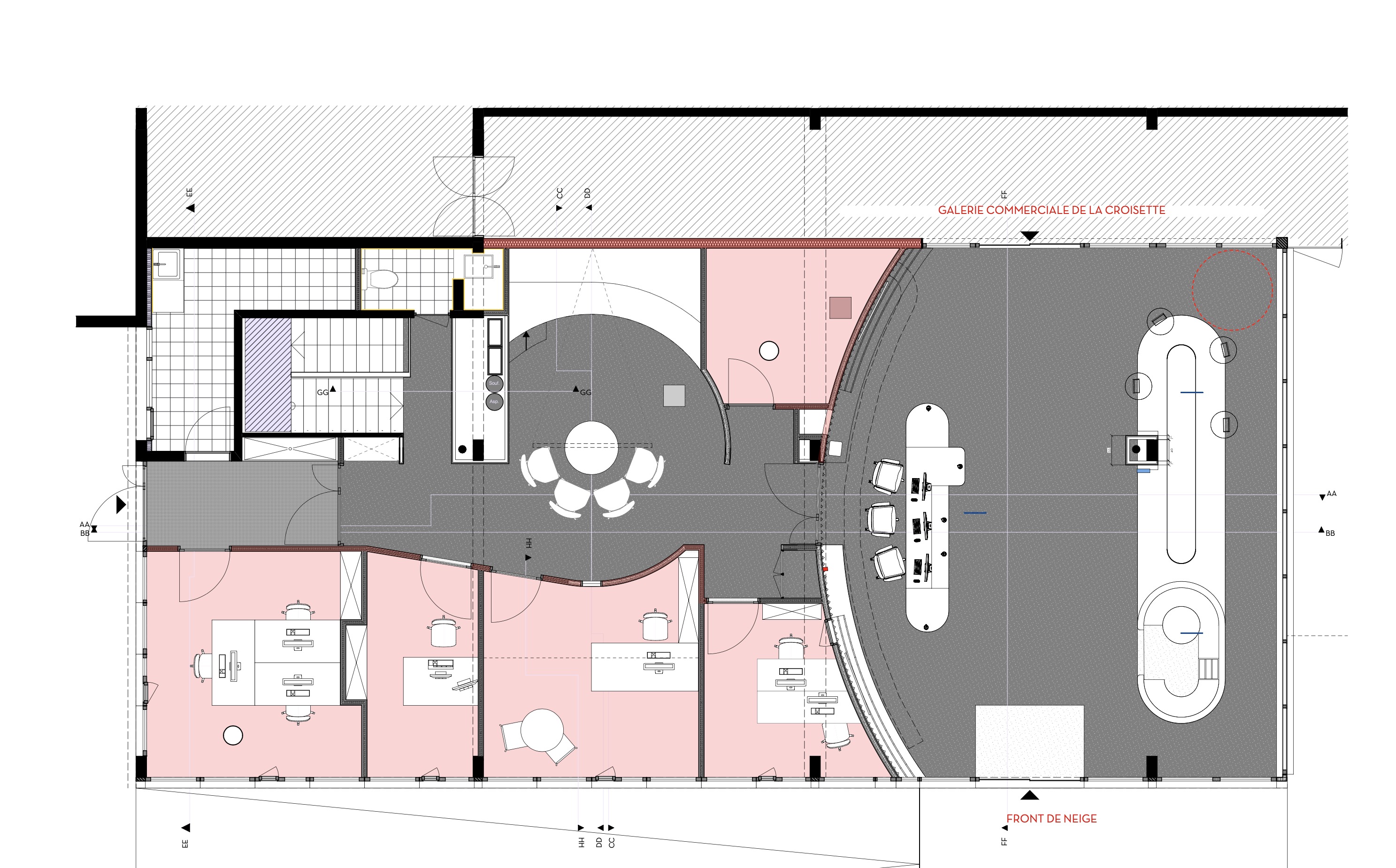 Le projet d’aménagement renoue avec l’architecture originelle de la station en valorisant la trame de façade, en épurant les lignes intérieures et en utilisant des matériaux bruts et durables. Les cloisonnements courbes et blancs font référence aux sports de glisse, à la fluidité et accompagnent les mouvements des visiteurs. Le mobilier est étudié pour assurer le confort des utilisateurs et assurer au mieux la fonction d’accueil du lieu. Reprenant la couleur rouge de la station, la signalétique sur mesure propose une approche décalée et ludique de la vie en station.