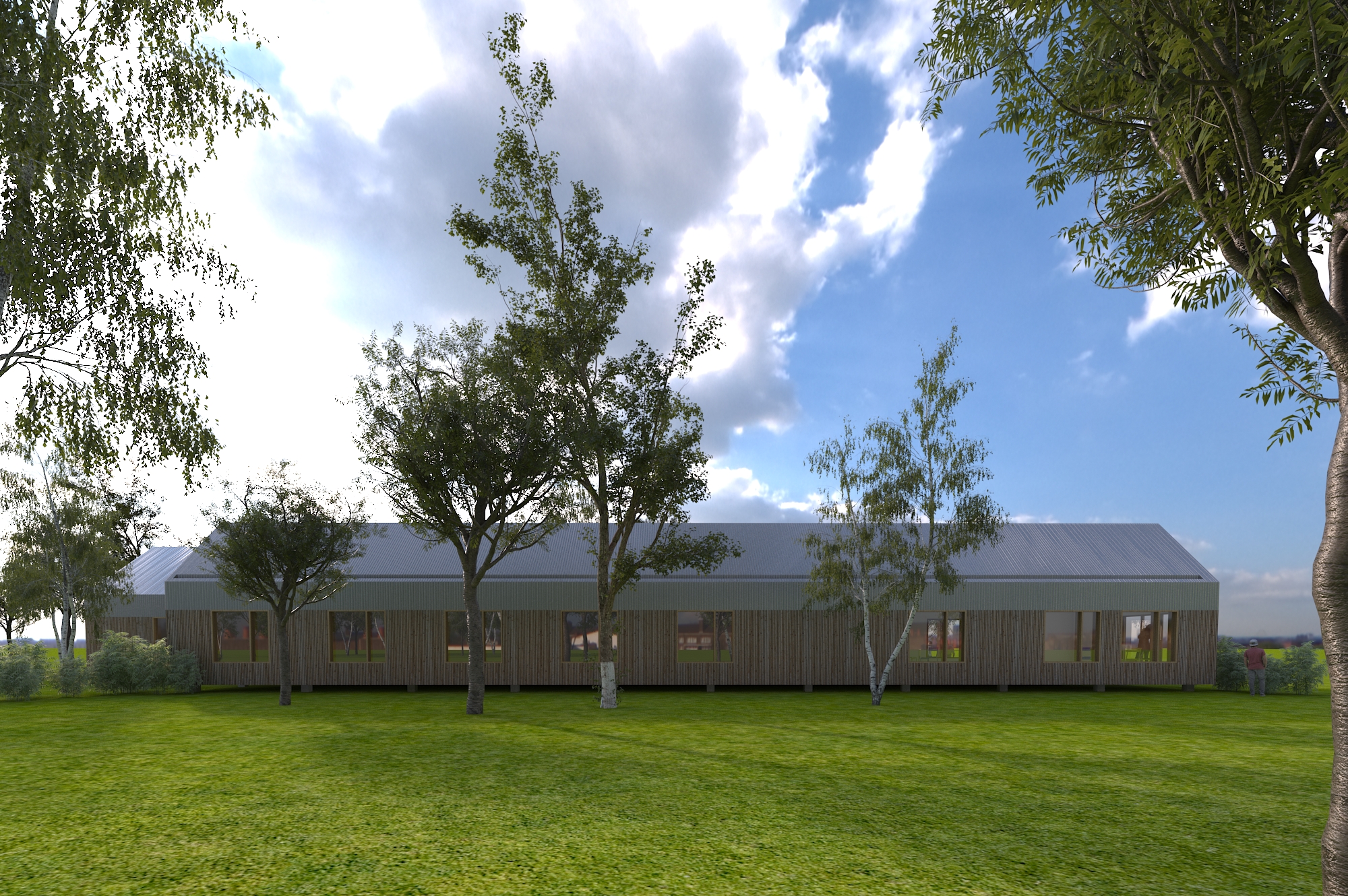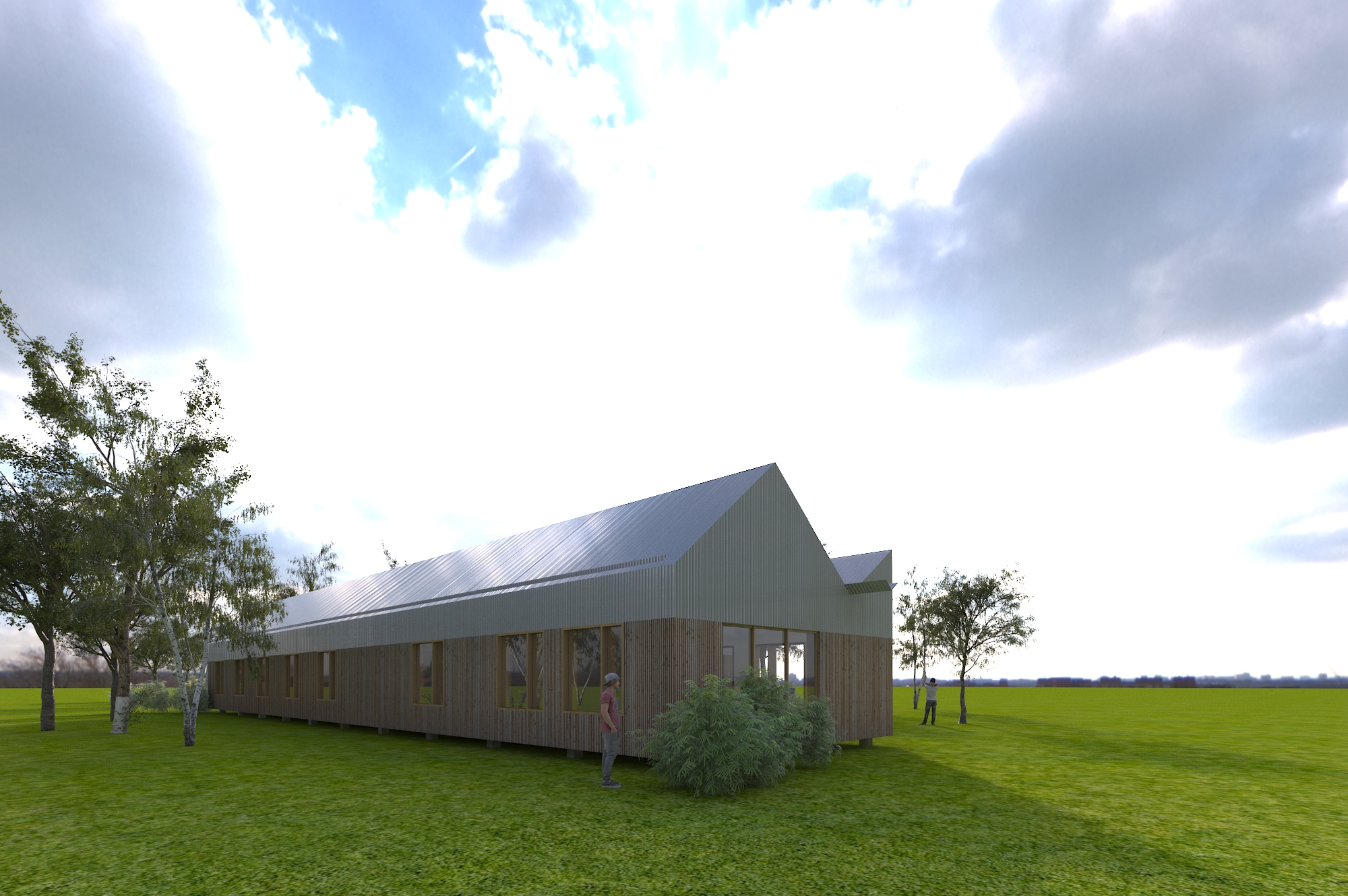 Pour privilégier un plan efficace-compact et pour des questions de coûts, de mise en œuvre et de déplacements au sein du projet, nous optons pour un plan en rectangle. Le projet se lit comme deux barrettes enchâssées et décalées l’une de l’autre. Les toitures, à deux pentes, ont trois arguments de taille : elles feront écho aux constructions traditionnelles alentours, elles permettront à la fois une richesse spatiale dans les espaces souhaités et à la fois une simplicité de mise en œuvre. Le bâtiment reste de plain-pied.