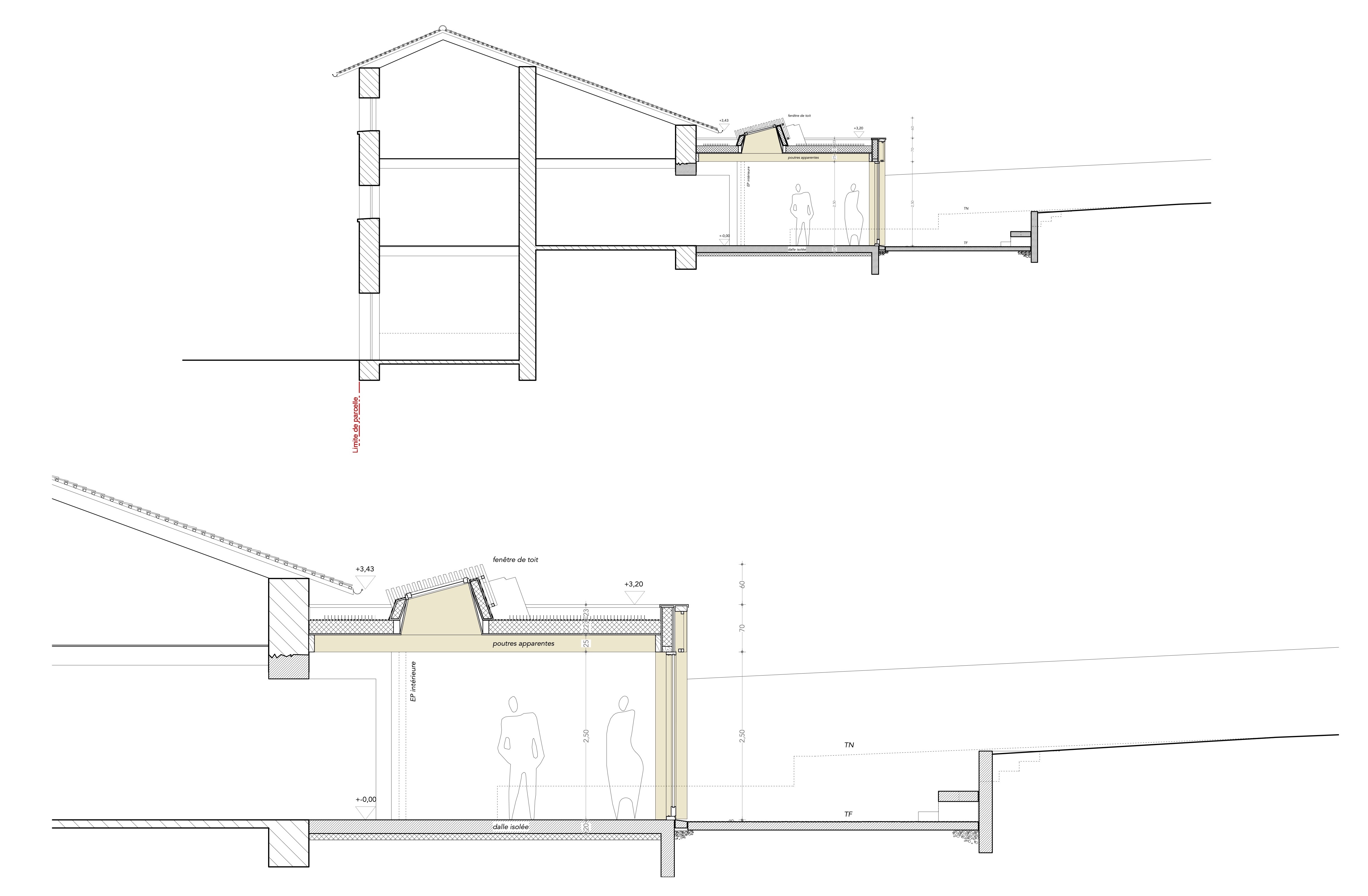 Descriptif technique : Le choix de la structure s'est fait afin de répondre aux contraintes du site. Le toit plat (en pente très légère) permet de créer une extension qui s'intègre sous le chéneau de la maison existante afin de ne pas générer de confrontation. Le lamellé-collé est une solution pour franchir la portée de l'extension sans élément porteur intermédiaire. Le panneau trois plis sert de support à l'isolant et permet à l'ensemble de la structure de rester apparente. La baie mesure 5,5 m de large sur 2,50 m de haut avec deux éléments coulissants en partie centrale.