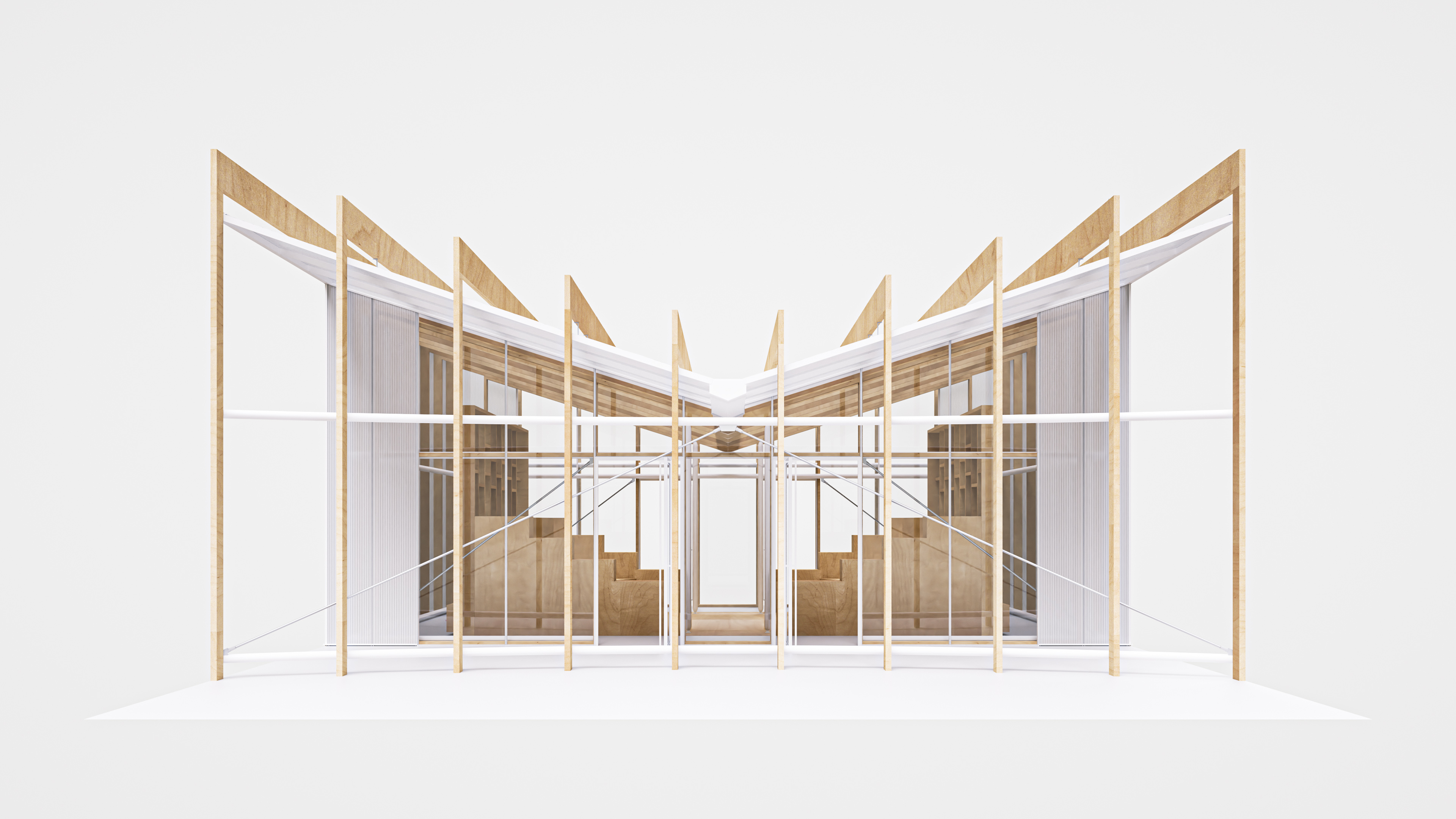 Approche environnementale : La structure du pavillon est à saisir comme un ensemble de mouvements. Lorsqu’on le regarde, on perçoit une double matérialité -- bois et métal -- et on se pose, donc, la question de savoir quelle matière soutient l’autre. Pensé à partir d’un jeu d’intervalles et de transparence, le pavillon est habillé d’un exosquelette et organisé autour d’un noyau en gradins à double rangée, pouvant accueillir jusqu’à quarante personnes. Le pavillon entre dans les collections du Frac Centre-Val de Loire. À l’issue de la Biennale, il sera démonté et reconstruit dans la Ville de Vierzon.