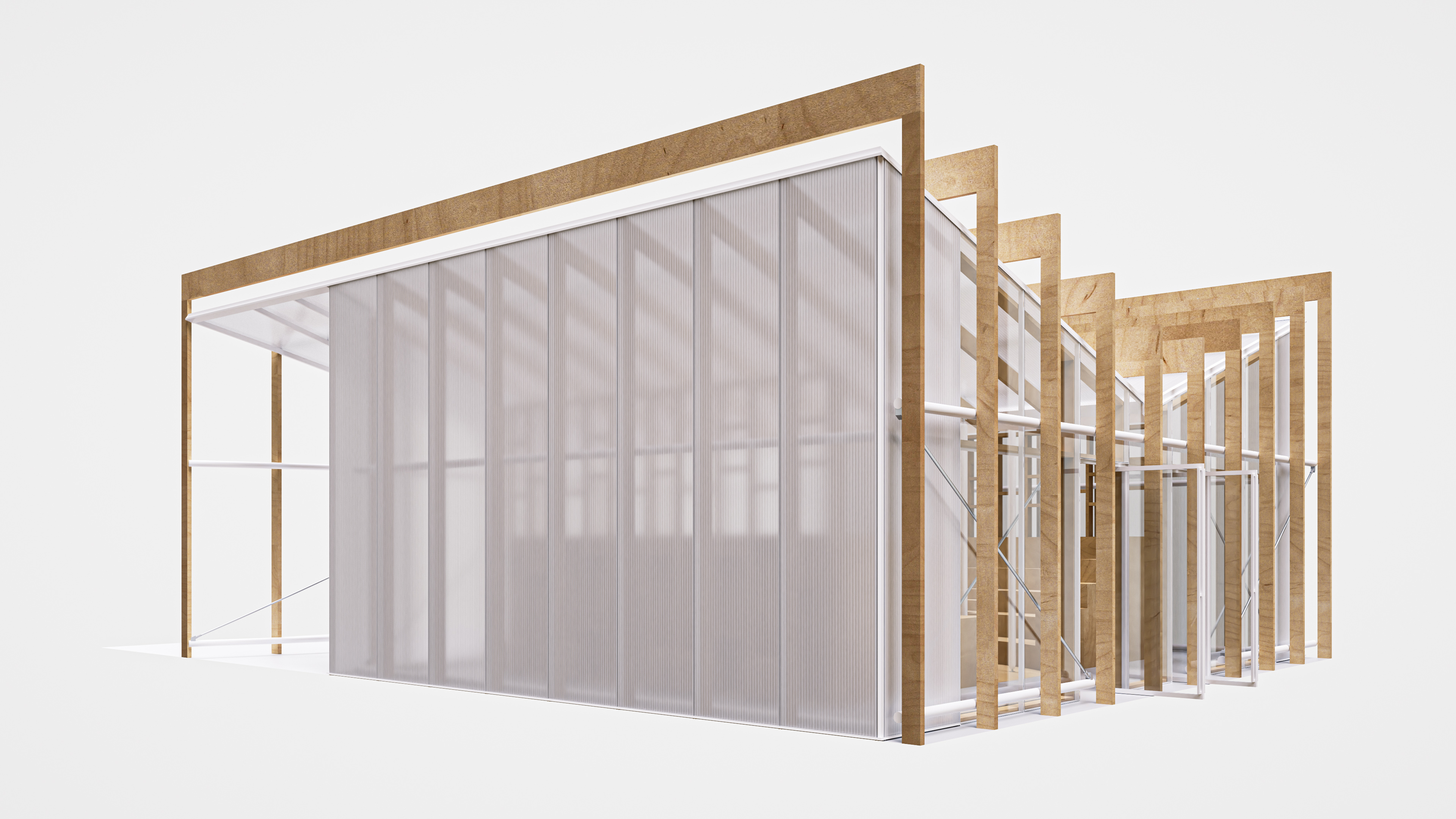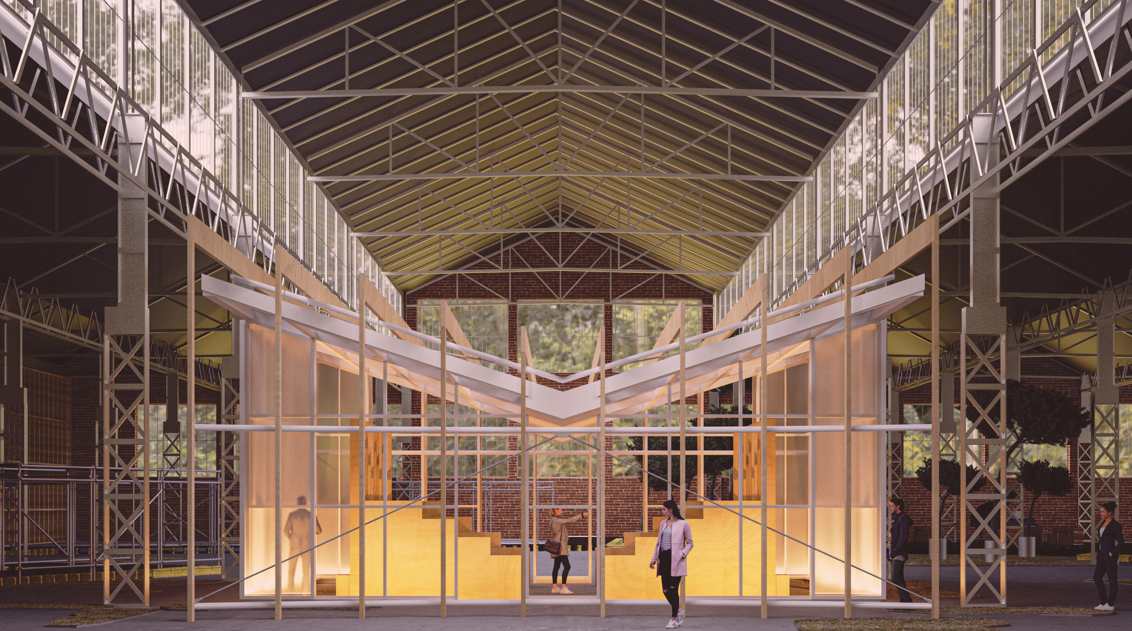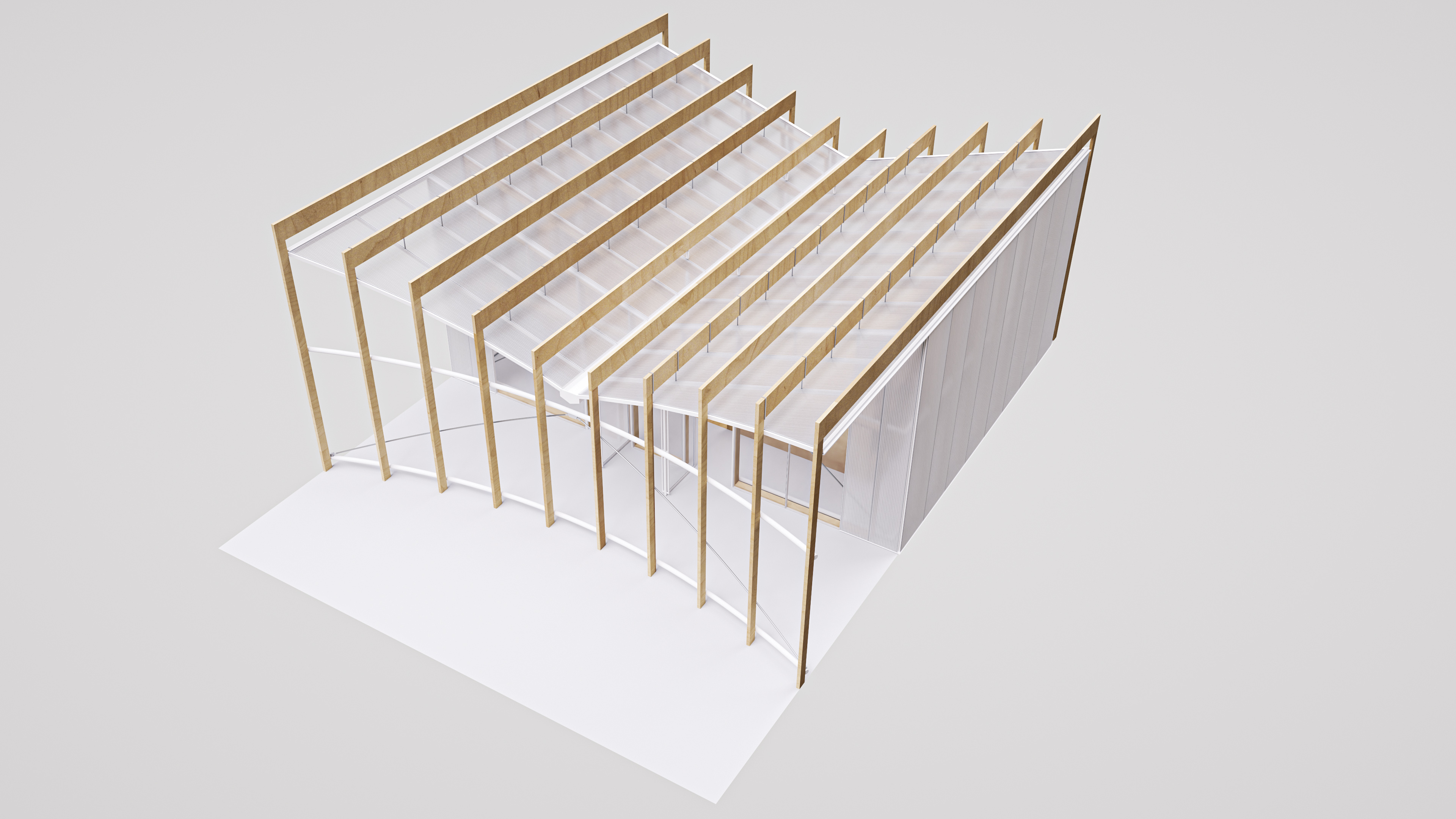 Descriptif technique de l'aménagement : Il s’agit d’une exo-structure autoportante en bois avec contreventement métallique (en acier et en aluminium), le tout enveloppé par des panneaux en polycarbonate recyclé. L'édicule d'une centaine de mètres carrés est constitué de portiques de bois contreventés par des sections métalliques tubulaires, et doté d'une peau intérieure de polycarbonate recyclé qui filtre la lumière. Sous la nappe métallique des charpentes historiques de la halle industrielle, le pavillon émane une lueur douce des reflets argentés de la petite construction. L'exosquelette en bois et son habillage translucide fabriquent une enveloppe protectrice pour ses visiteurs, qui sont invités ainsi à se reposer sur les gradins en bois.