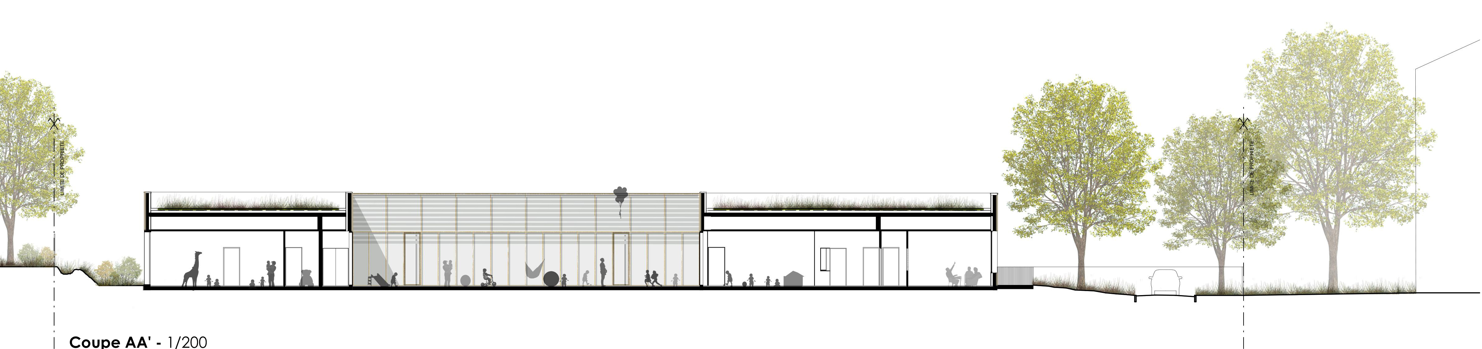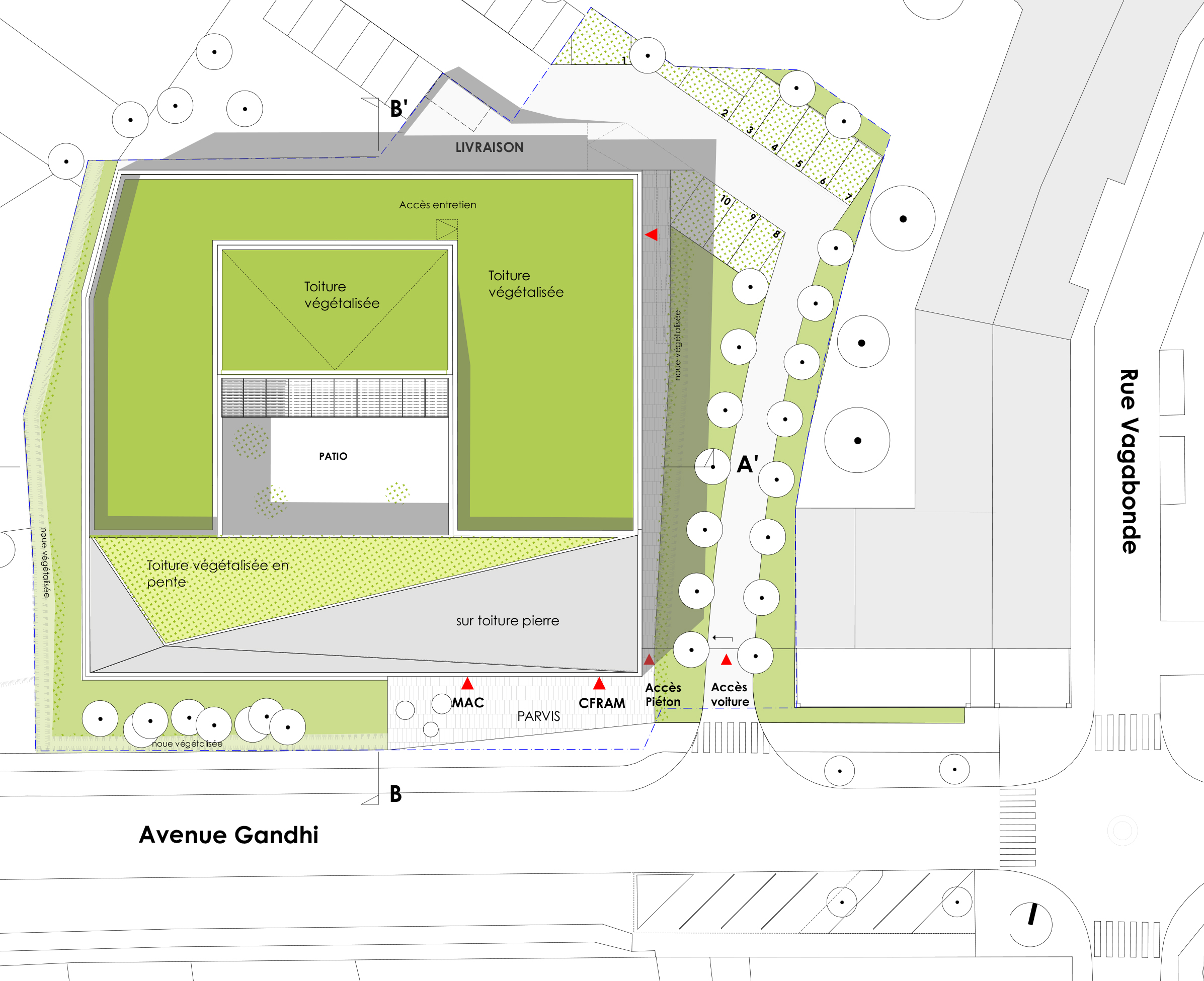 Nous proposons un projet contemporain, qui revisite clairement la notion de toiture traditionnelle, tout en signalant la dimension publique de l’équipement au travers d’une identité forte et singulière. Les façades et la toiture sud ne sont qu’un seul matériau. La façade est partie du toit et le toit est partie de la façade. Le patio, au coeur de l’équipement, protège des nuisances sonores de l’avenue Gandhi et apporte un maximum de lumière naturelle et de transparence aux espaces.