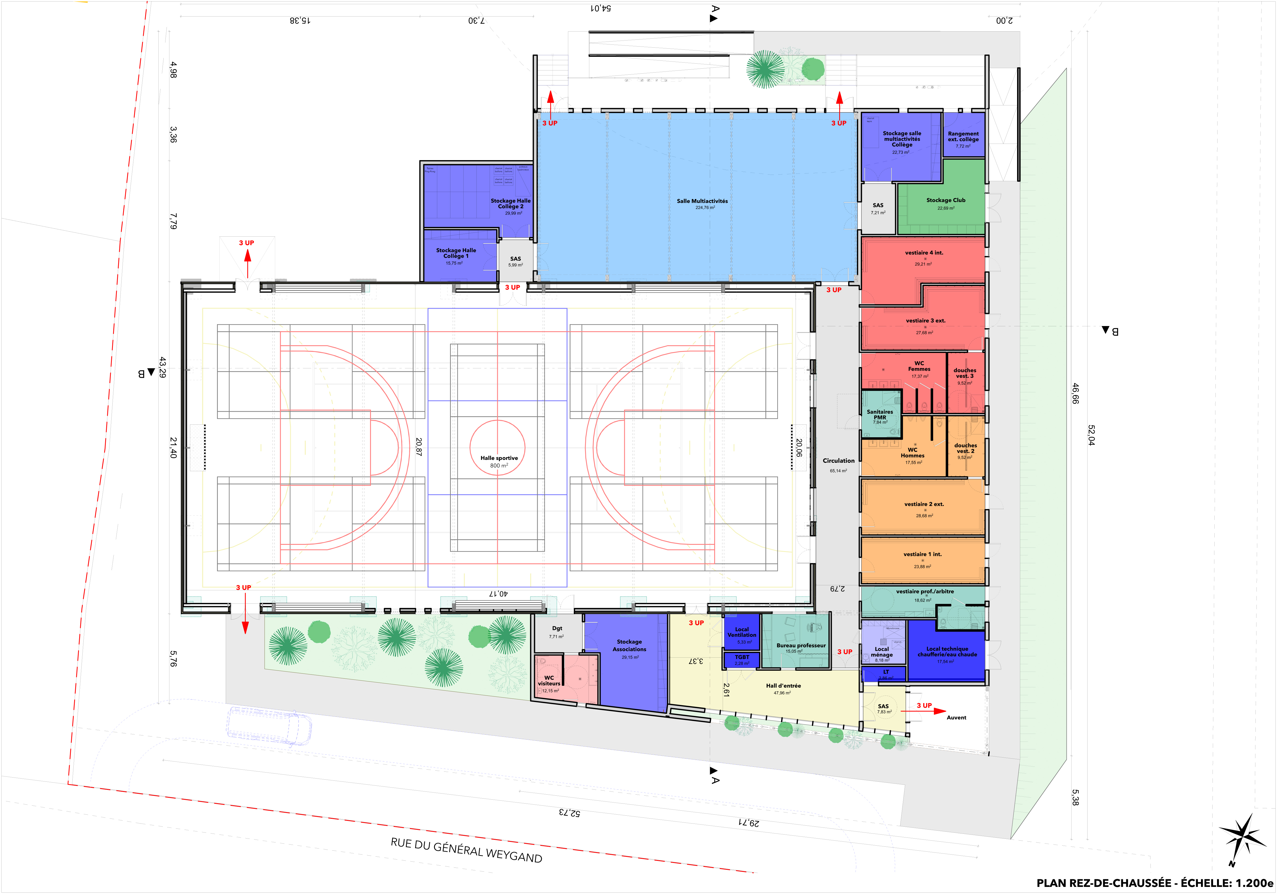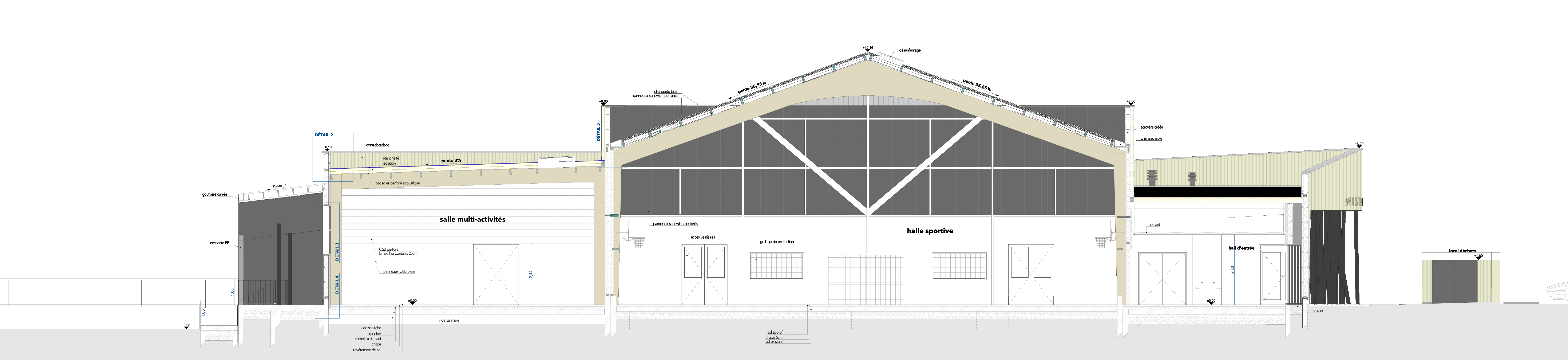 Descriptif technique : Hormis la salle de sports principale, l’ensemble des locaux du programme sont intégrés dans des extensions en bois « accrochées » sur les lignes de forces contextuelles du site. Ils comprennent notamment une seconde salle de sports, des vestiaires, sanitaires, bureaux, gradins extérieurs,…
