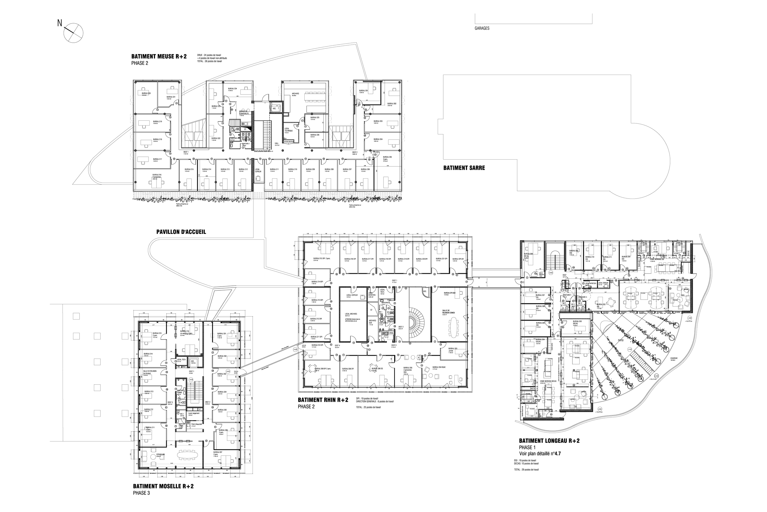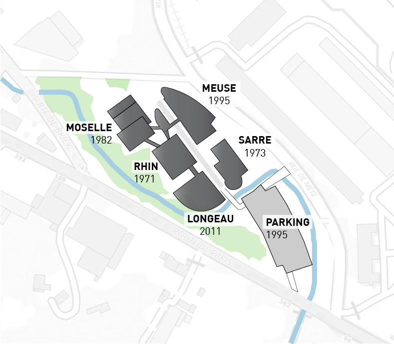 La restructuration des locaux de l’Agence de l’Eau Rhin-Meuse a consisté à l’amélioration du confort thermique et des performances énergétiques de 5 bâtiments construits entre 1971 et 2011. Ce travail sur l’enveloppe thermique a également été accompagné par une rénovation de l’ensemble des espaces intérieurs et la création de mobilier intérieur et extérieur. L’ensemble hétéroclite que formaient les bâtiments existants est aujourd‘hui unifié grâce à l’emploi d’une même section de bois massif dans l’ensemble des interventions (brise-soleil, banque d’accueil, tonnelles, claustras…).