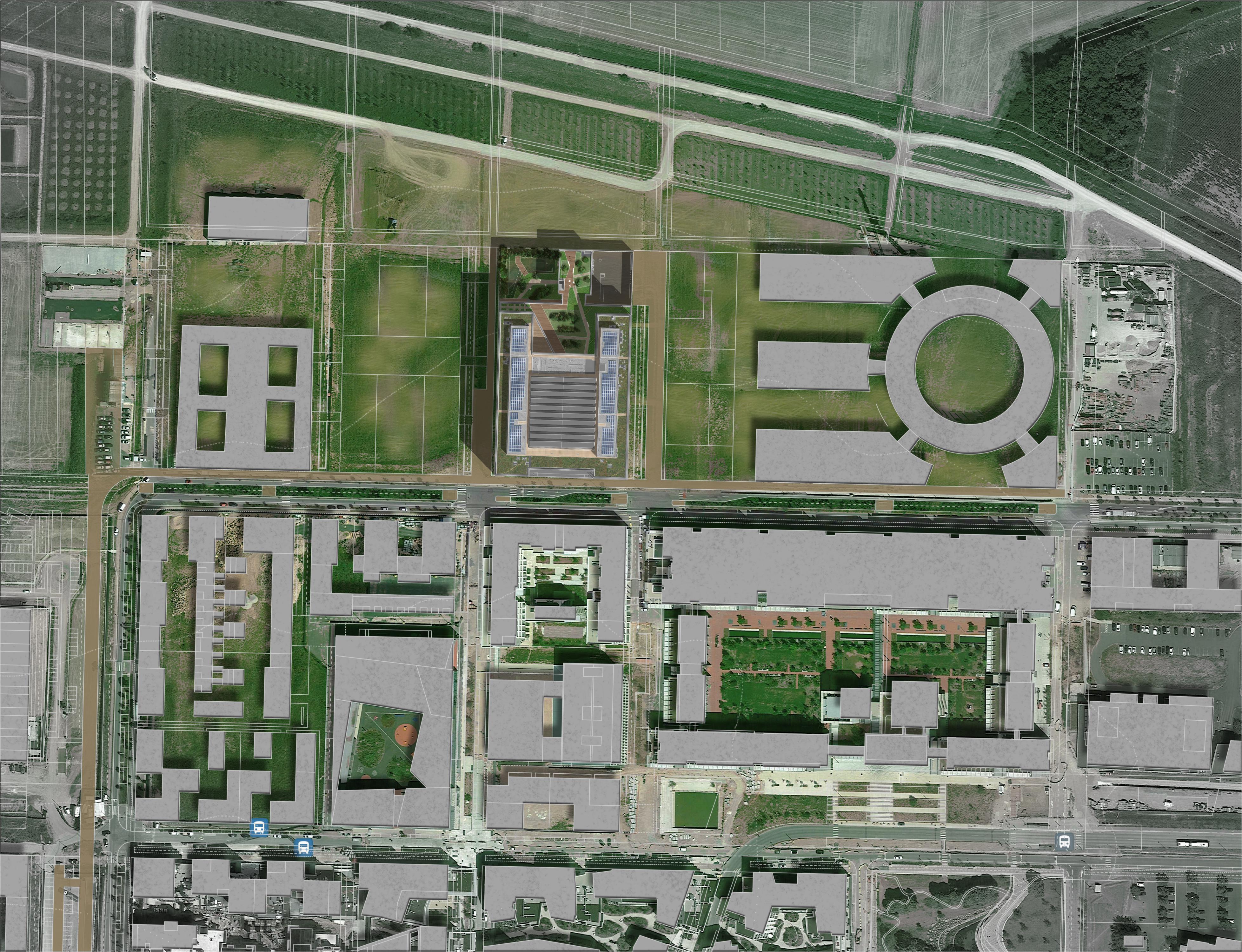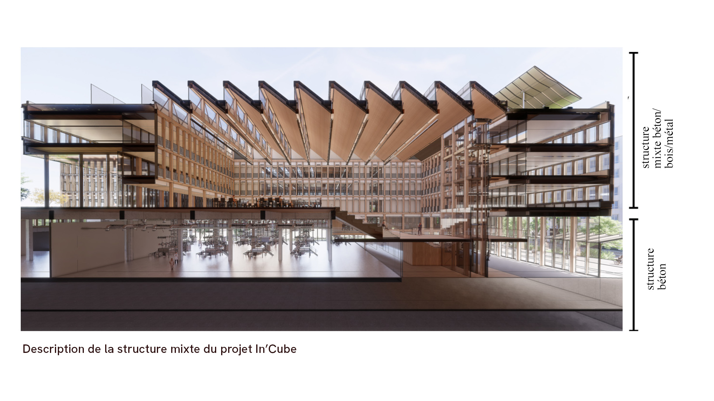 Descriptif technique : Une architecture bioclimatique par une grande efficacité des protections solaires en été, un équilibre de surfaces vitrées entre apports de lumière naturelle et maîtrise des déperditions et des apports solaires. Performance thermique de l’enveloppe du bâtiment avec un haut niveau d’isolation thermique, tant sur les parois opaques (murs et toitures) que sur les parois vitrées. Plancher chauffant/rafraichissant prévu dans les espaces hall et plazza Ventilo-convecteurs HEE bureaux et labo Diverses CTA bénéficiant d’indice SFPv inférieur à 0,7 (bureaux, hall d’accueil, plazza, RIE) Le raccordement prioritaire au réseau de chaleur (chaud/froid) de la ZAC, performances environnementales > de 60% d’énergie renouvelable. L’intégration architecturale en toiture de capteurs photovoltaïques