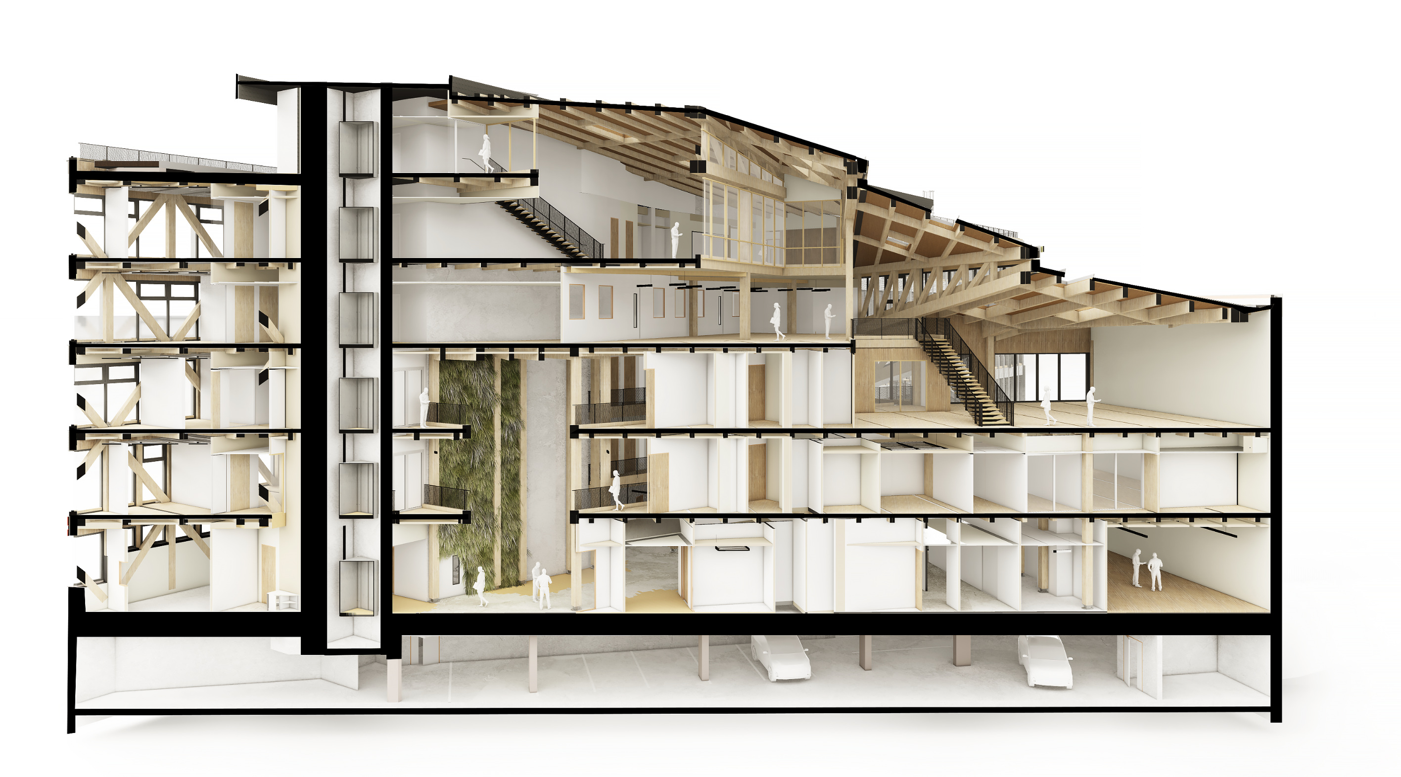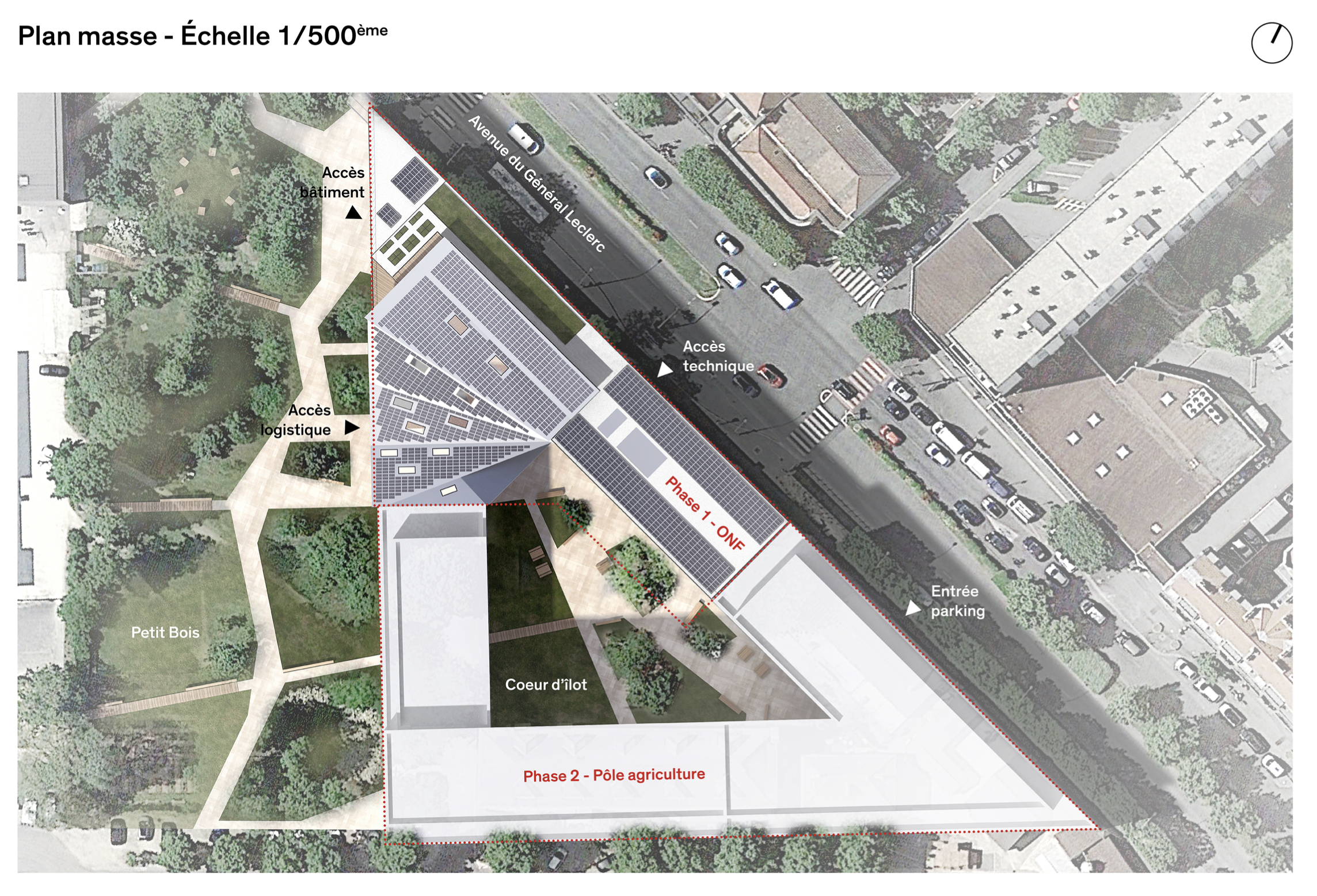 Un bâtiment qui articule ensemble ville et nature. Le bâtiment se déploie entre la ville de Maisons-Alfort et le parc de l'EnvA en deux ailes distinctes : l’aile Nord côté rue, qui développe des espaces de bureaux dits ‘traditionnels’ mais évolutifs; et l’aile Sud côté jardin où se déploient les espaces collectifs, dédiés à des nouvelles formes de travail. Deux ailes qui se rejoignent au niveau de la proue d’entrée, puissant signal de l’accès au bâtiment. Le lien entre ville et nature est renforcé par la percée, au cœur de l’édifice, d’une monumentale rue intérieure sur trois niveaux.