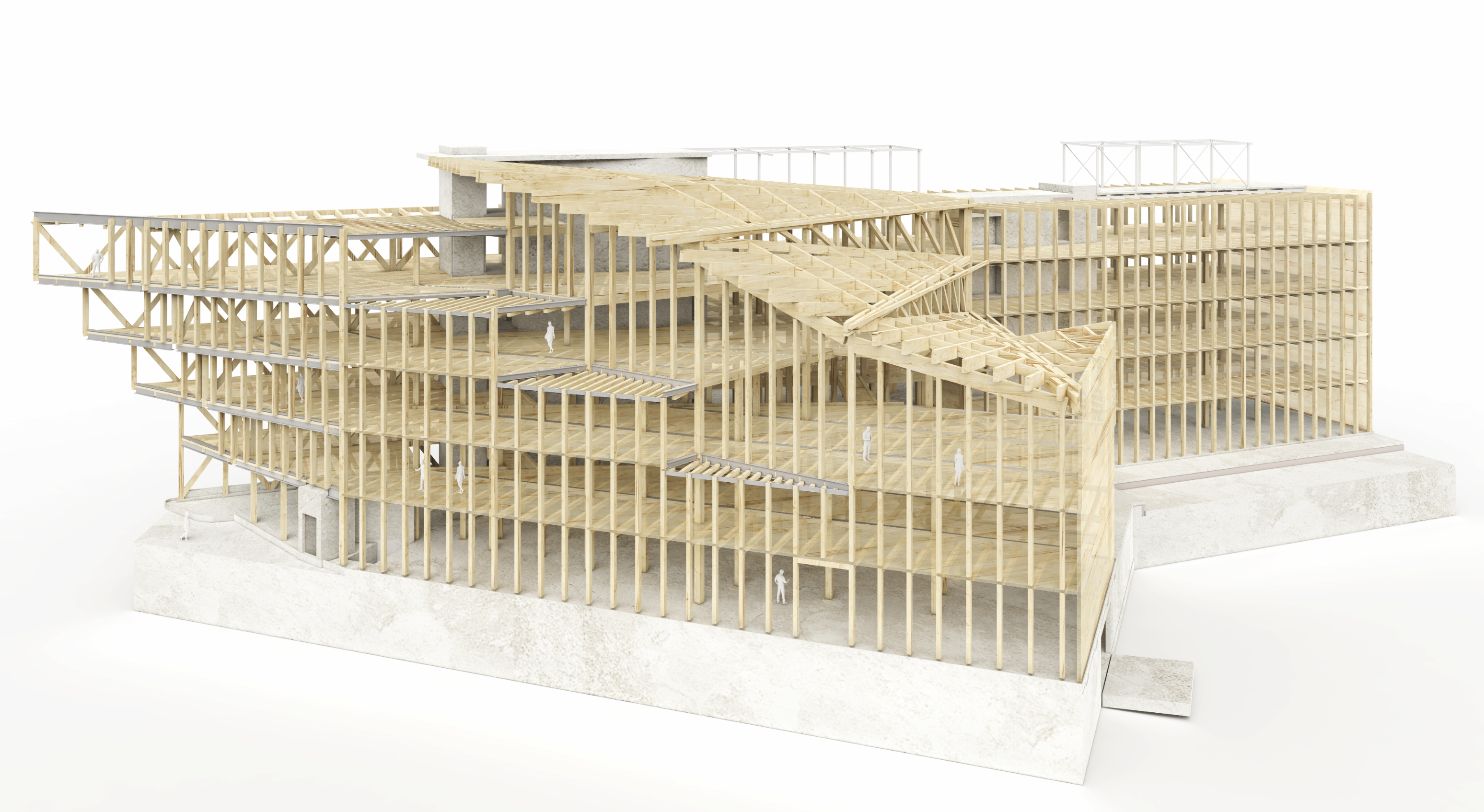 Approche environnementale : L’ensemble du bois a été fourni par l’ONF un an avant le début du chantier. Les grumes, livrées bord de route, ont été transformés par des scieurs de l’est et l’ouest de la France. L’utilisation du bois assure au bâtiment une performance carbone exemplaire (E3C2), combinant l’excellence environnementale au chapitre déjà long des atouts de ce matériau renouvelable. Dès la conception du bâtiment, le groupement de maîtrise d’œuvre s’est également engagé sur la vertuosité de cycle de vie de l’édifice, sur ses performances énergétiques, son entretien et sa maintenance.