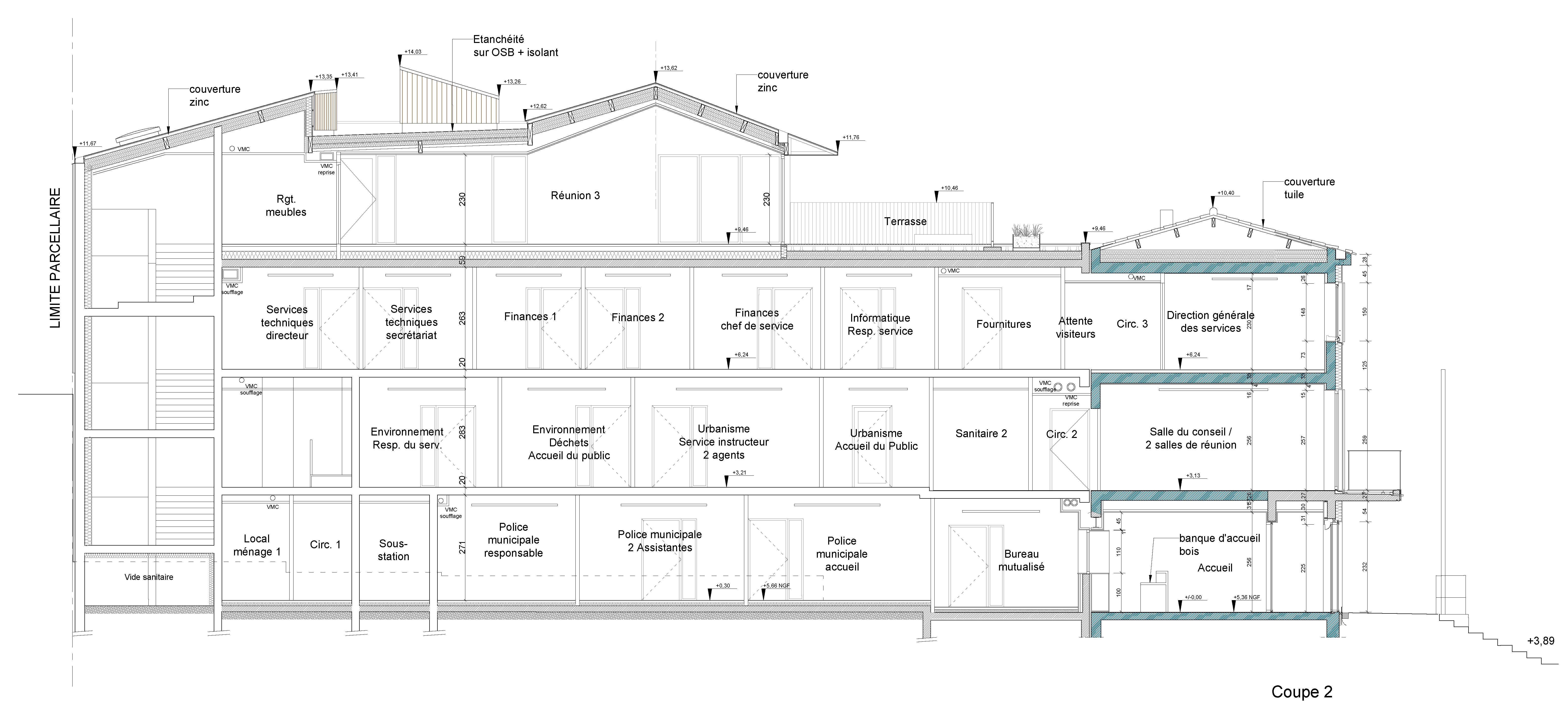Le projet de la Mairie de l’Ile d’Yeu s’inscrit dans la volonté de la municipalité de valoriser le patrimoine existant et d’afficher pour l’extension une écriture contemporaine forte, tournée vers l’environnement en offrant un accueil et un cadre de travail chaleureux et confortable. Le bâtiment historique voit ses percements sur le quai recomposés. L’extension d’expression contemporaine associe l’enduit blanc local et le bois. Son dernier étage sculpté en attique offre une vue spectaculaire vers le port et l’océan. Ses toitures chahutées participent à l’intégration dans le tissu du bourg.