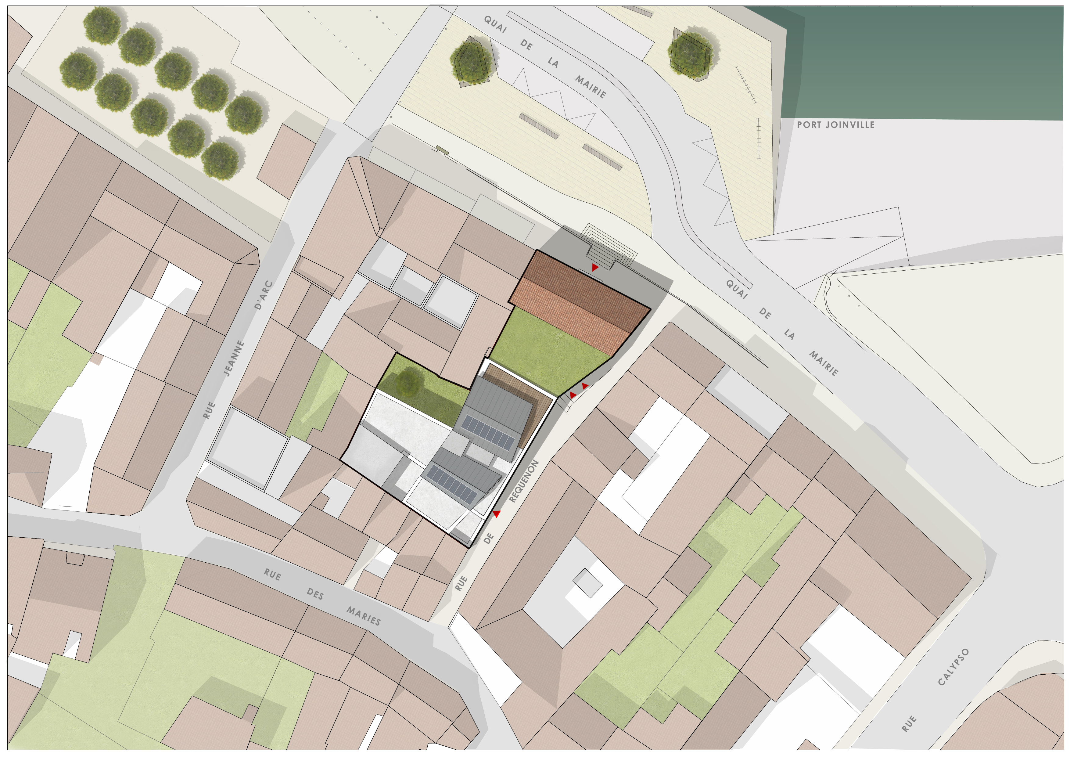 Approche environnementale : Le bâtiment patrimonial est isolé par l’extérieur. L’extension est en murs à ossature bois. Cette solution de préfabrication nous a semblé pertinente en matière d’approvisionnement par bateau. Nous avons choisi le bois non peint pour l’extension. Ce matériau affiche le caractère environnemental souhaité pour ce projet. Il offre une écriture contemporaine, chaleureuse, sobre et respectueuse des teintes locales. Ce bois est pré-grisé pour se fondre immédiatement dans le paysage. Le projet intègre des panneaux photovoltaïques et la possibilité de se raccorder à un chauffage urbain.