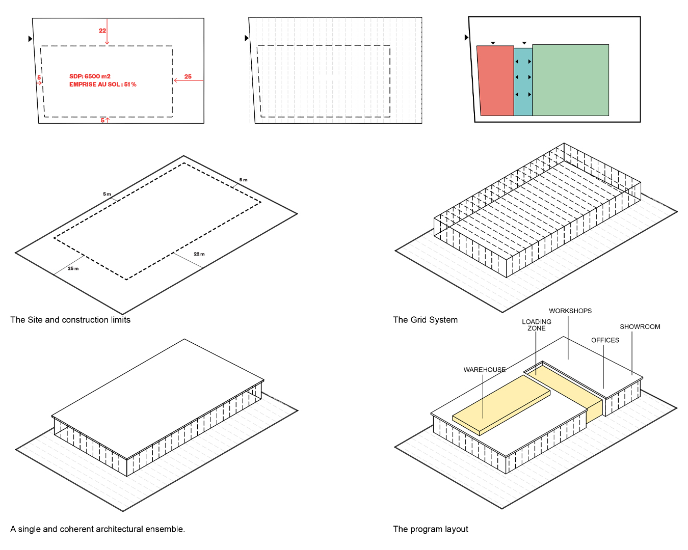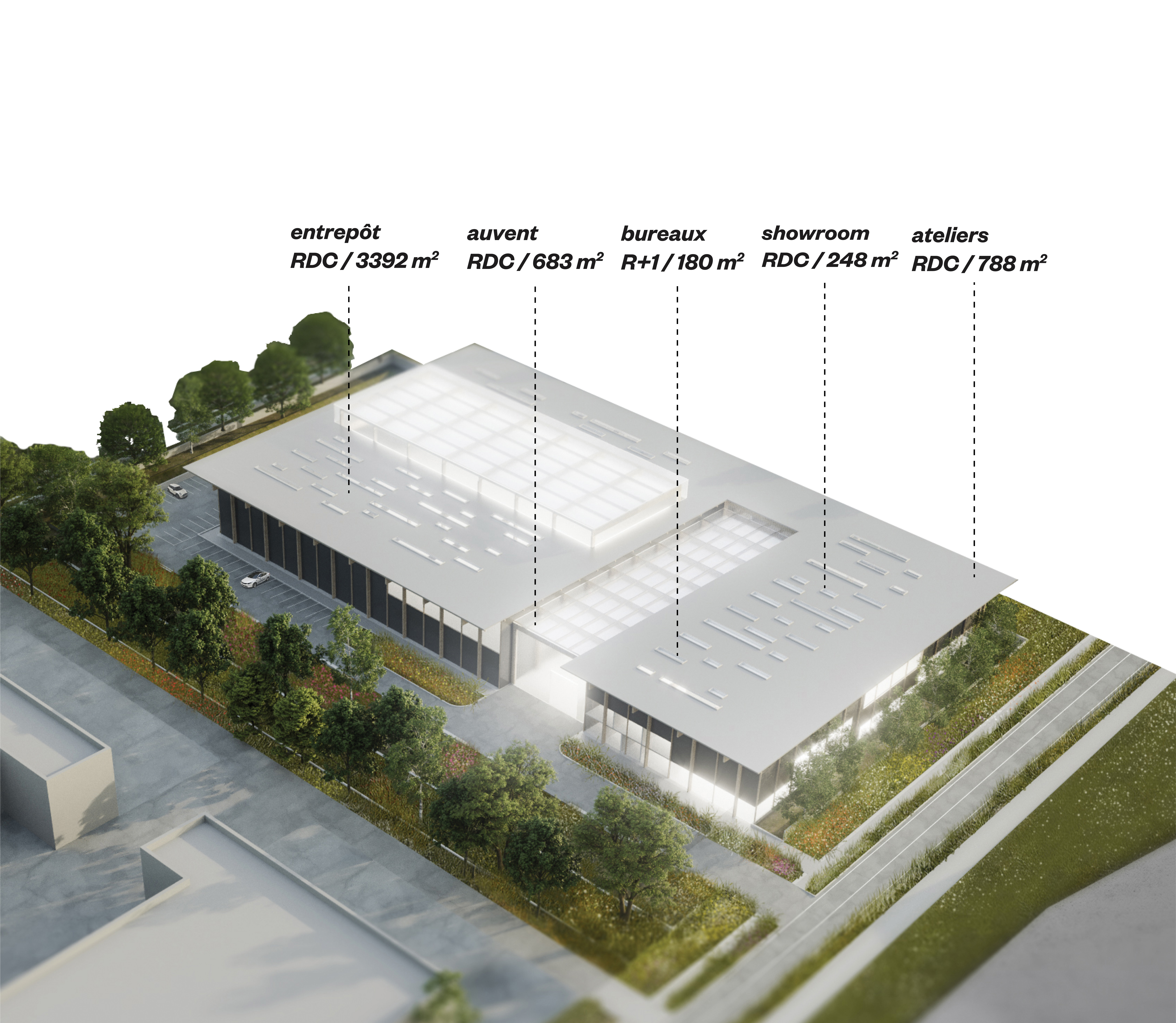Descriptif technique : Le bâtiment se compose de 1- Espace de vente, bureaux, atelier – visibles depuis la rue 2- Auvent central d’approvisionnement; 3- Volume de stockage des produits bruts L’entraxe est de 10m40 pour l’entrepôt et de 8m40 pour la partie du showroom/bureaux/atelier afin de limiter les portées et donc les hauteurs des poutres Dans l’auvent, les portiques sont orientés perpendiculairement à la trame des bâtiments et laissent une largeur libre de 16m pour une circulation aisée. Entre les portiques en bois s’alternent des façades vitrées, es façades translucides en profils de verre armé opalescents ou des façades opaques en double peau métallique. La couverture en polycarbonate de l’auvent, et la lanterne surélevée translucide de l’entrepôt marquent la toiture.