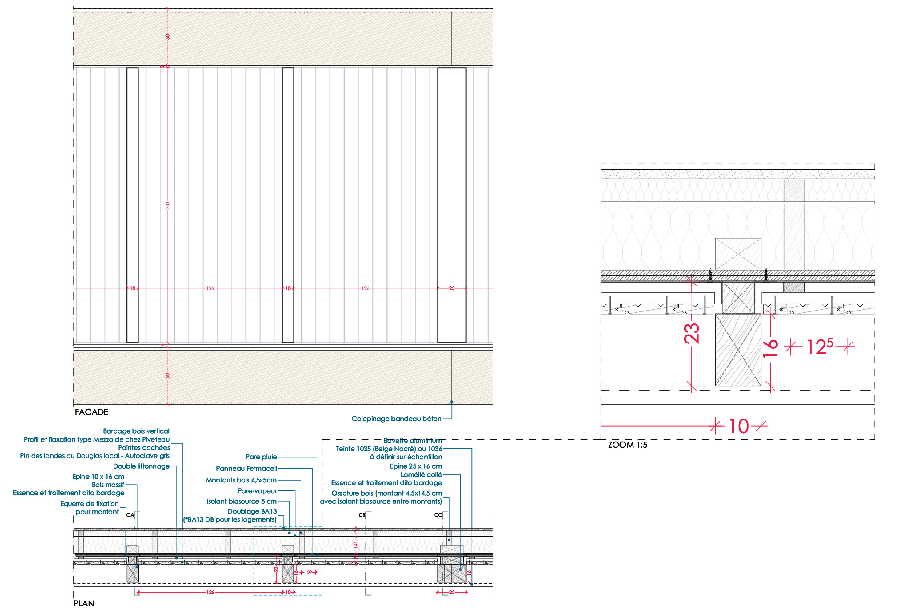 Descriptif technique : La structure de la façade en bois est constituée de sapin provenant des forêts des Pyrénées-Atlantiques, tandis que le revêtement en bois est en Douglas, 100% français, provenant de la région Auvergne Rhône Alpes. Les menuiseries sont en Pin Sylvestre de Corrèze. Le bois provient donc de forêts situées à moins de 450 km du site.