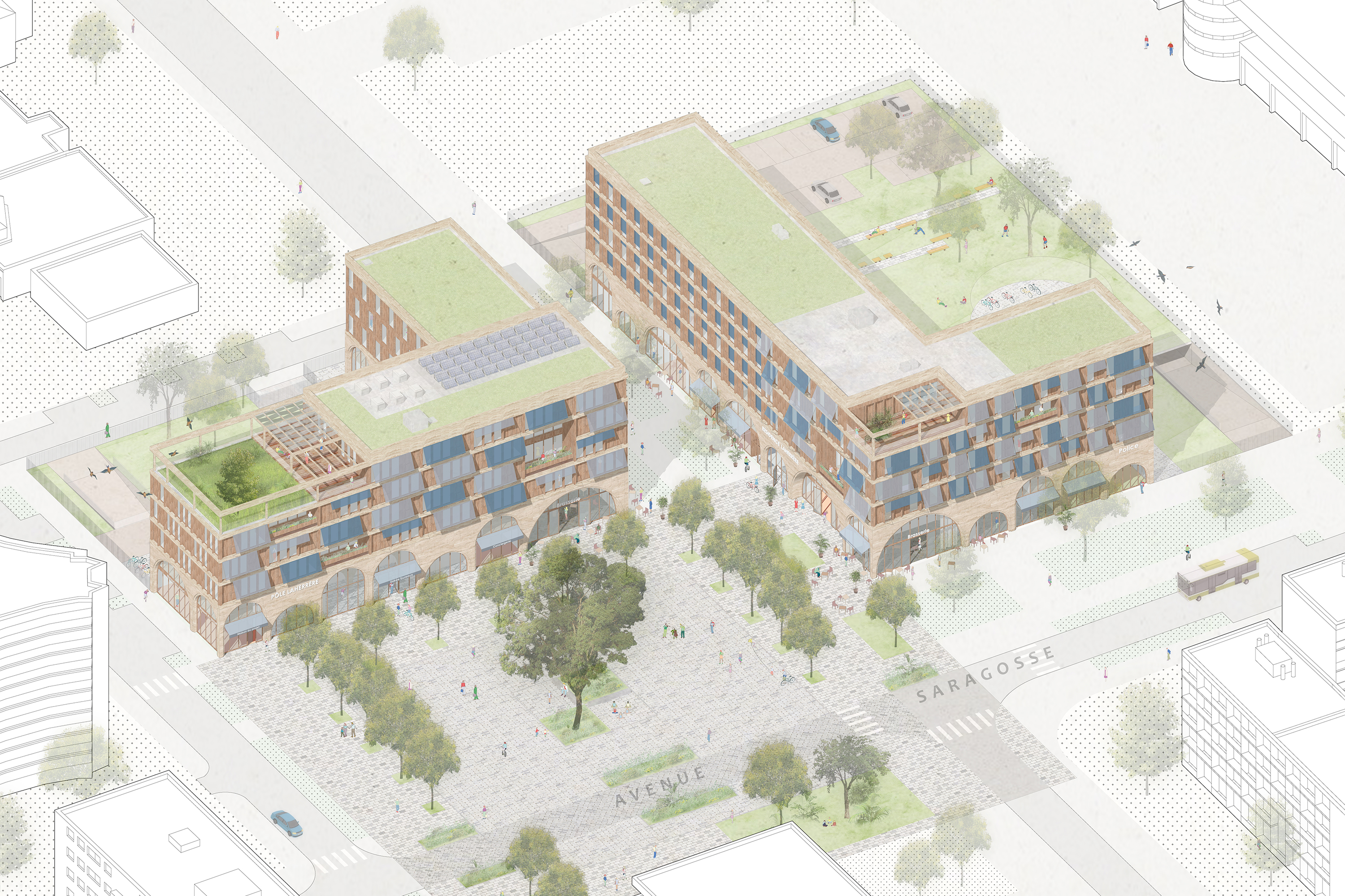 Au centre du quartier Saragosse, la place est encadrée et rythmée par deux bâtiments dotés de grandes arches à deux niveaux. Les façades des étages sont allégées grâce à l'utilisation de murs à ossature bois, recouverts de bardage en bois. Des stores extérieurs et des épines apportent une animation et protègent les bureaux du soleil.