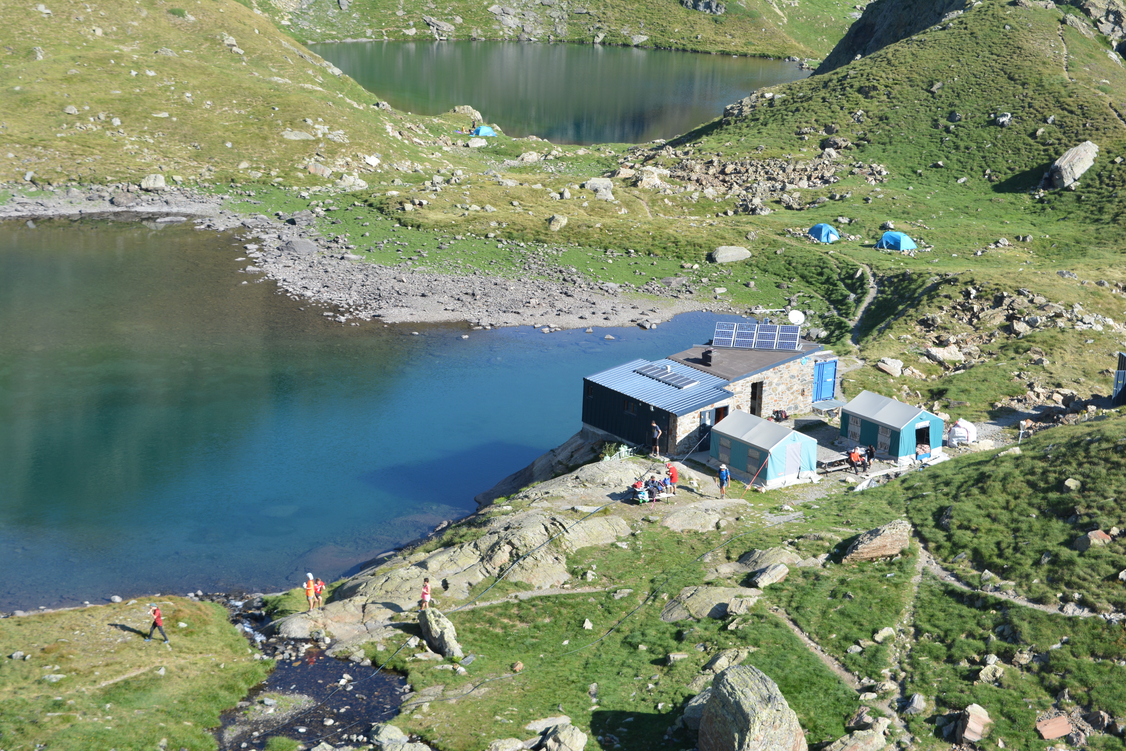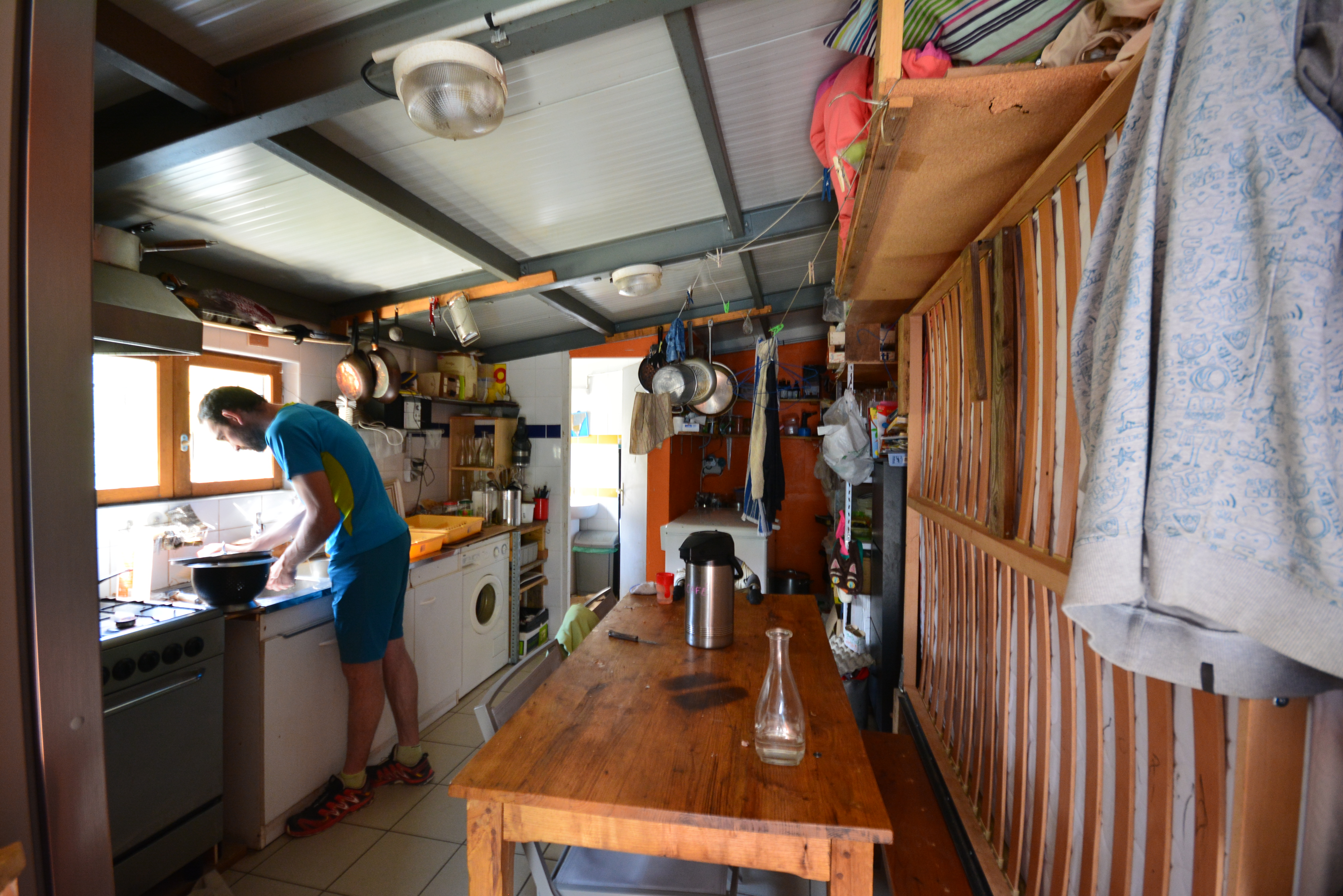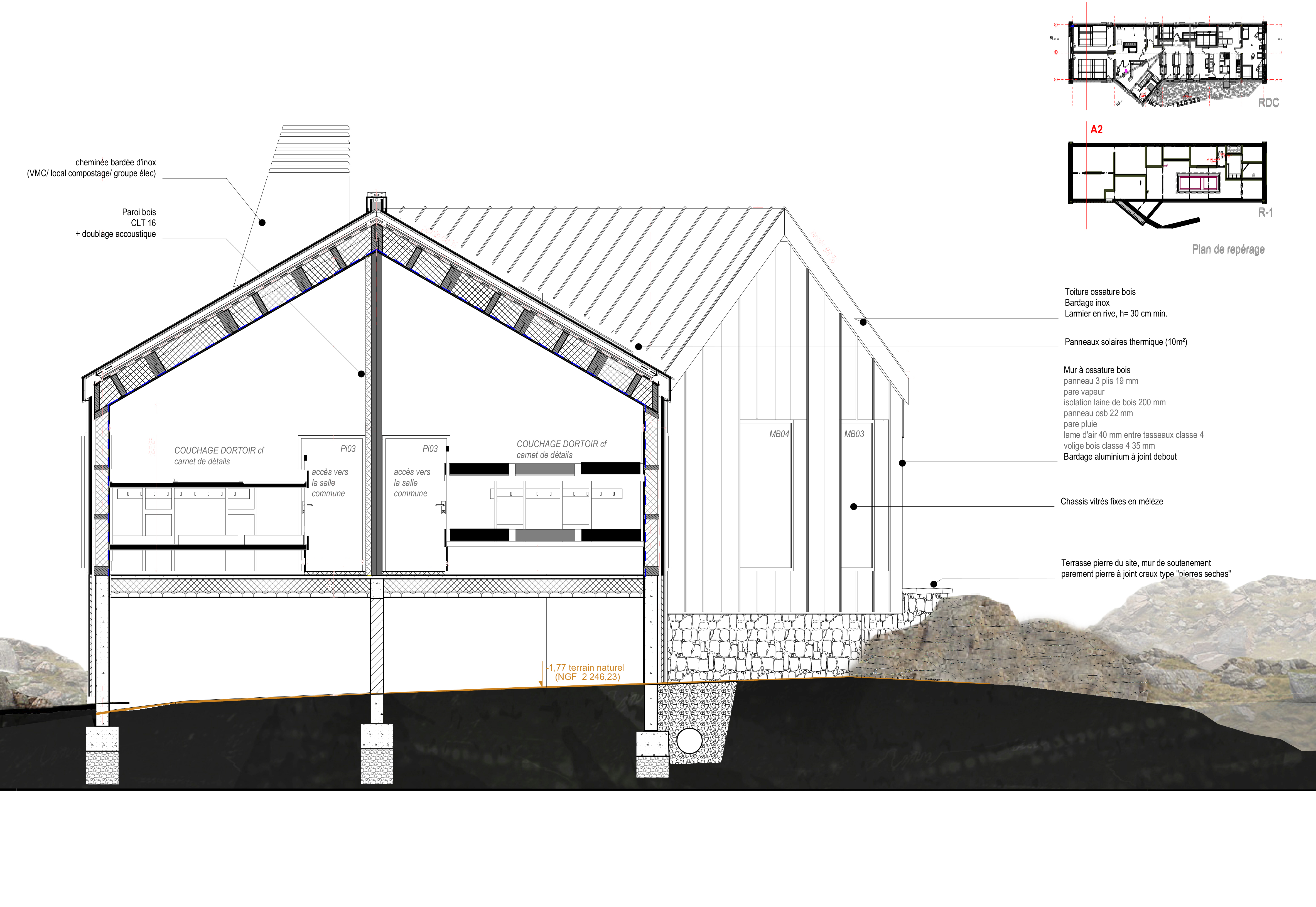 Approche environnementale : L’objectif est de réduire les impacts sur le site et ceux de la construction. La conception intérieure se base sur une « sobriété » de surface avec une salle commune comme cœur du refuge qui permet de supprimer la quasi-totalité des surfaces de circulation. Le bois des revêtements intérieurs, des cloisons et du mobilier est local (Occitanie - établissements Piveteau). Le bâtiment est entièrement autonome avec un besoin limité à 8.93kWh/j : énergie par panneaux photovoltaïques, ECS par panneaux solaires et chauffage par chaudière à granulés avec appoint poêle à bûches.