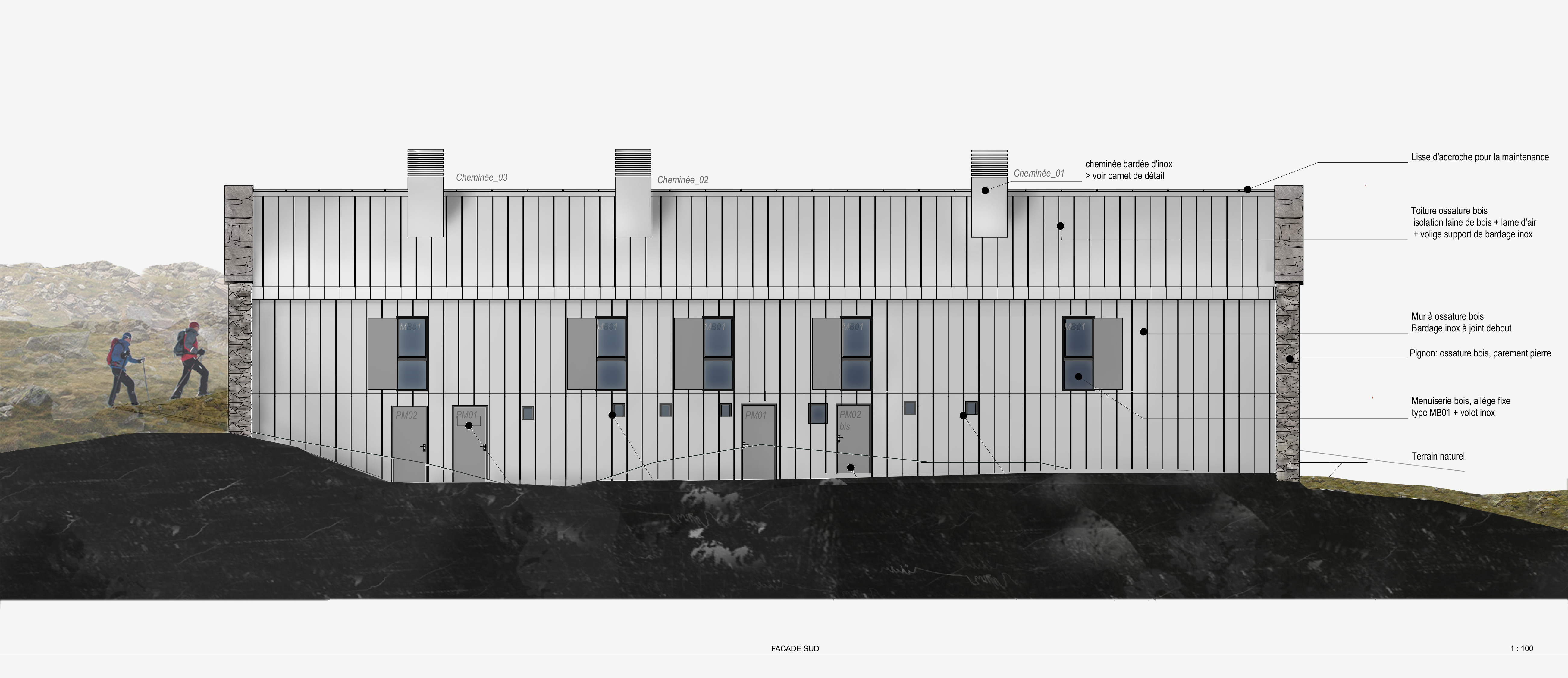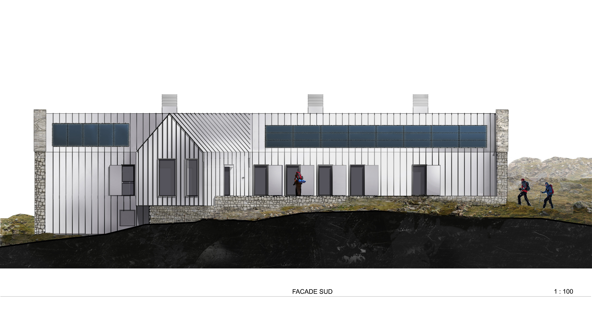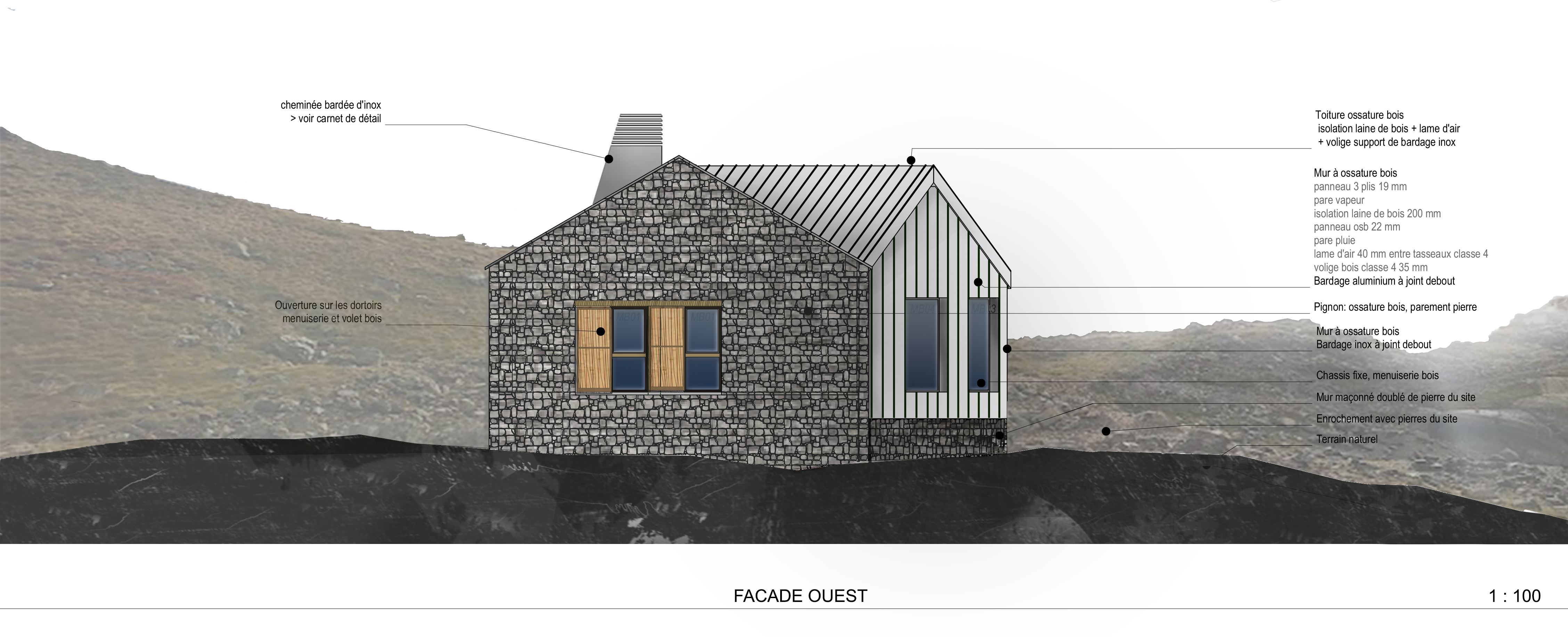 Ce projet de reconstruction renoue avec ses origines. Le refuge, simple abri au service du.de la montagnard.e s’inspire des codes architecturaux des granges du Luchonnais : les deux murs pignons bâtis à partir du schiste du site protègent des intempéries le corps compact du bâtiment réalisé en bois et revêtu d’inox. Les espaces proposés privilégient les programmes et la vie des montagnards et du gardien. L’aménagement intérieur est pensé en harmonie avec le paysage de la montagne. Le bois y est omniprésent : décliné sous forme de panneaux contrecollés pour la structure et le mobilier.