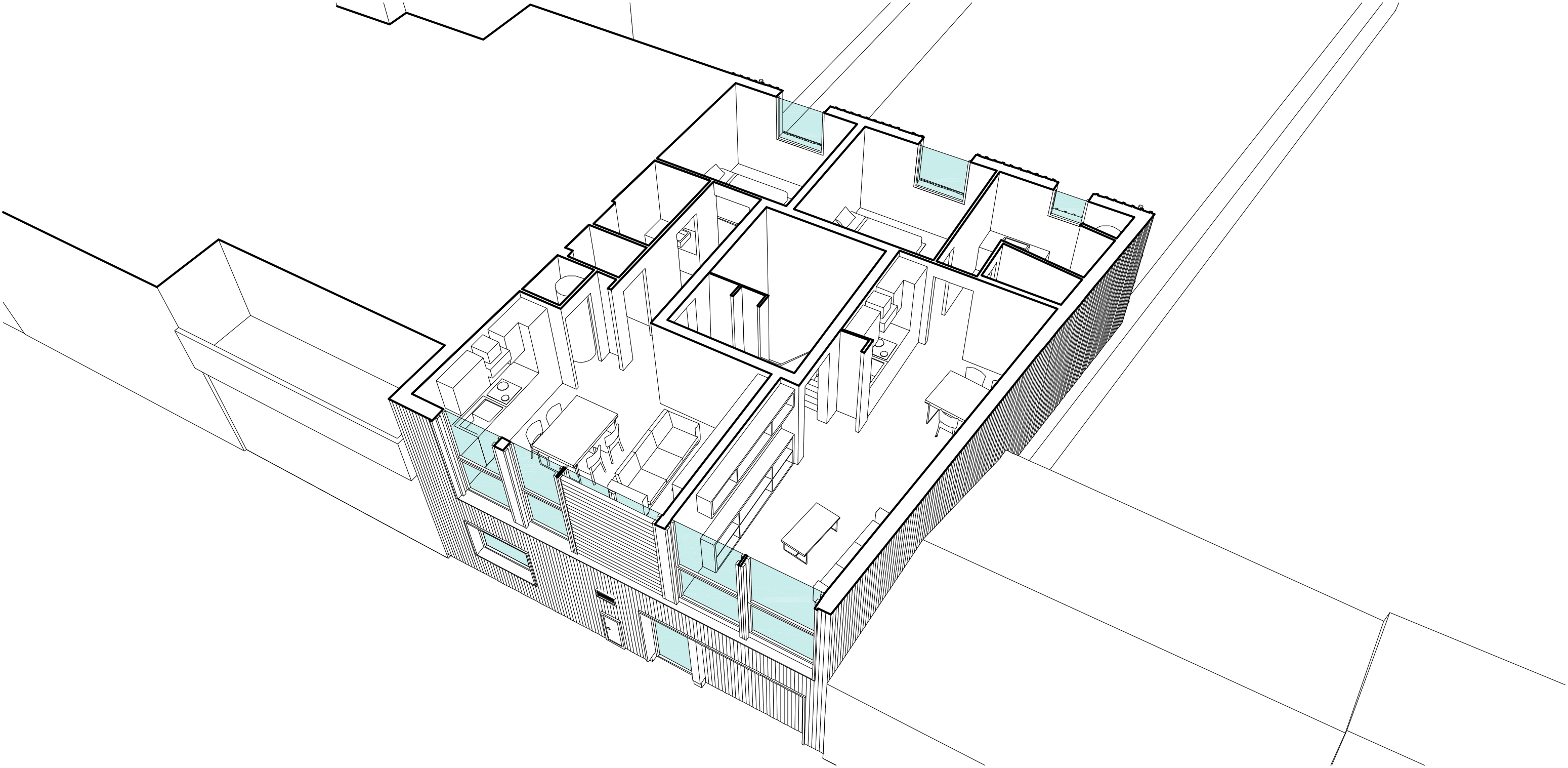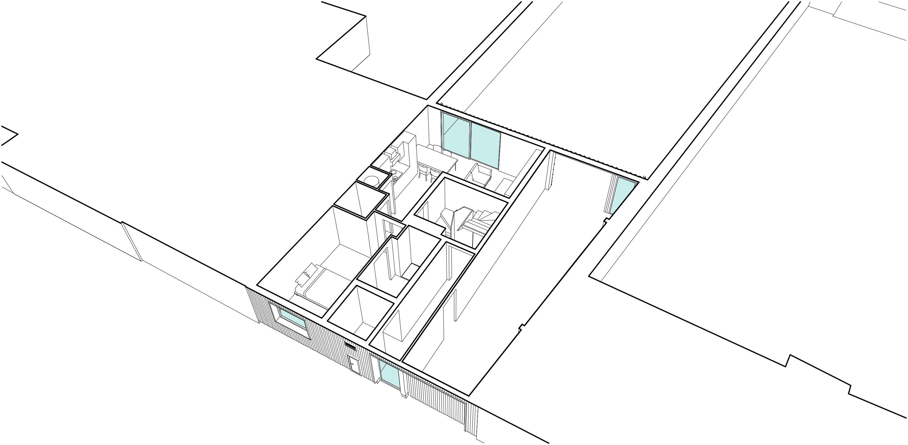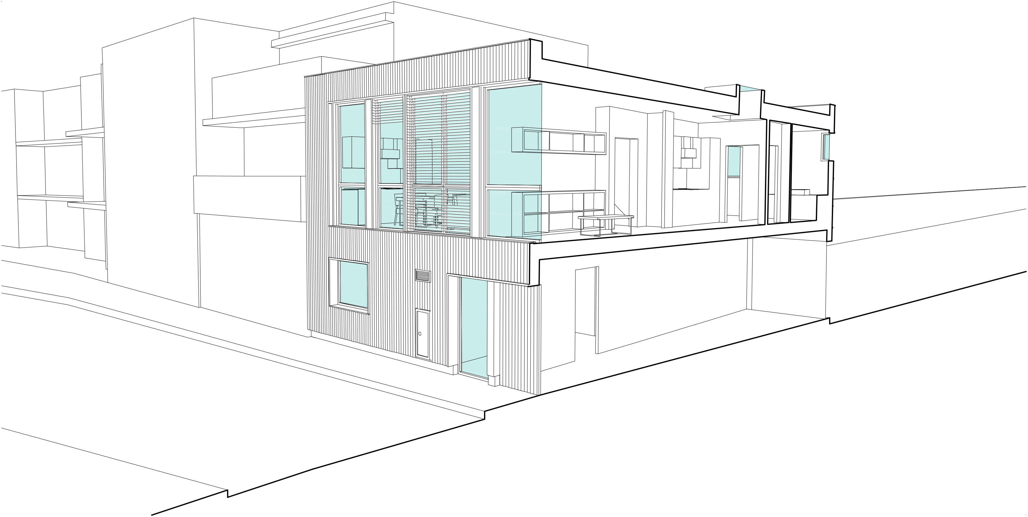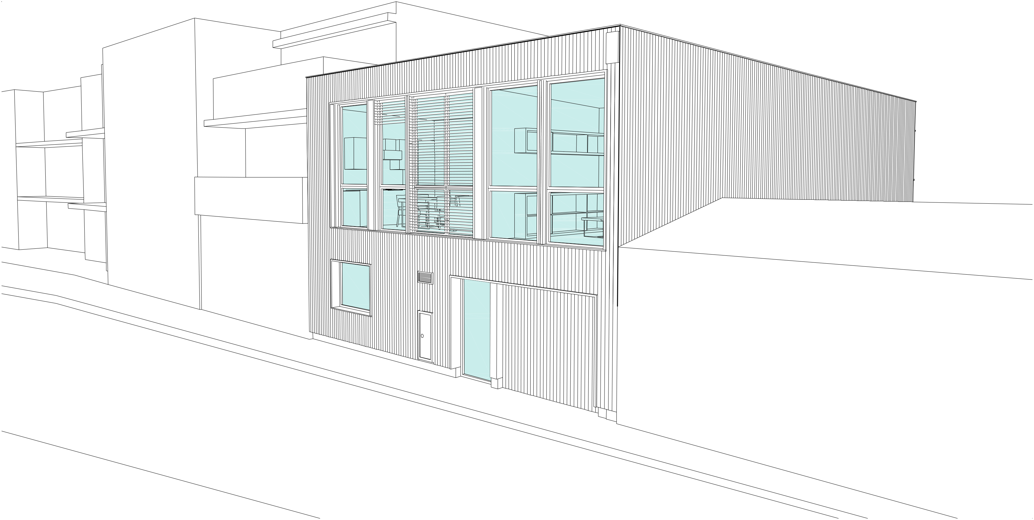 Le projet s'inscrit sur une parcelle traversante en bordure d'un des boulevards de ceinture, une maison dite "nantaise" occupée par les maîtres d'ouvrages. Le terrain d'assise du projet se situe ainsi sur la limite opposée. C'est un ensemble de logements de type T1bis en R+1, le premier s'inscrit en rez-de-chaussée, les deux autres à l'étage. L'étroit terrain génère des logements étirés reprenant le thème de la faille. Le bardage sur rue en tôle petite onde crée des variations de teinte suivant la course du soleil. Le double tasseautage du bardage bois accompagne le rythme des ouvertures.