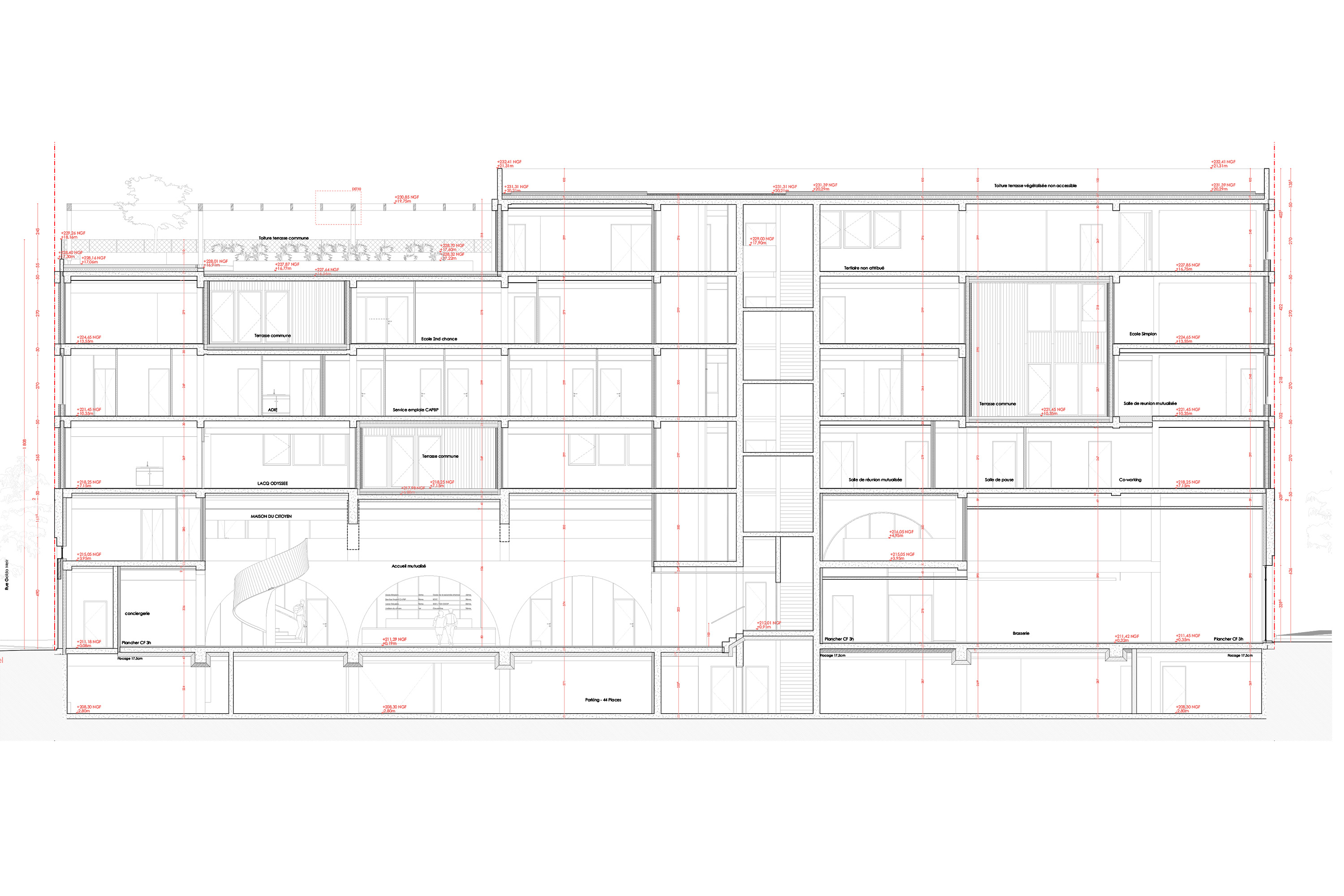 Descriptif technique : La structure de la façade en bois est constituée de sapin provenant des forêts des Pyrénées-Atlantiques, tandis que le revêtement en bois est en Douglas, 100% français, provenant de la région Auvergne Rhône Alpes. Les menuiseries sont en Pin Sylvestre de Corrèze. Le bois provient donc de forêts situées à moins de 450 km du site.