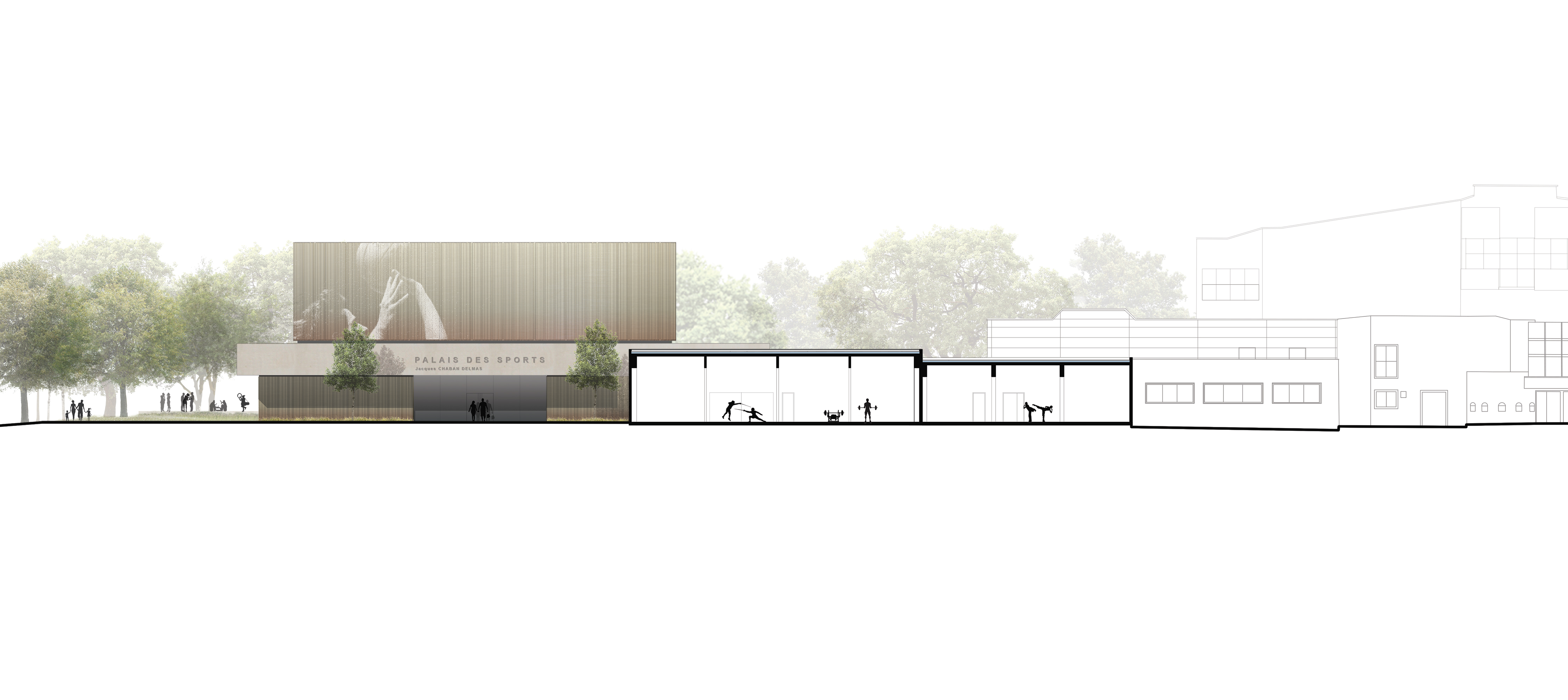 Descriptif technique : L’implantation des volumes d’extension du Palais des Sports, construit il y a 27 ans, prend soin de limiter au maximum l’image d’un « rajout » supplémentaire à l’architecture morcelée du complexe sportif. Le projet de la Halle omnisport prévoit la création de deux niveaux. Un niveau hall d’entrée à 72.50 NGF permettant de se raccorder de plain-pied aux circulations du Palais des Sports et au terrain naturel, et un second à 74.00 NGF mettant à niveau la nouvelle salle et la salle d’échauffement existante via une circulation directe accessible aux PMR