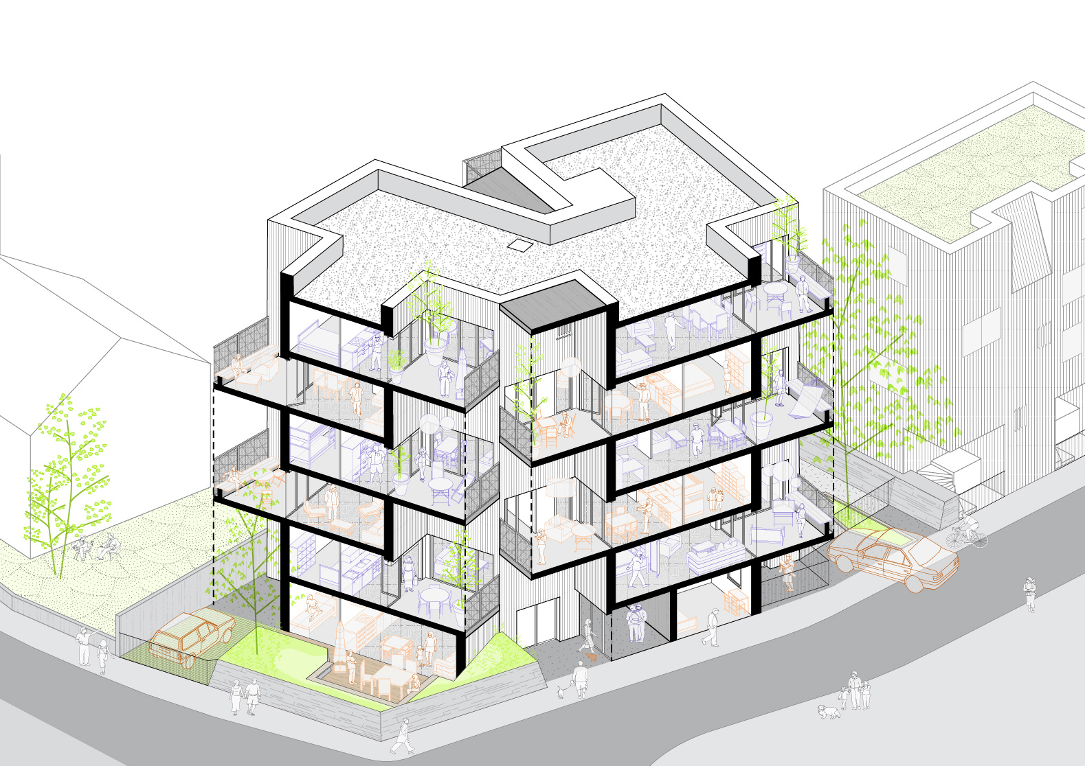 Descriptif technique : Construction de deux immeubles de 21 logements collectifs en R+5 et R+3. Structure béton armé sur fondations superficielles. Isolation en murs manteaux avec revêtement en bardage bois blanchi vertical. Système d'isolation par l'extérieur type ITE. Stationnement aérien extérieur et en boxes. Aménagement d'un jardin collectif et de mobilier extérieur bois.