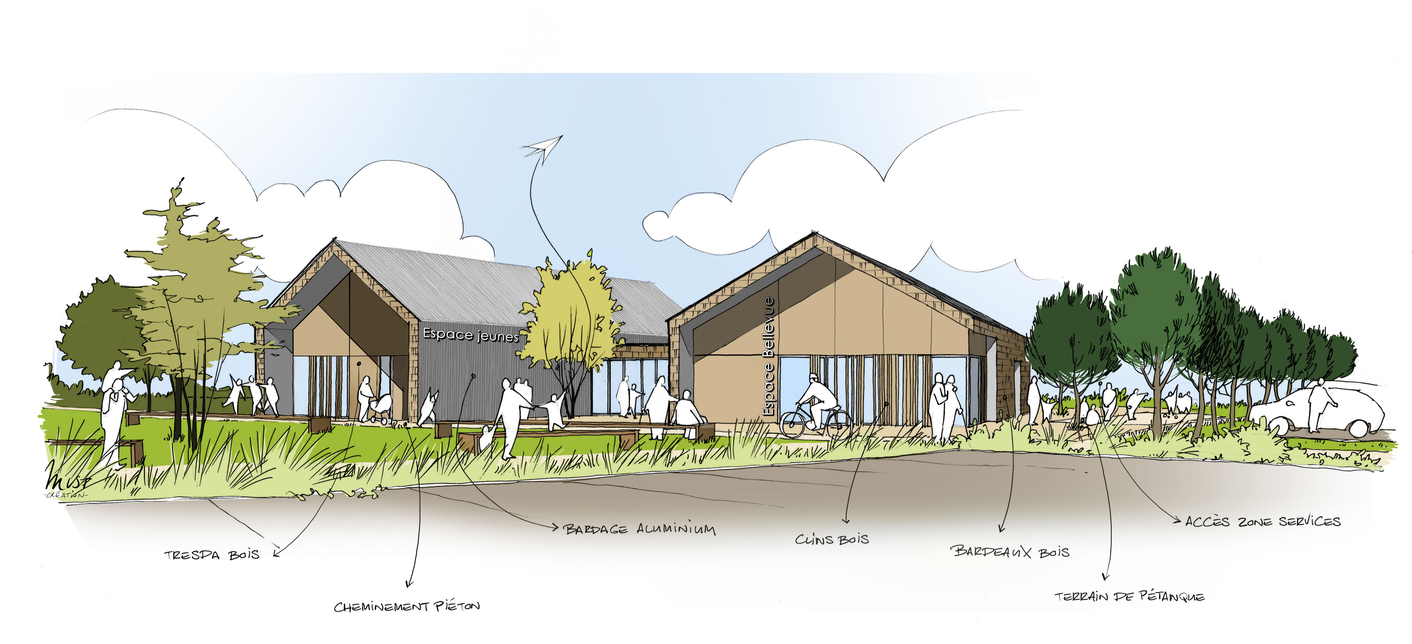 L'espace intergénérationnel de Mûrs Erigné prend place face à la Mairie de la Commune. Les espaces jeunes (foyer des jeunes) et salle des aînés (Espace Bellevue), se déploient autour d'un hall largement vitré permettant une transparence des lieux. Les deux halles partagent, outre le hall, les espaces servant, sanitaires, cuisine et locaux techniques. L'ensemble a été conçu en dialogue avec le parc paysager alentours, des percées visuelles et de larges ouvertures suivant la course du soleil, permettent de bénéficier des apports solaires, en étant préservé en été par les débords de toiture.