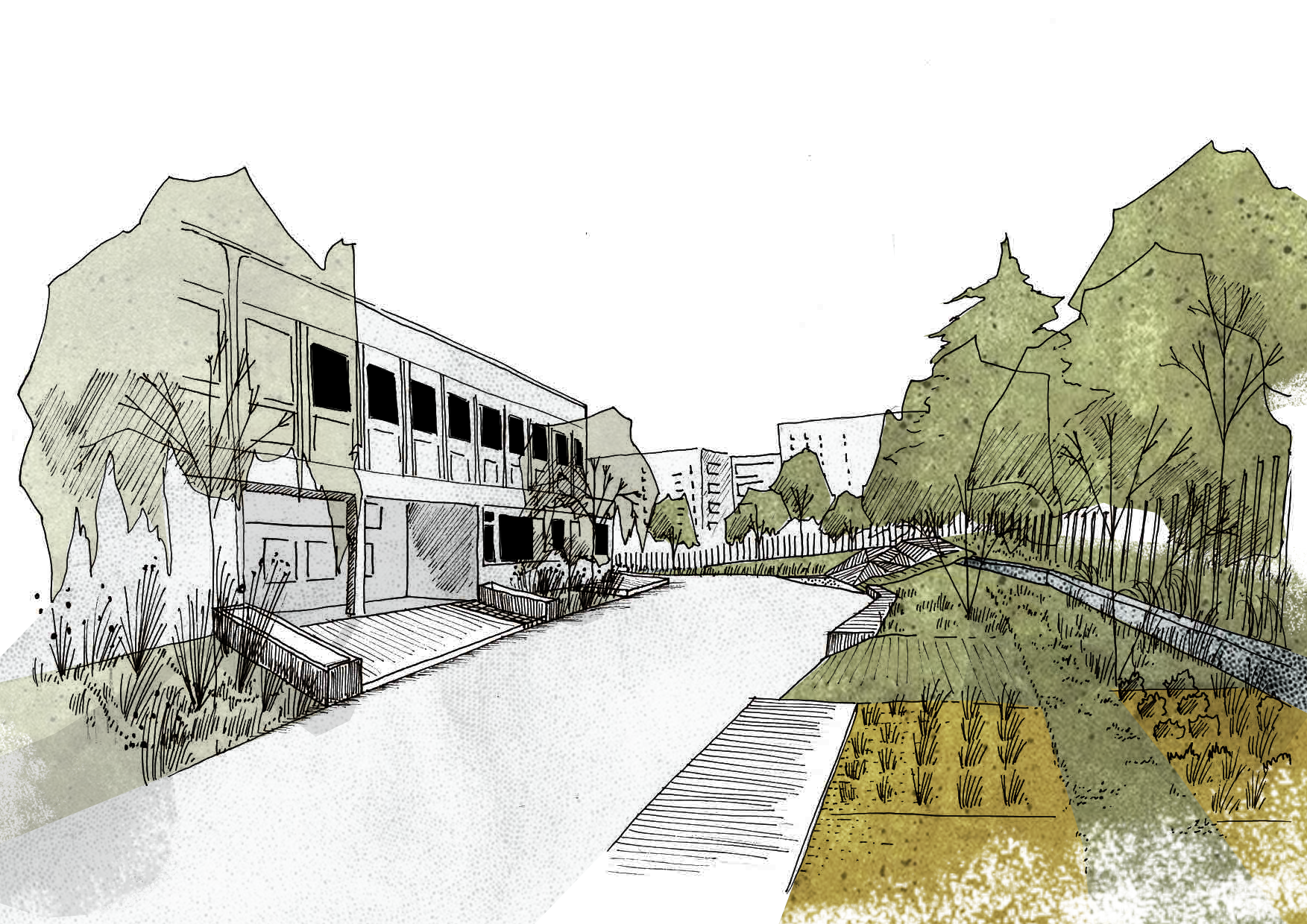 L'objectif du projet était de déconnecter les eaux pluviales des réseaux publics. De grandes noues paysagères de rétention et de filtration des eaux ont donc été mise en place, elles créent des bandes de fraîcheur au devant des fenêtres. La terre évacuée des noues a été utilisée pour créer des terrasses et des jardins potagers, qui s'articulent avec des gradins extérieurs bois ombragés qui offre un lieu de pédagogie extérieur. Une gestion différenciée et du bois brut, dont des troncs du site, ont été mis en place, pour limiter l'entretien. Des essences comestibles ont été plantées.