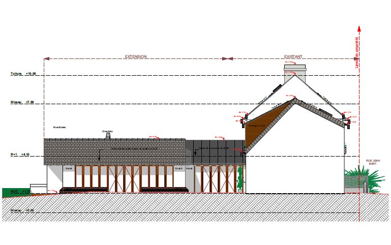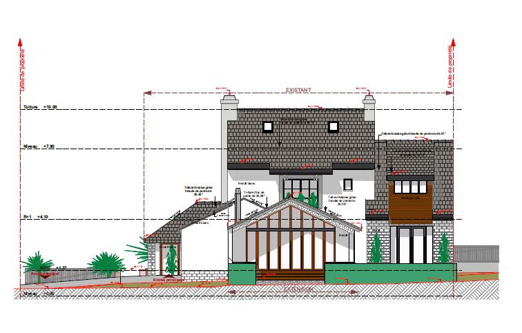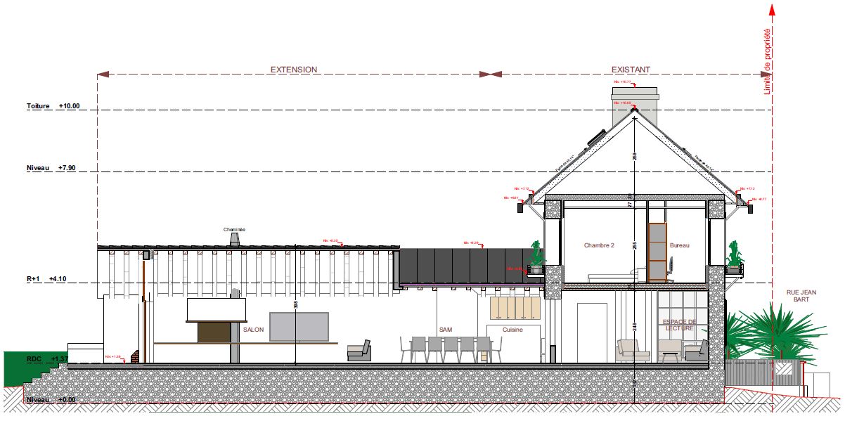 Le projet consiste à créer une extension sur une habitation traditionnelle. Le projet revoie la distribution intérieure des pièces et s'accole à l'habitation en créant 75 M2 supplémentaires pour recevoir la cuisine salon salle à manger tournée vers la mer. La couverture de la toiture de l'extension est en zinc et en ardoises. De grandes ouvertures sont créées vers le jardin . La façade est recouverte d'un bardage douglas rouge falun. La totalité des menuiseries posées reste dans les teintes grise naturel du site.