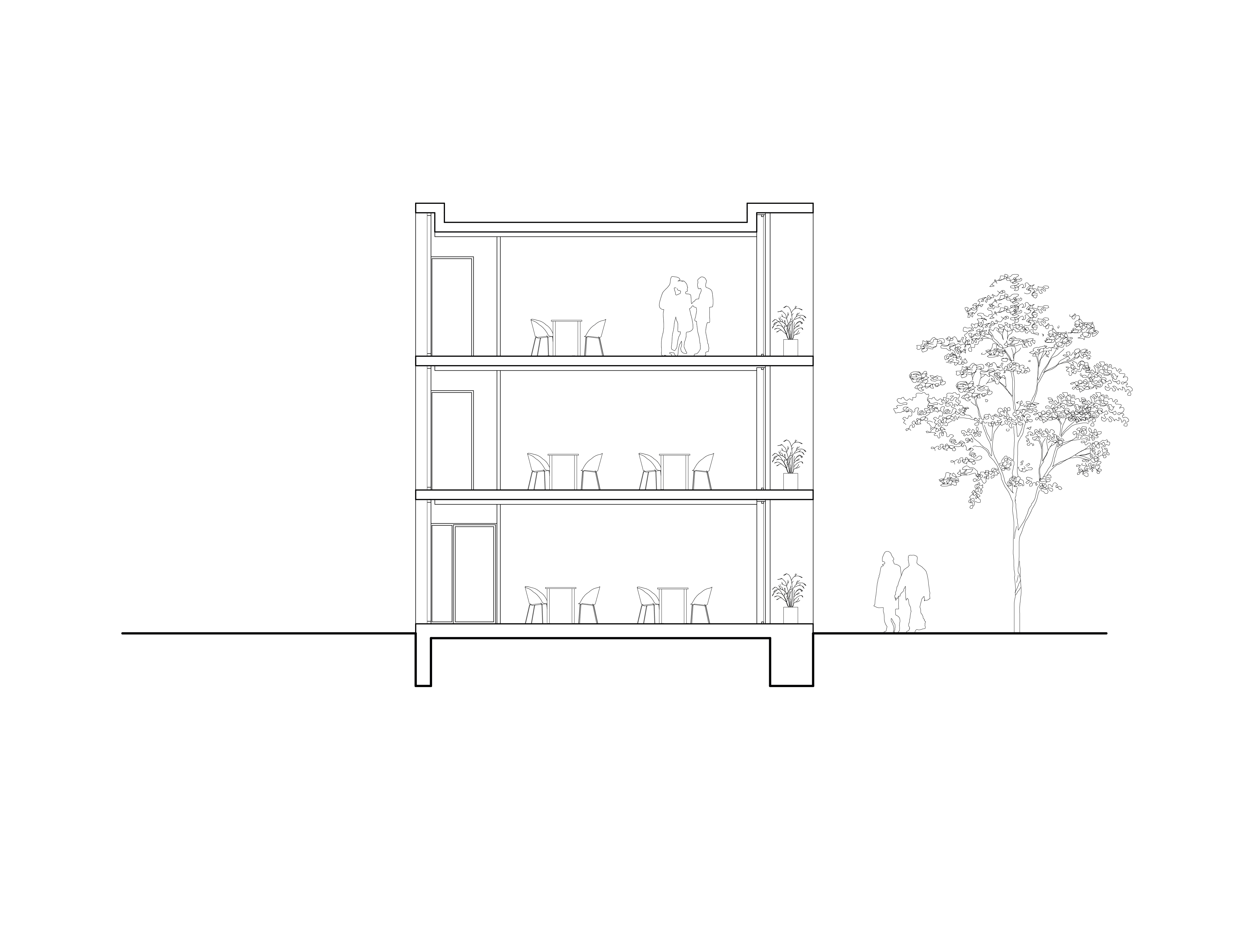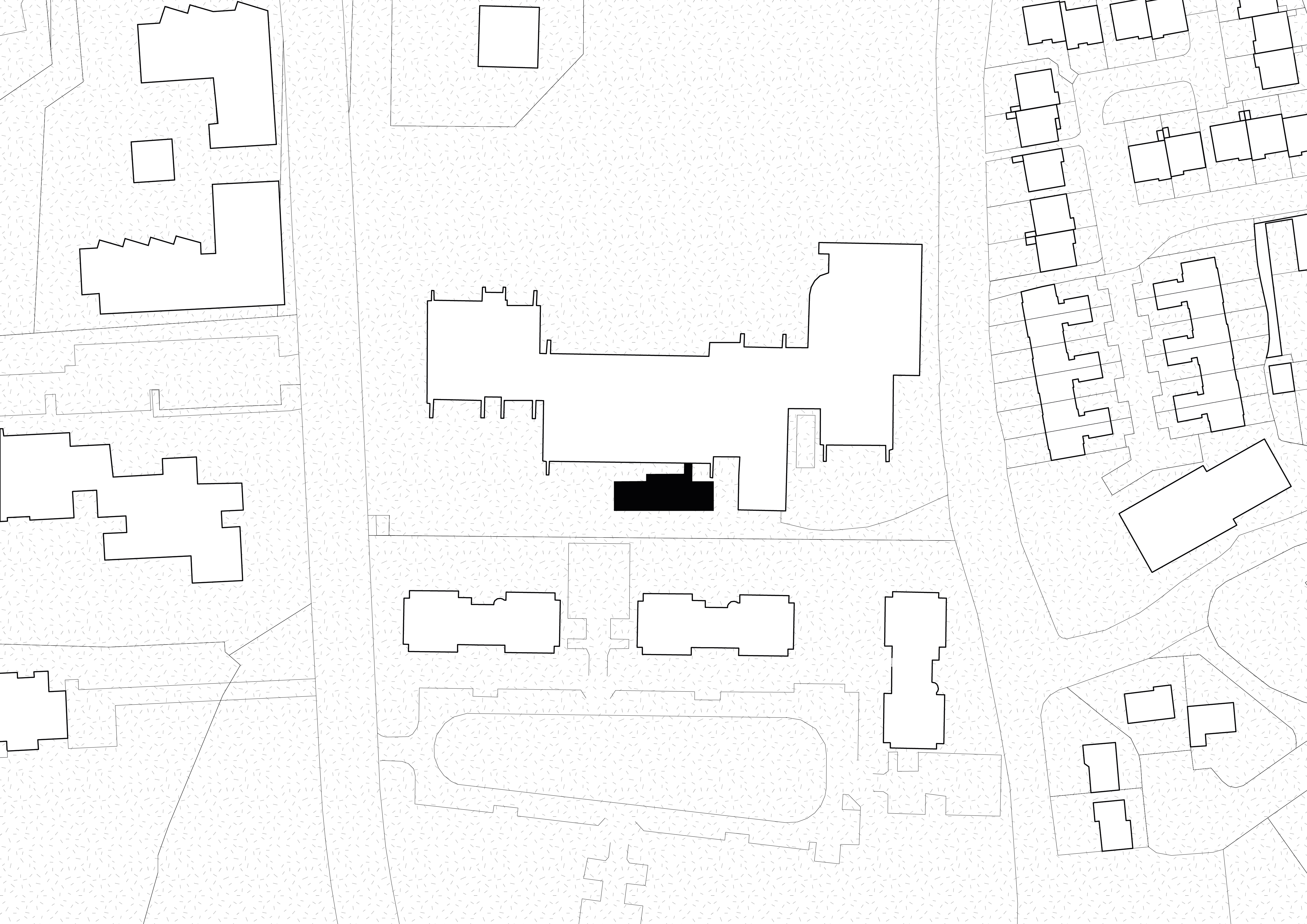 L’extension réalisée est détachée de l’existant, uniquement reliée par une passerelle vitrée. Le nouveau bâtiment s’élève sur trois niveaux, développant ainsi une grande surface de plancher tout en préservant un maximum de terrain libre au sol. Cela permet la création d’un espace planté entre l’existant et l’entité bâti. Notre réflexion nous amène à répondre à un programme spécifique qui puisse évoluer dans le temps. Nous avons créé un plateau libre, sur une trame constructive en poteaux et poutres bois.
