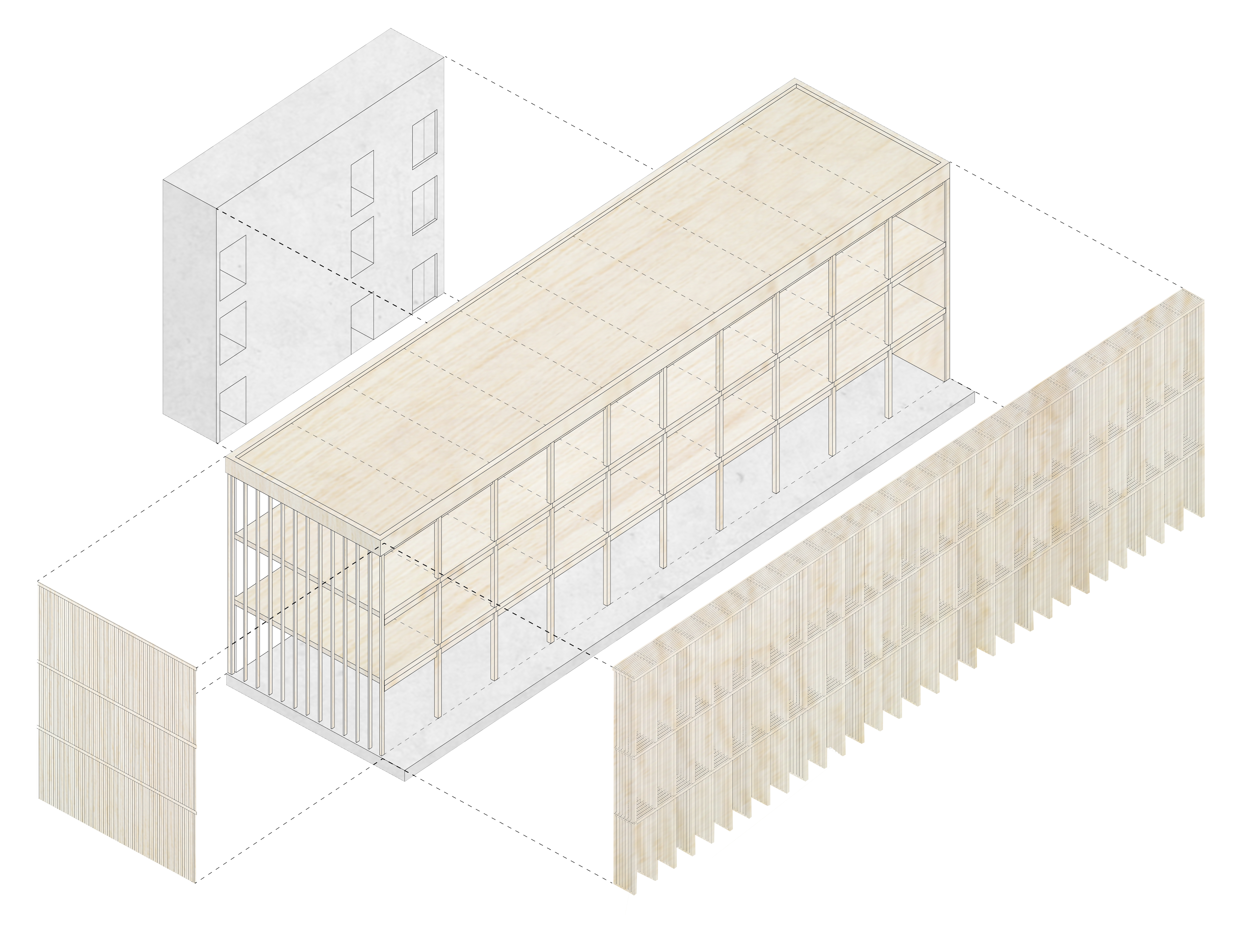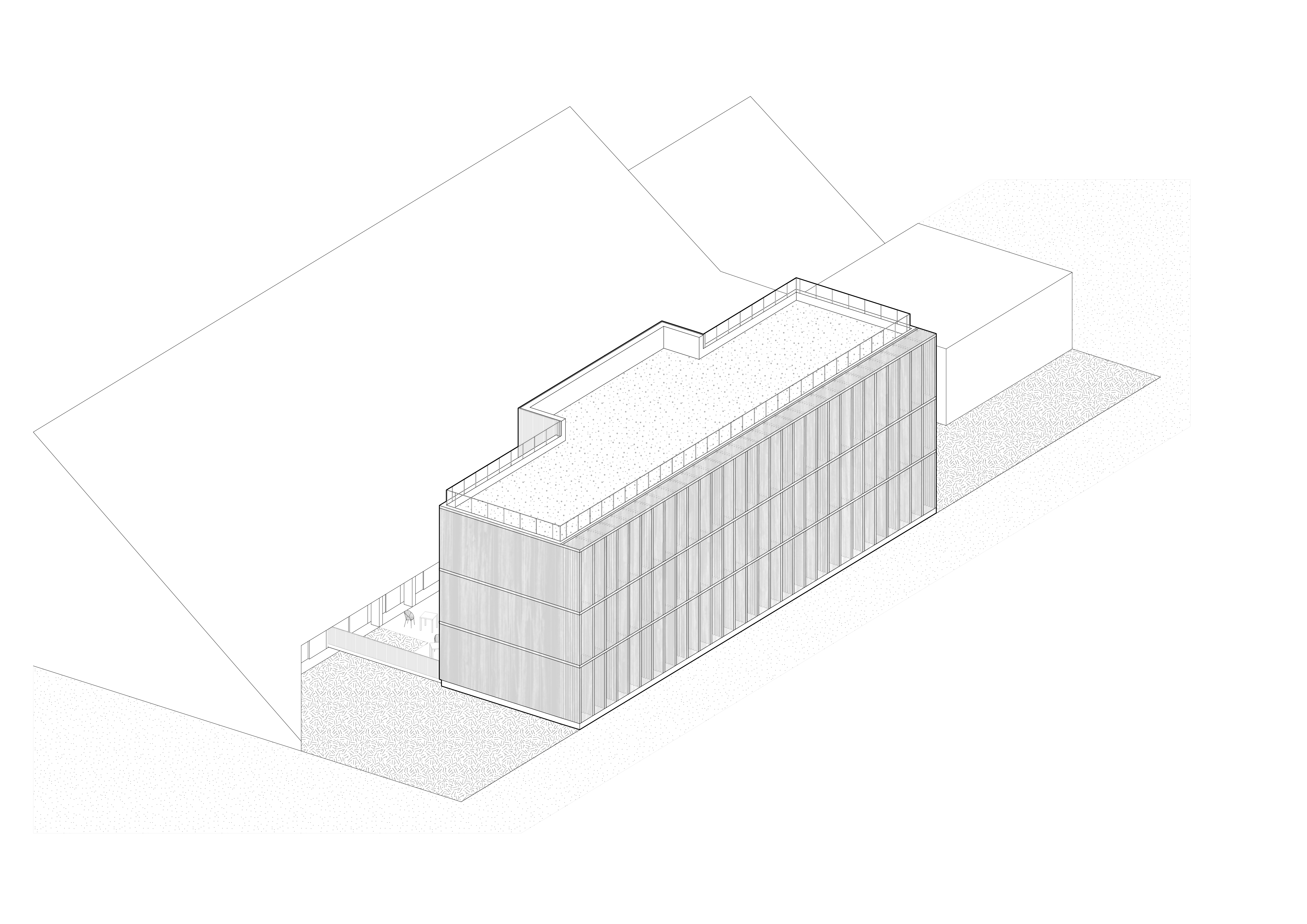 Descriptif technique : Concernant la construction, l’ensemble du projet est préfabriqué ; tant le noyau central en béton que le système poteau poutres bois et planchers en CLT. L’ensemble des matériaux sont laissés apparents pour affirmer les modes constructifs et les différents traitements de matérialité. Les brise-soleils et le bardage sont en bois pré-vieilli, avec des lames de cinq centimètres de large, démontrant une finesse dans le traitement de la façade. Ces derniers changent de tonalité selon les orientations du soleil, accompagné par le mur-rideau en triple vitrage qui reflète le contexte le jour et laisse voir les planchers en bois une fois le soir venu.