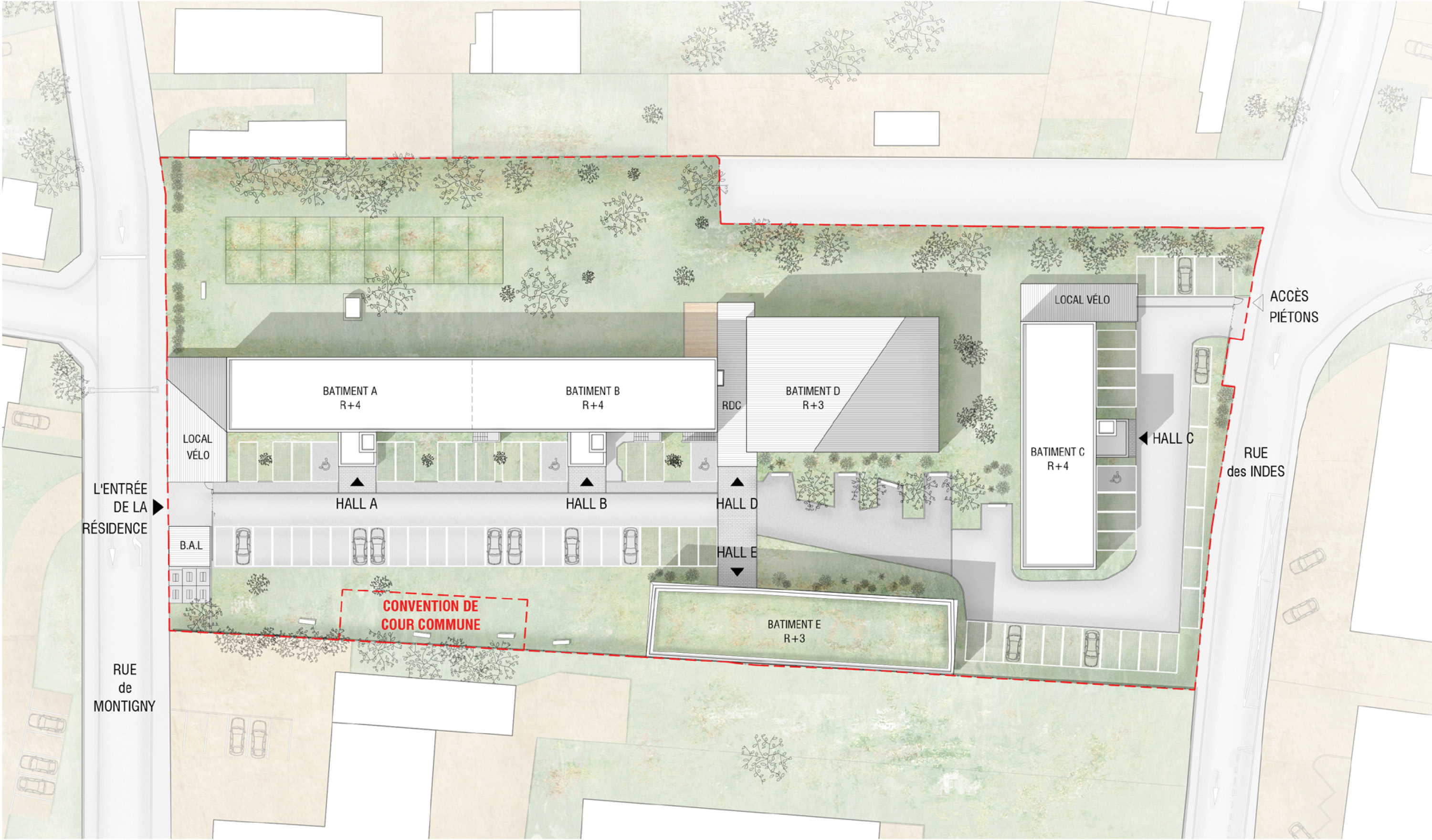 Construction neuve en structure bois de 2 nouveaux bâtiments de 88 logements qui viennent compléter l’offre actuelle de 141 logements. réalisation des aménagements paysagés : jardin, toitures végétalisées, rue piétonne. Le projet s’inscrit au cœur du site pour former une nouvelle centralité avec une place conviviale, des lieux de réunion pour les résidents. Le grand jardin est préservé et mis en valeur.