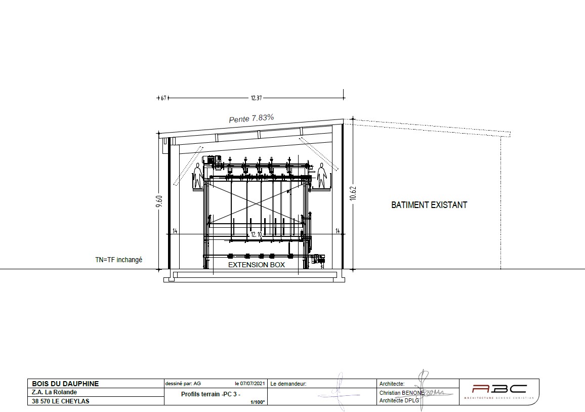 Le projet objet de la présente demande est une extension du bâtiment (parc à grumes) existant. Une nouvelle structure tout en bois vient en continuité du bâtiment existant. Cette extension se compose d'une structure bois en épicéa. D'une portée remarquable et d'une grande hauteur, cette nouvelle halle abrite la ligne de sciage de la scierie.