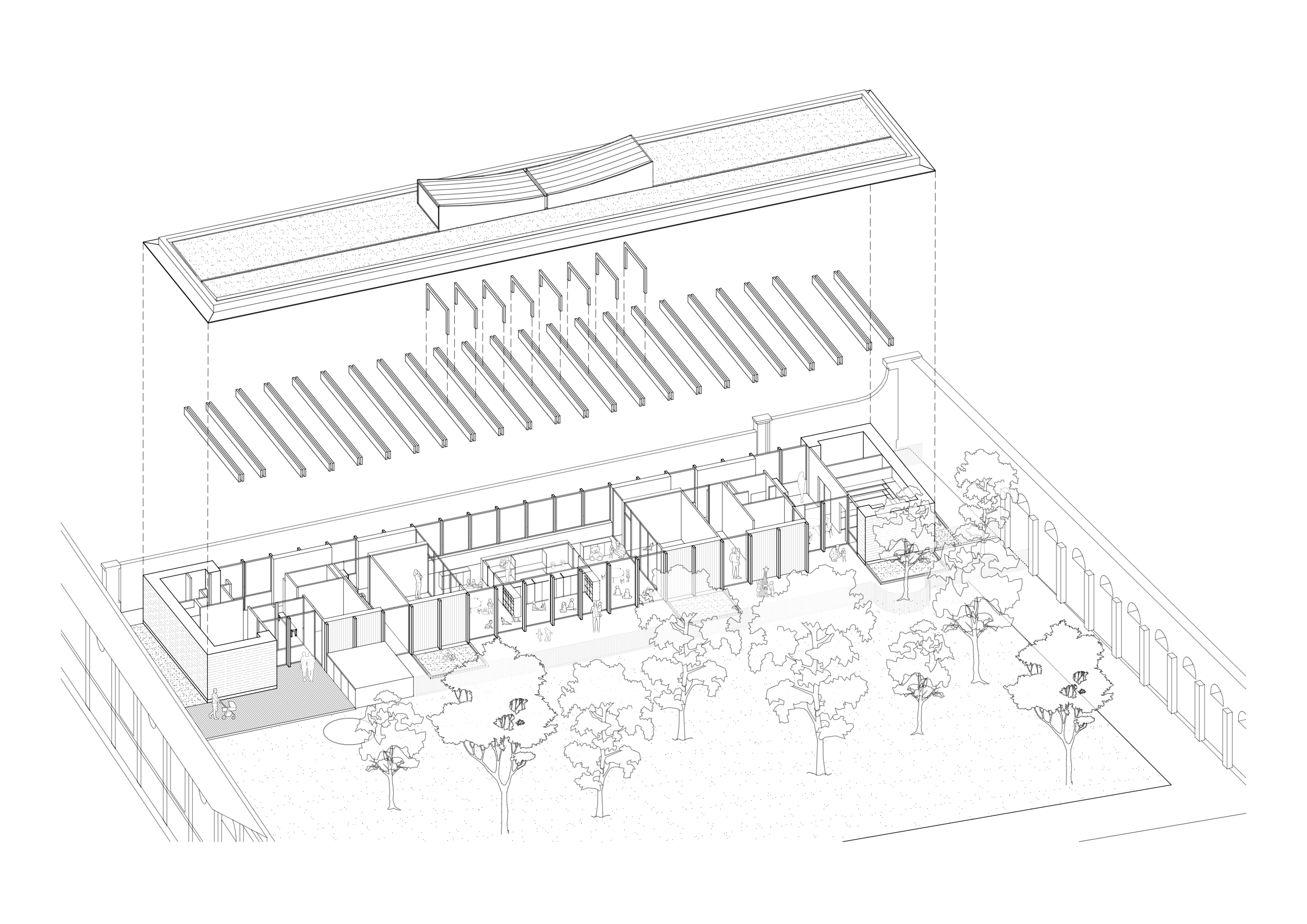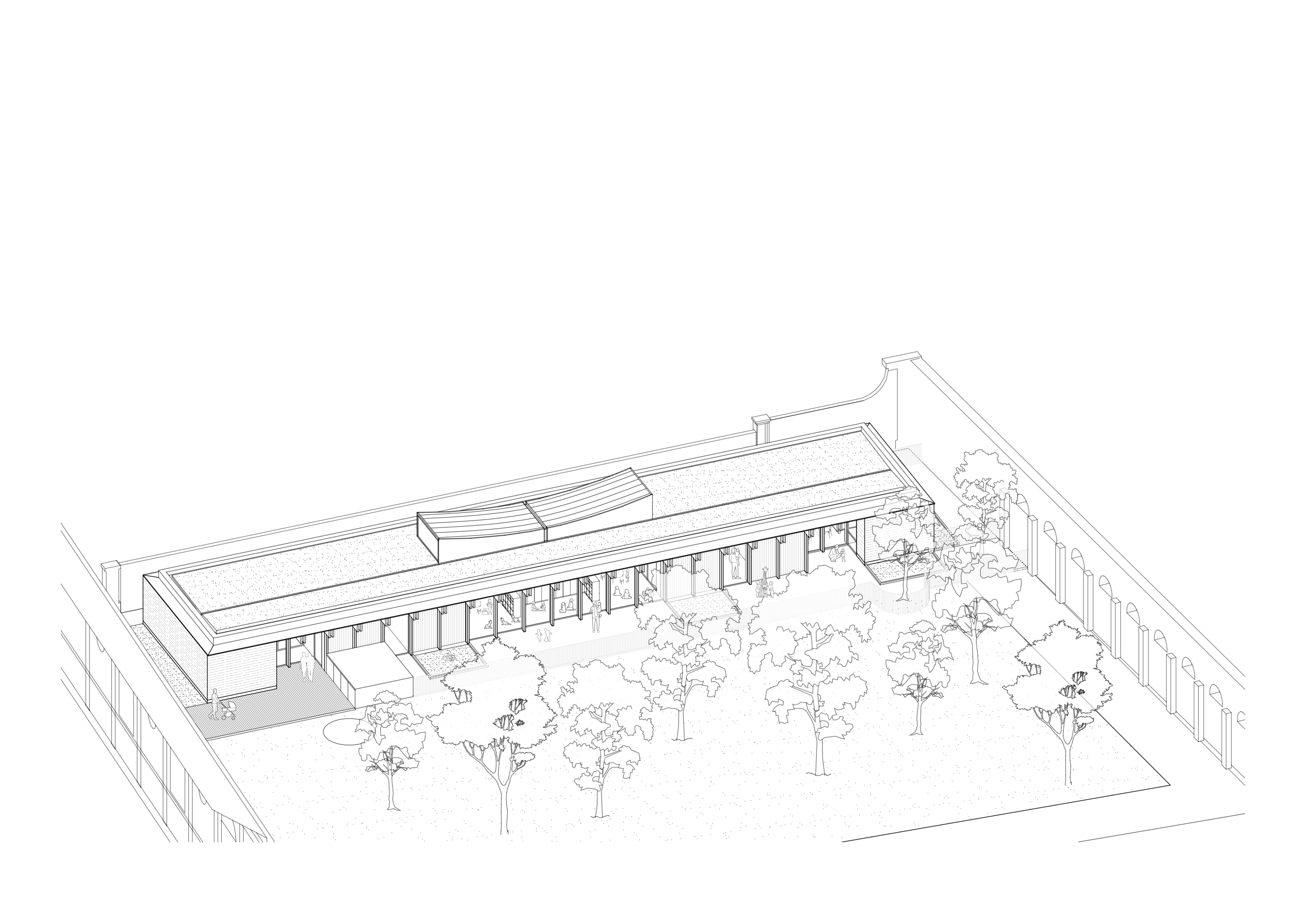 Le projet propose d’implanter le bâtiment de plain-pied au cœur du palais de l’Alma. Le parti pris est alors d'implanter d’un unique volume longitudinal au Sud du terrain. Le volume bâti de la crèche et son espace extérieur s’étirent le long du mur d’enceinte du jardin. Ce dernier devient alors le support du projet, un mur épais que l’on habite et qui s’ouvre vers le jardin. Le lieu étant sensible par sa fonction, il n’offre aucune vue directe depuis l’espace public. Le plan propose des espaces ouverts où à la manière d’un pavillon, un lien se tisse entre l’intérieur et l’extérieur.