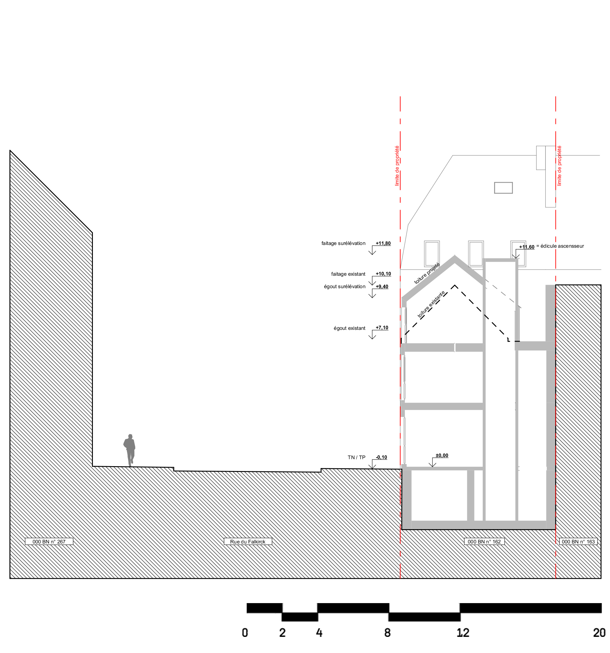 Approche environnementale : L’implantation du projet de surélévation permet : - de limiter l’impact sur l’environnement en densifiant (de lutter contre l’étalement urbain) - de participer à la composition de perspectives urbaines de qualité en lien avec le gabarit des bâtiments voisins - une orientation sud-ouest permettant de capter des apports solaires passifs - d’offrir des vues lointaines pour la nouvelle salle de réunion.