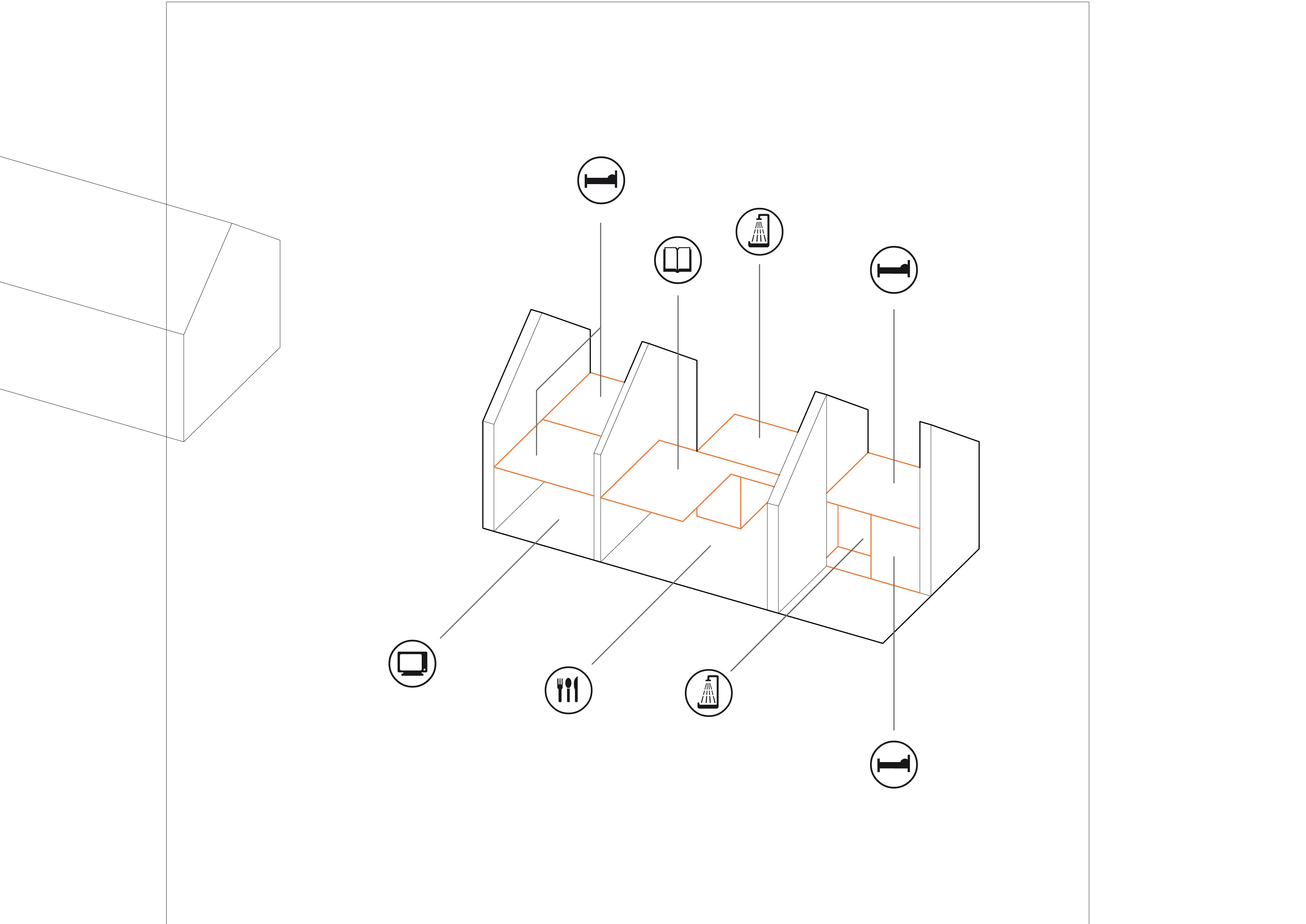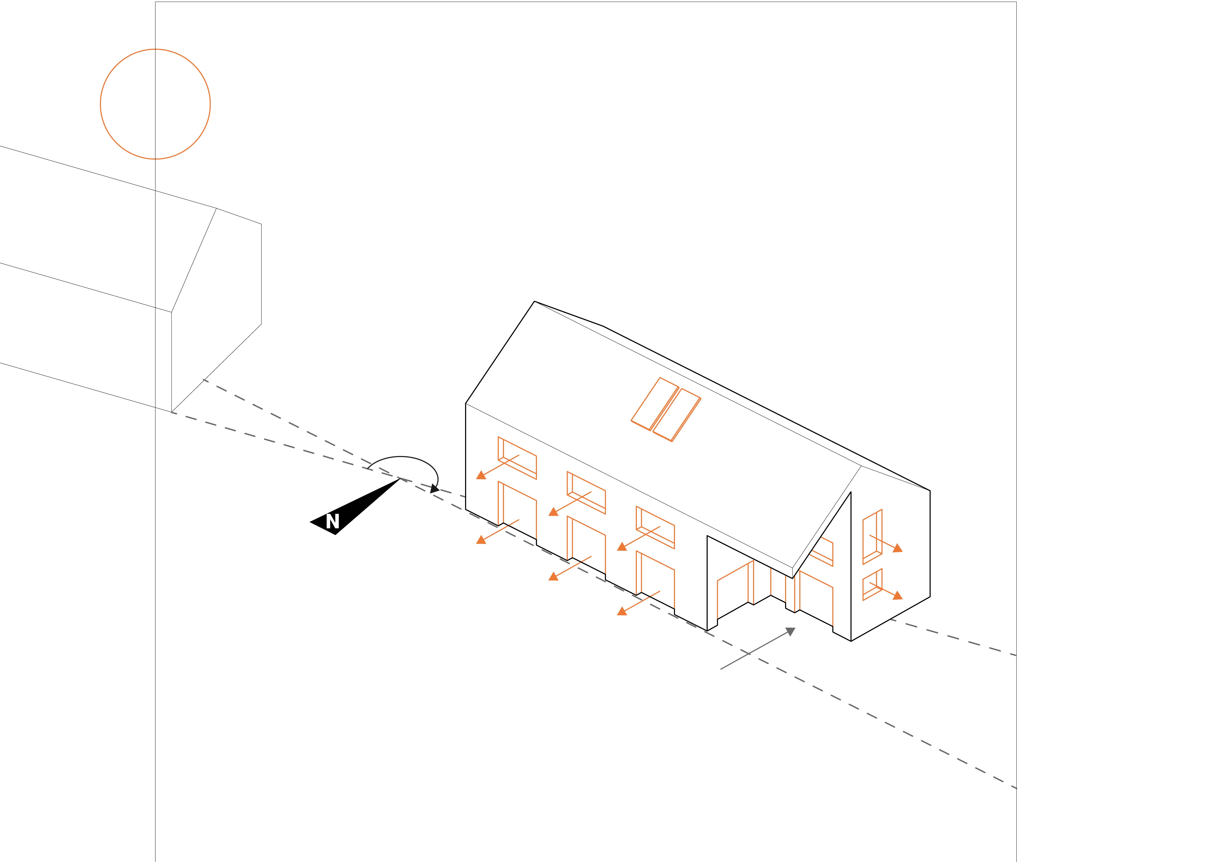 Approche environnementale : La maison est organisée de manière à optimiser les performances thermiques et les apports solaires tout en correspondant au confort et au mode de vie de ses habitants. Elle consiste ainsi d’un salon-séjours en partie centrale donnant sur la terrasse, de deux chambres à l’Est et à l'Ouest et de l’ensembles des pièces d’eau et du local technique au Nord faisant office de tampon pour les parties les plus exposées au froid. Les murs intérieurs remplis de tuf et le poêle confortent l’ensemble en apportant la masse suffisante à la maison et en diffusant la chaleur dans toutes les pièces.